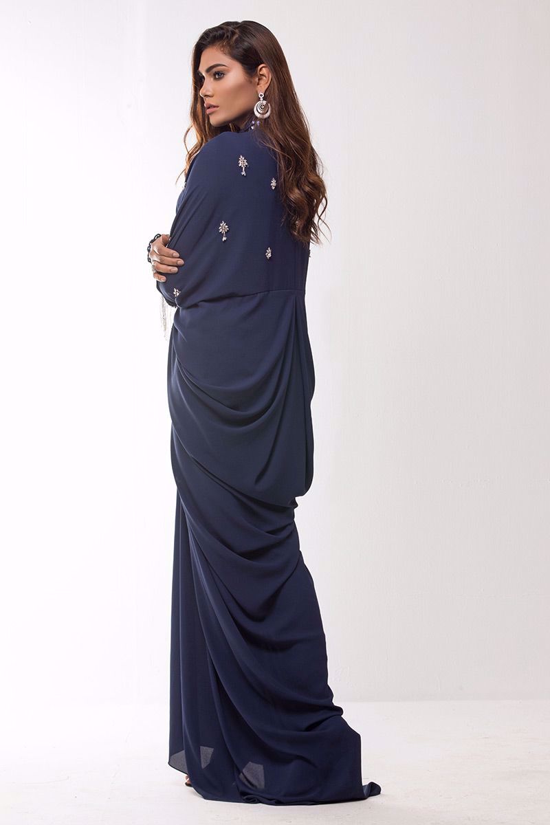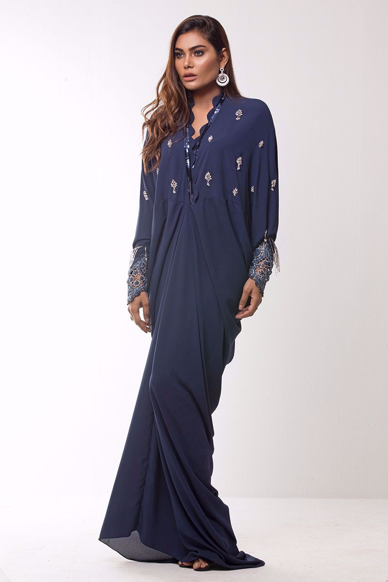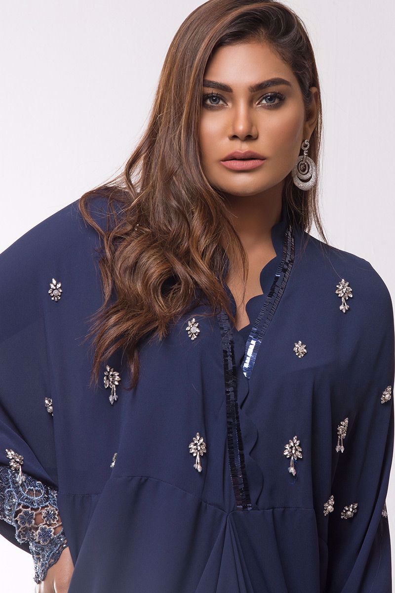 Navy blue double georgette Kaftan hand worked with Stone and cut dana booti.