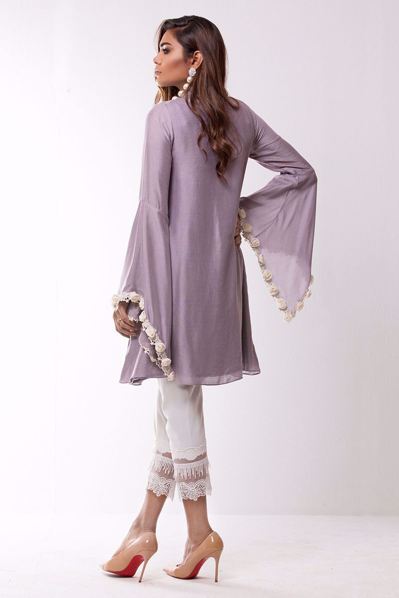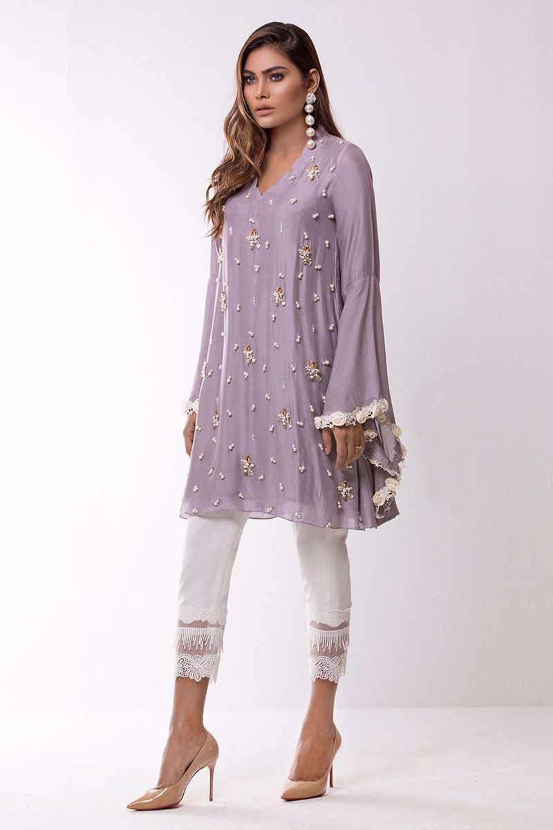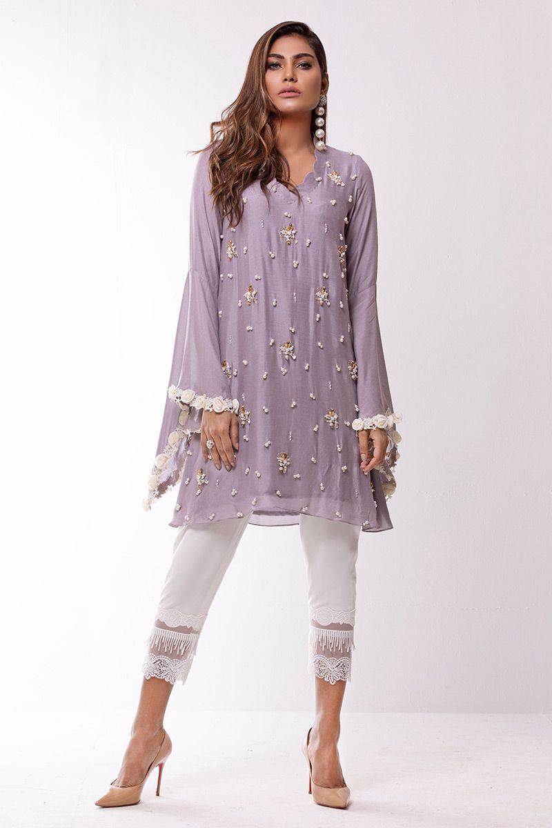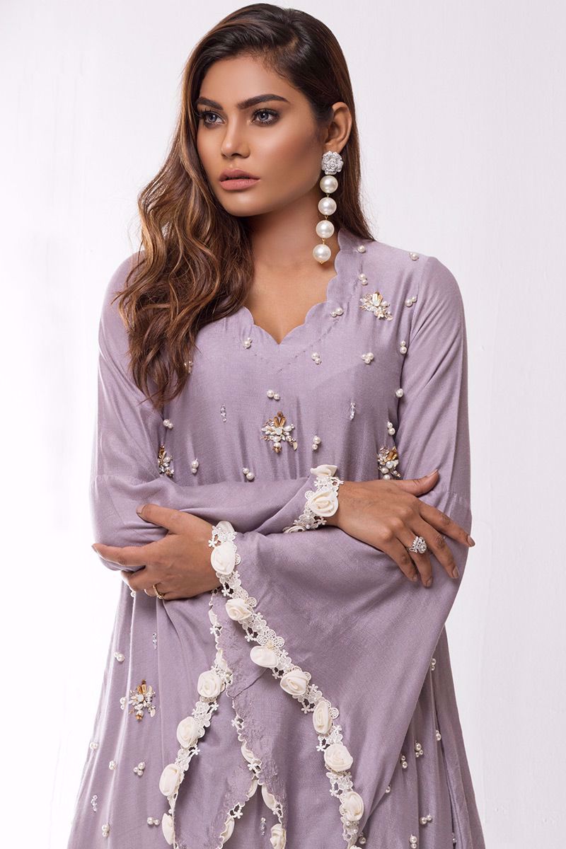 Lilac khadi net shirt hand worked with different materials such as pearls, cut dana, sequins, moti and rings etc.