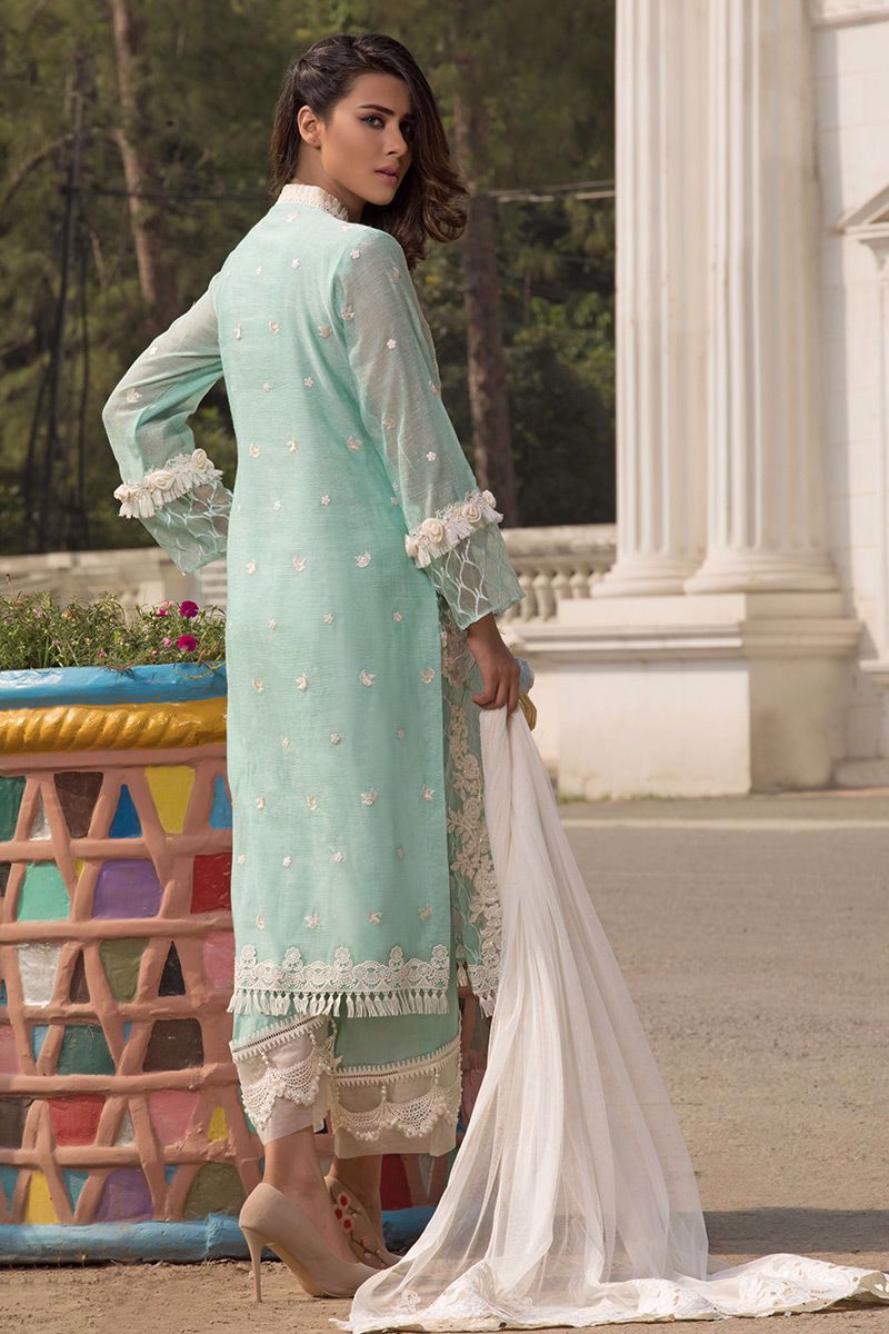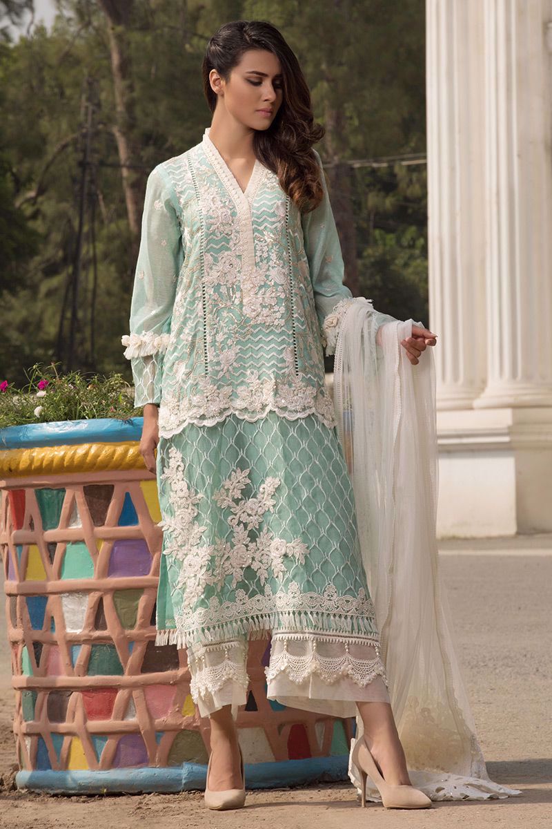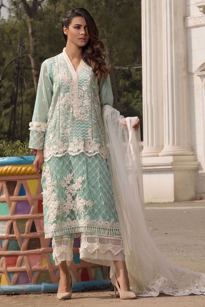 Aqua colored all over embroidered Shirt with fancy embellishments, extended length with embroidered organza.