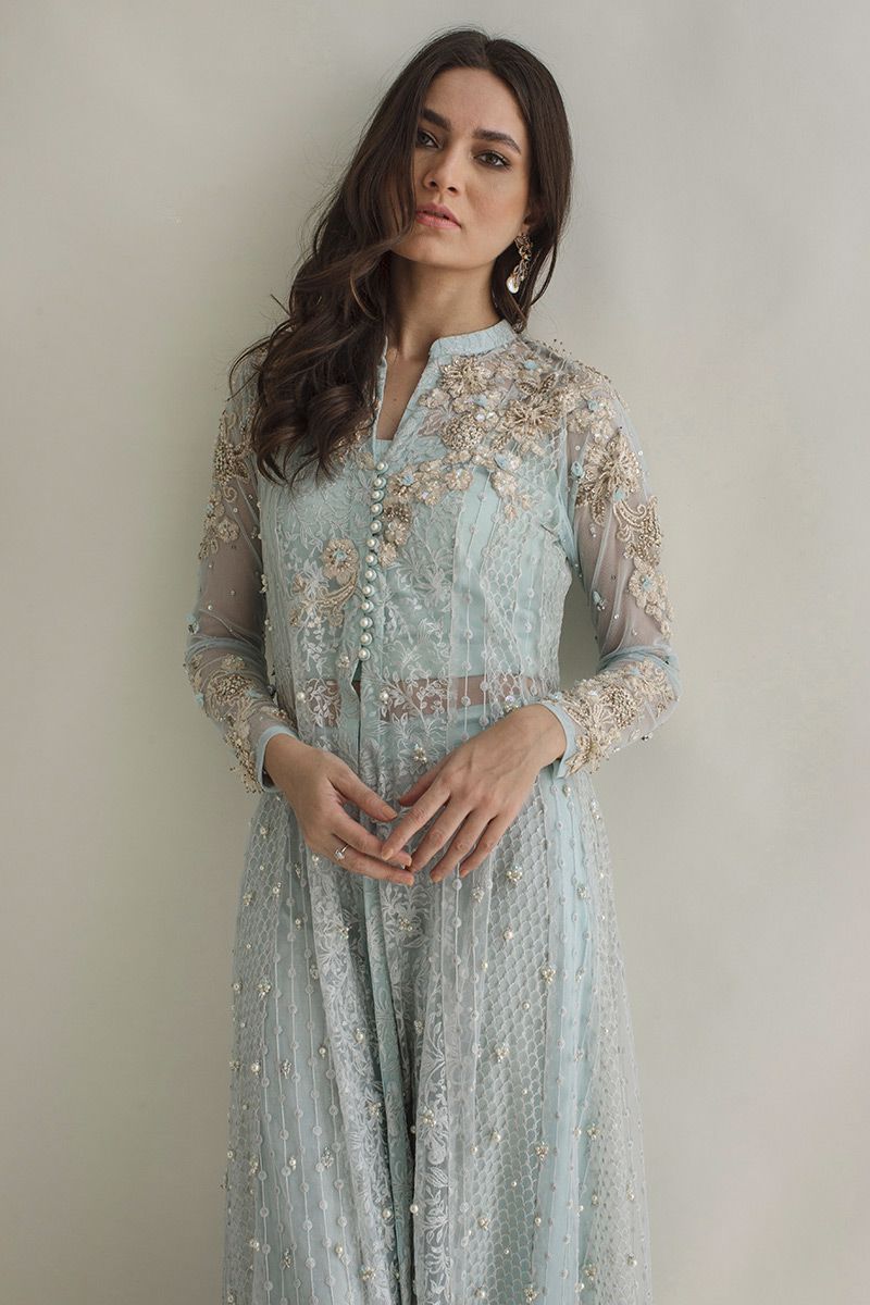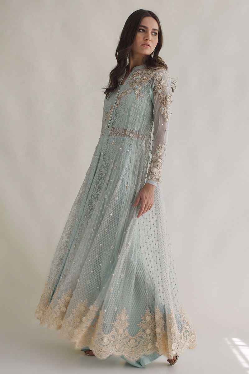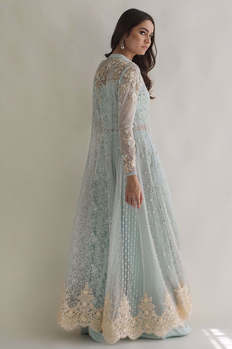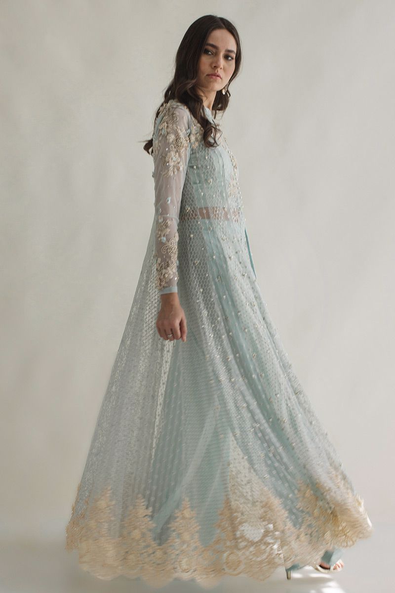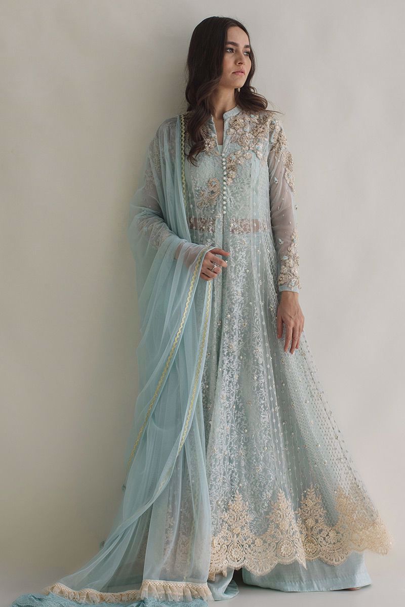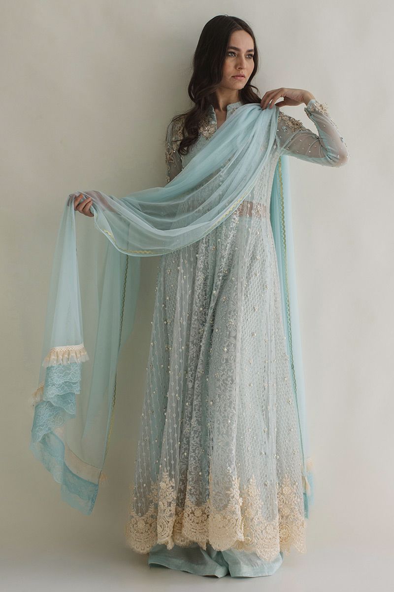 Soothing effect to the eyes, this skylight net kalidar depicts the ice age scenery. A true representation of sparkling ice on the mountains. The self embroided fabric lifts up the 3D embellishments comprising of cutdana, resham, sequins, pearls and net pastels. Same color semi pure pants and fancy net dupatta is paired, to be purchased at additional cost.