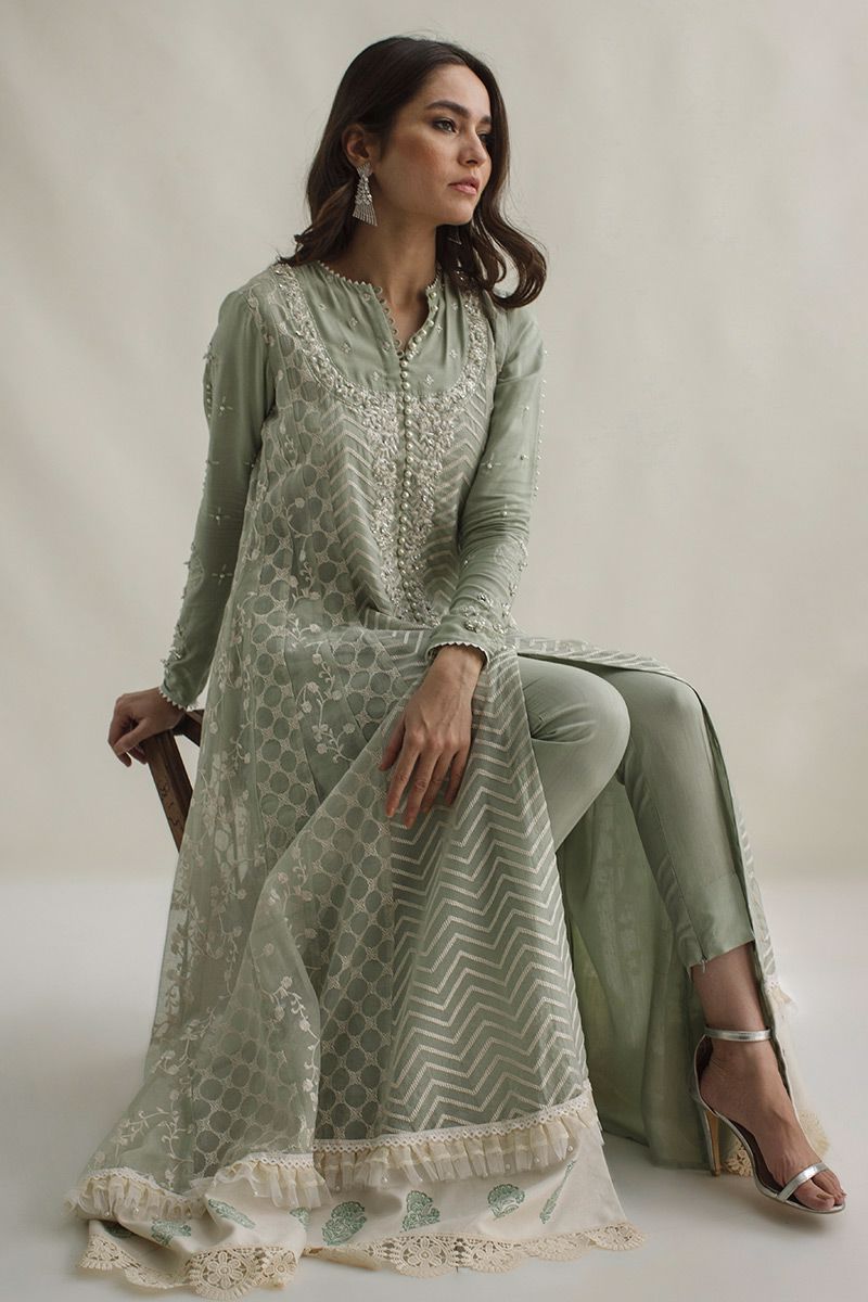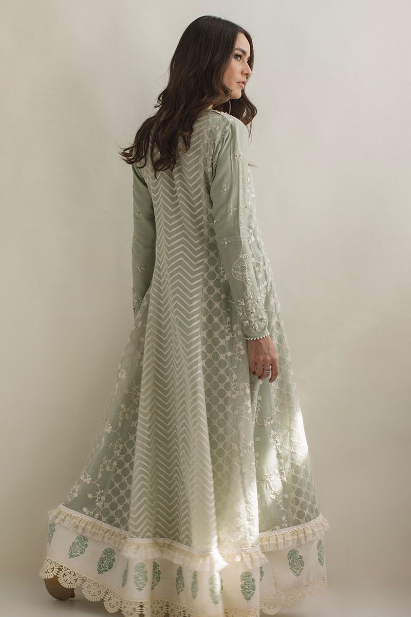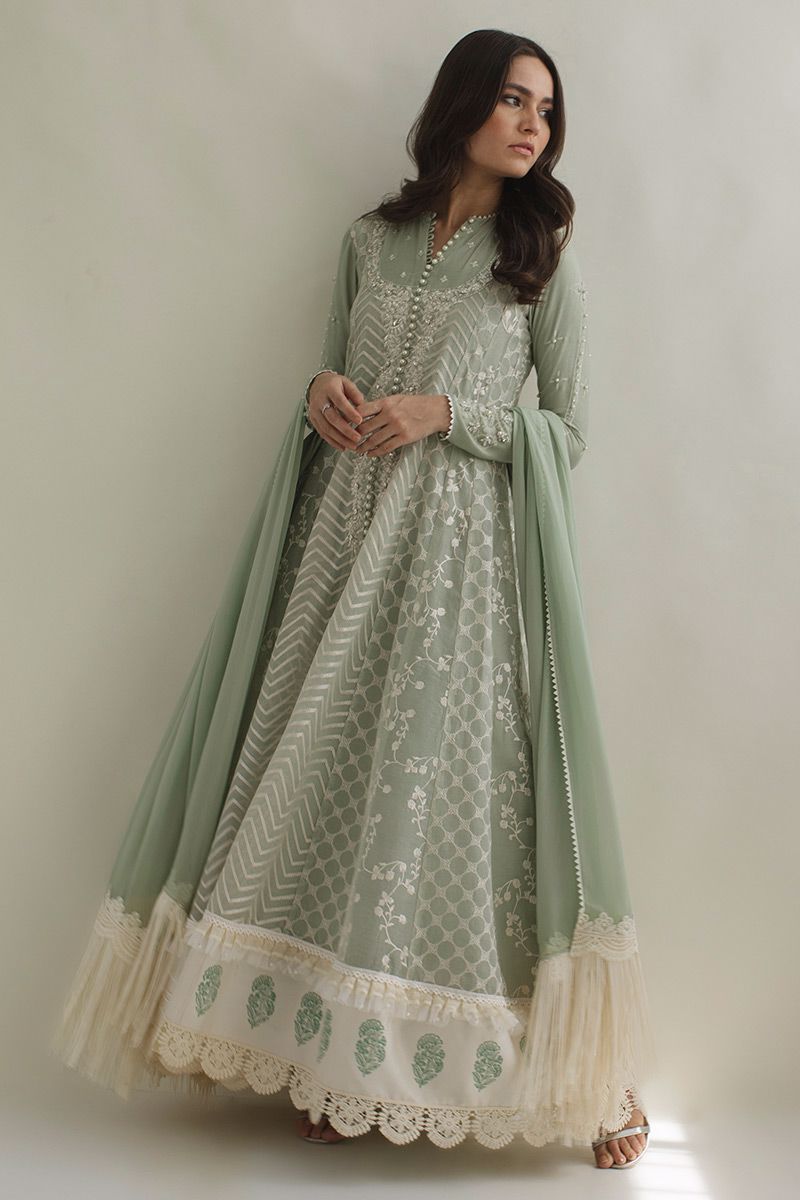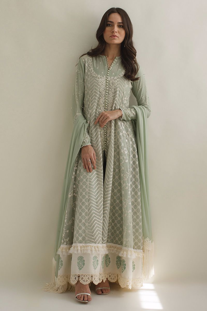 Mint green khaadi net kalidar is brilliantly made with white thread work in the panels, complementing best with fine embroidery on the neckline. Consisting of kantha stitches, pearls, crystals and cutdana. Finishing of the shirt with fancy block print and crochet borders on the hem. Same color semi pure pants and decorative dupatta with fringes is paired, to be purchased at addtional cost.