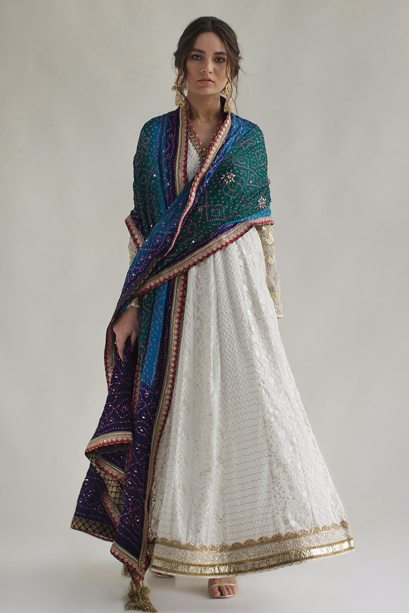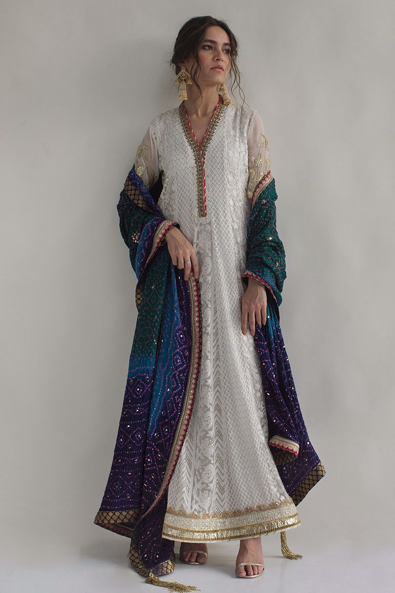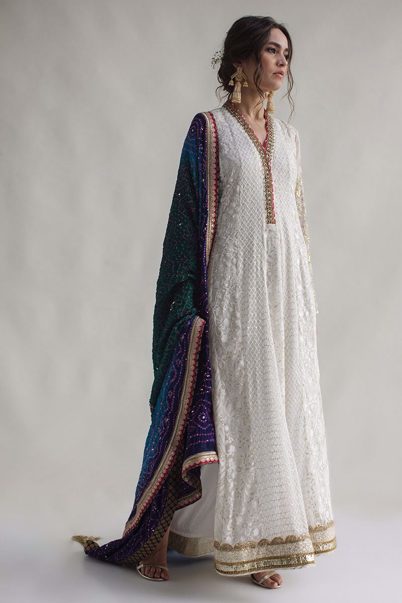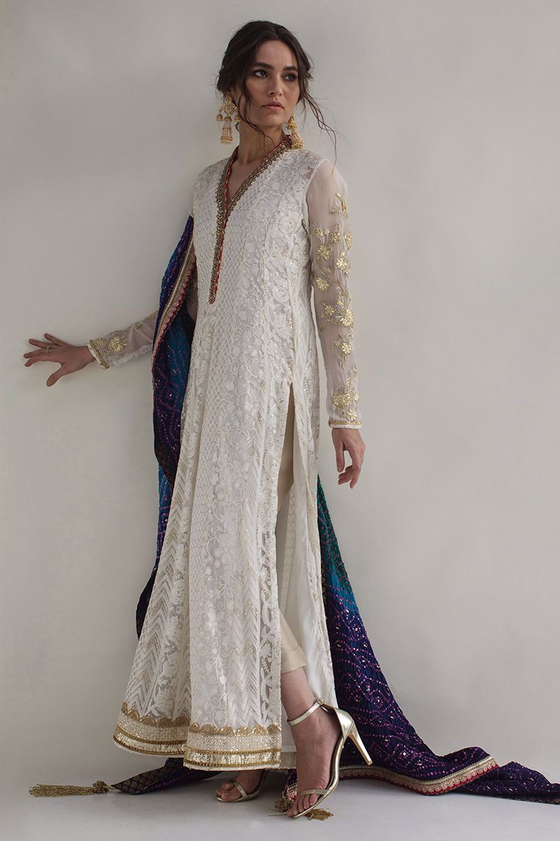 An orthodox yet new age lengthy white chikinkari shirt. Crafted in resham threads and entwined with gold sequins. The antique artistry of zardozi, sequins, resham, frenchknots and cutdana carrying out a fine neckline. Along with scattered gold work on sleeves and hem. To finish of the look gold pants and peacock toned bandhani chunri is paired, to be purchased at additional cost.