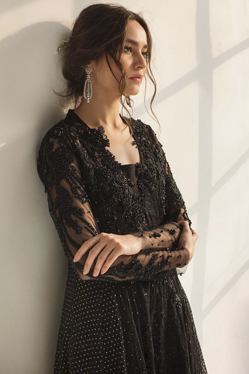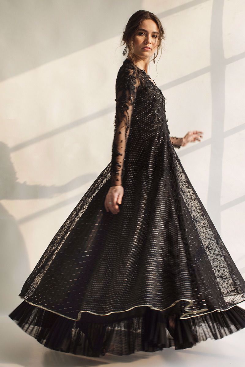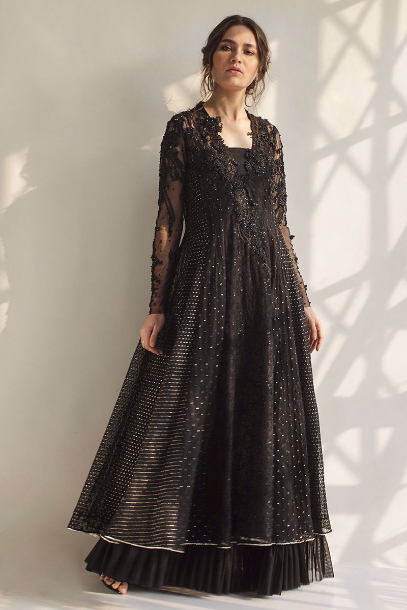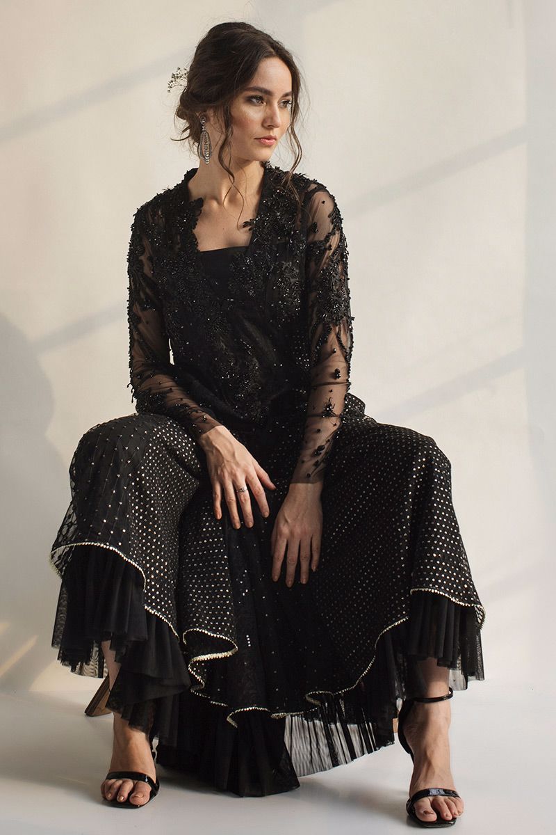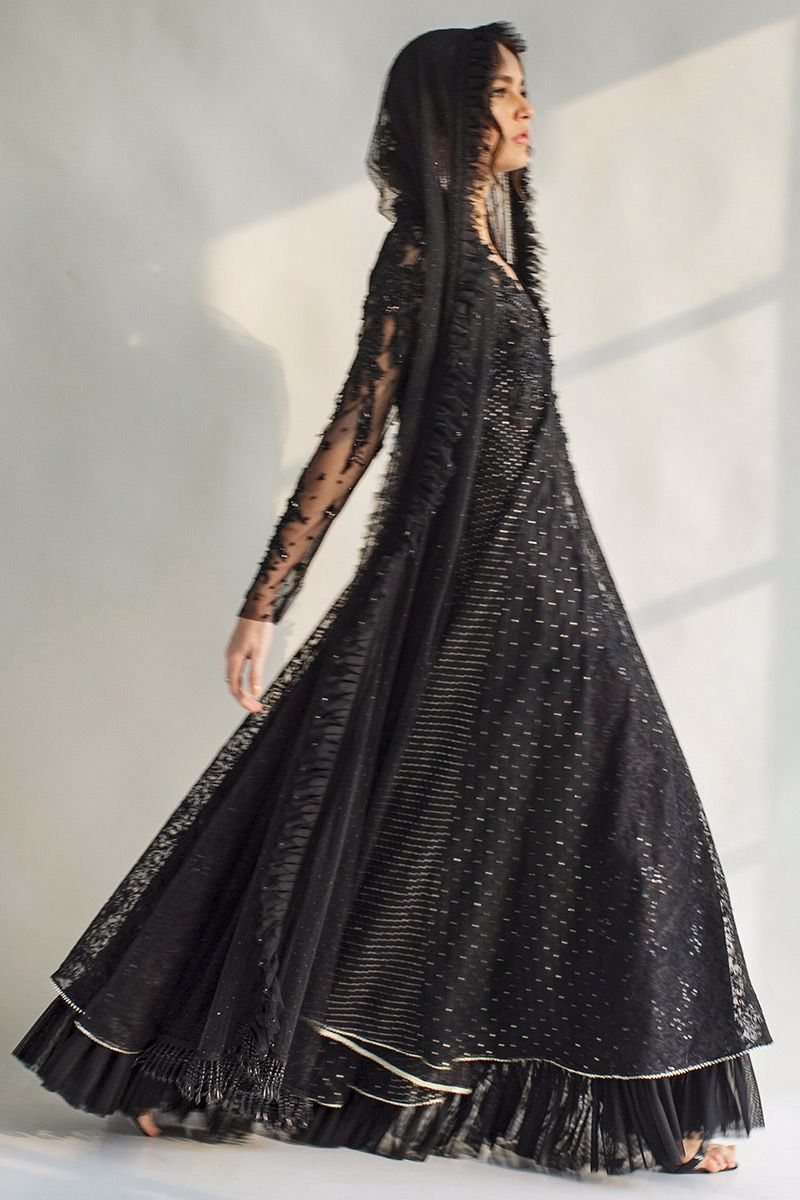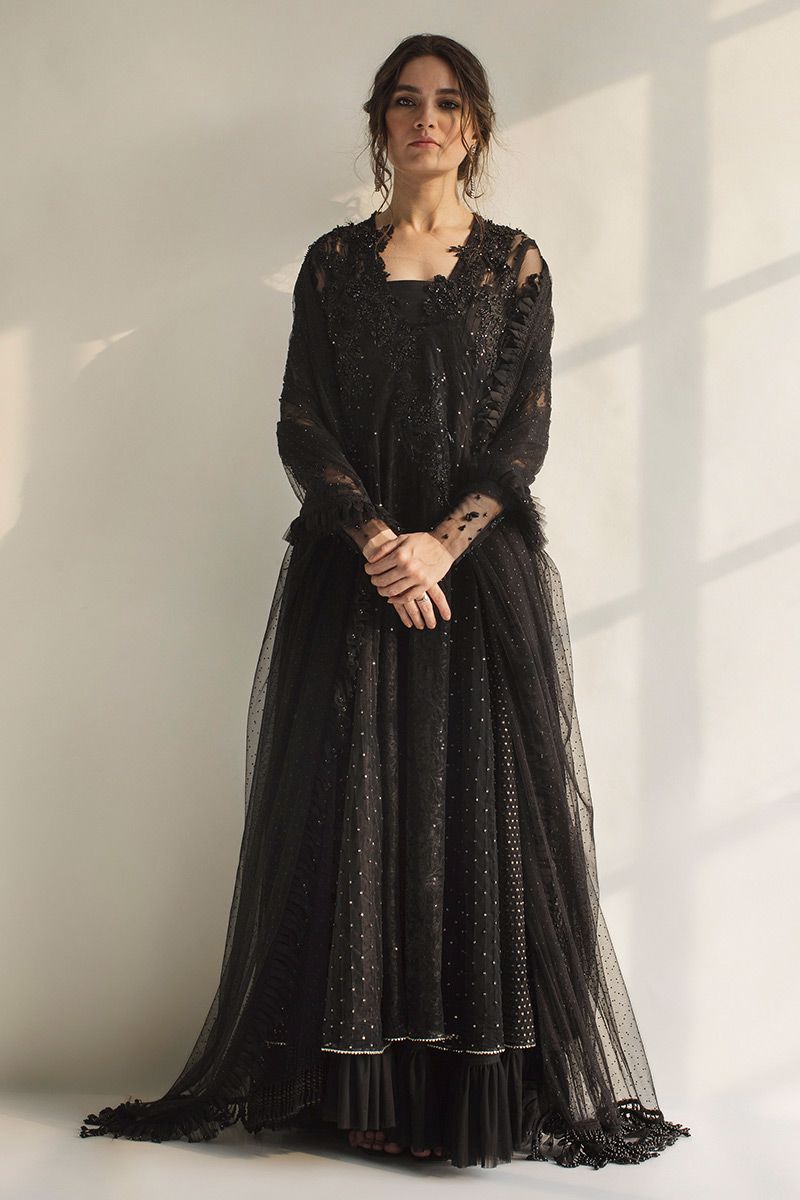 This glorifying, black net kalidar peshwas consisting of dainty sequins in each panel. The detailed work scattered on front of the shirt represents stars shining on a dreamy night. To finish of the look same color semi pure straight pants and fancy diamantes studded dupatta with frill finishing is paired, to be purchased at additional cost.