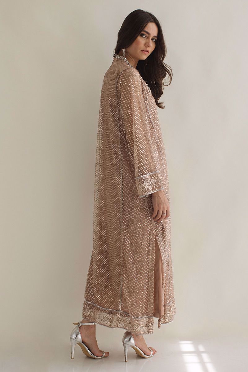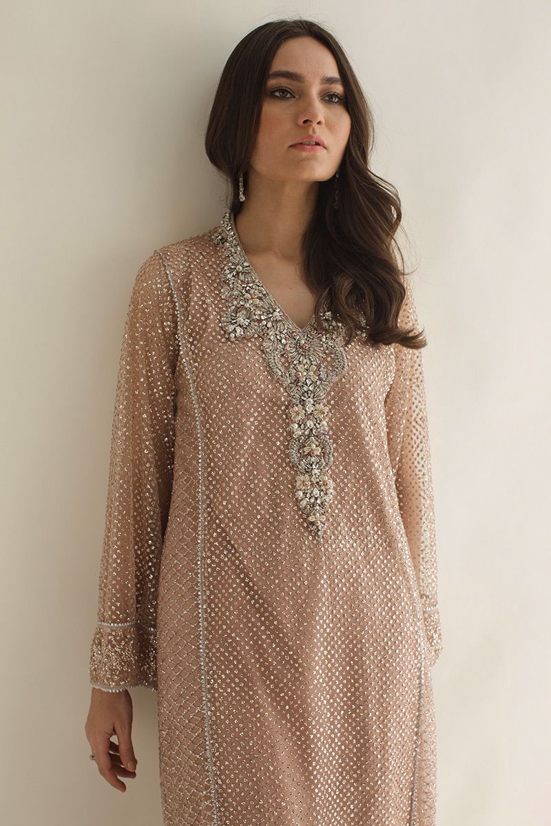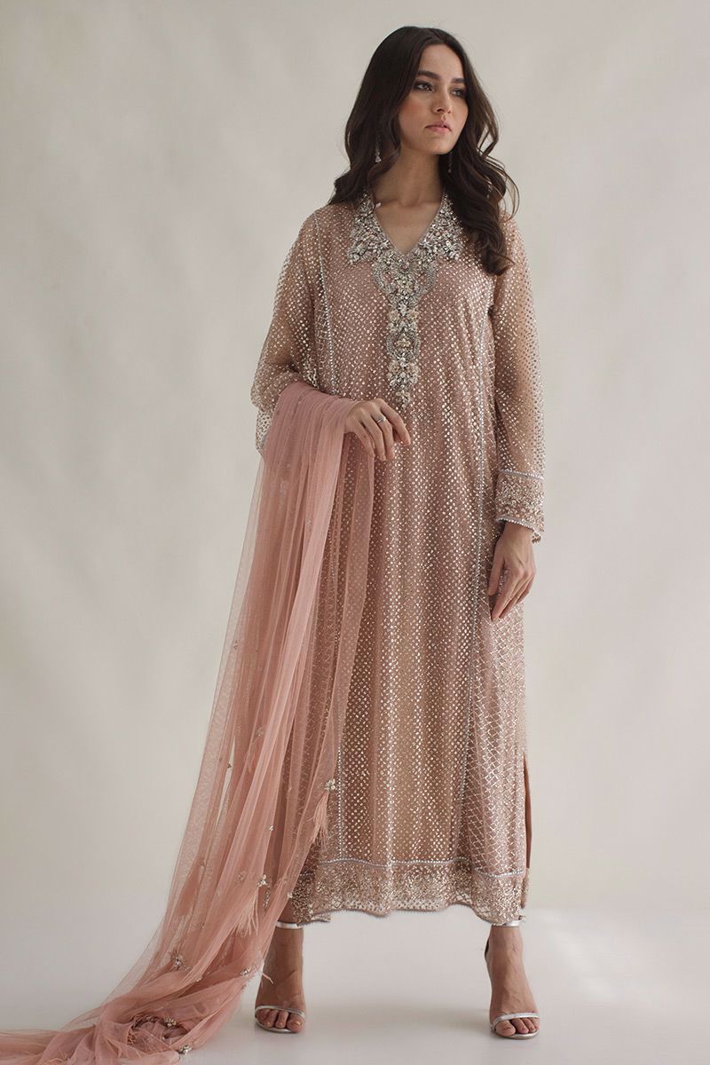 This glittery nude pink net shirt is adorn with 3D chunky embellishments of peals, crystals, cutdana, nakshi, zardozi highlights the V - neckline. Finishing off the style with same color semi pure pants and custom made adornments on dupatta is paired, to be purchased at additional cost.