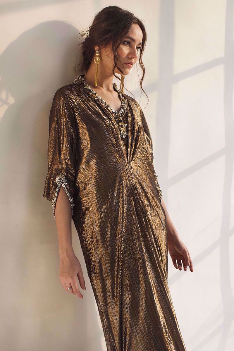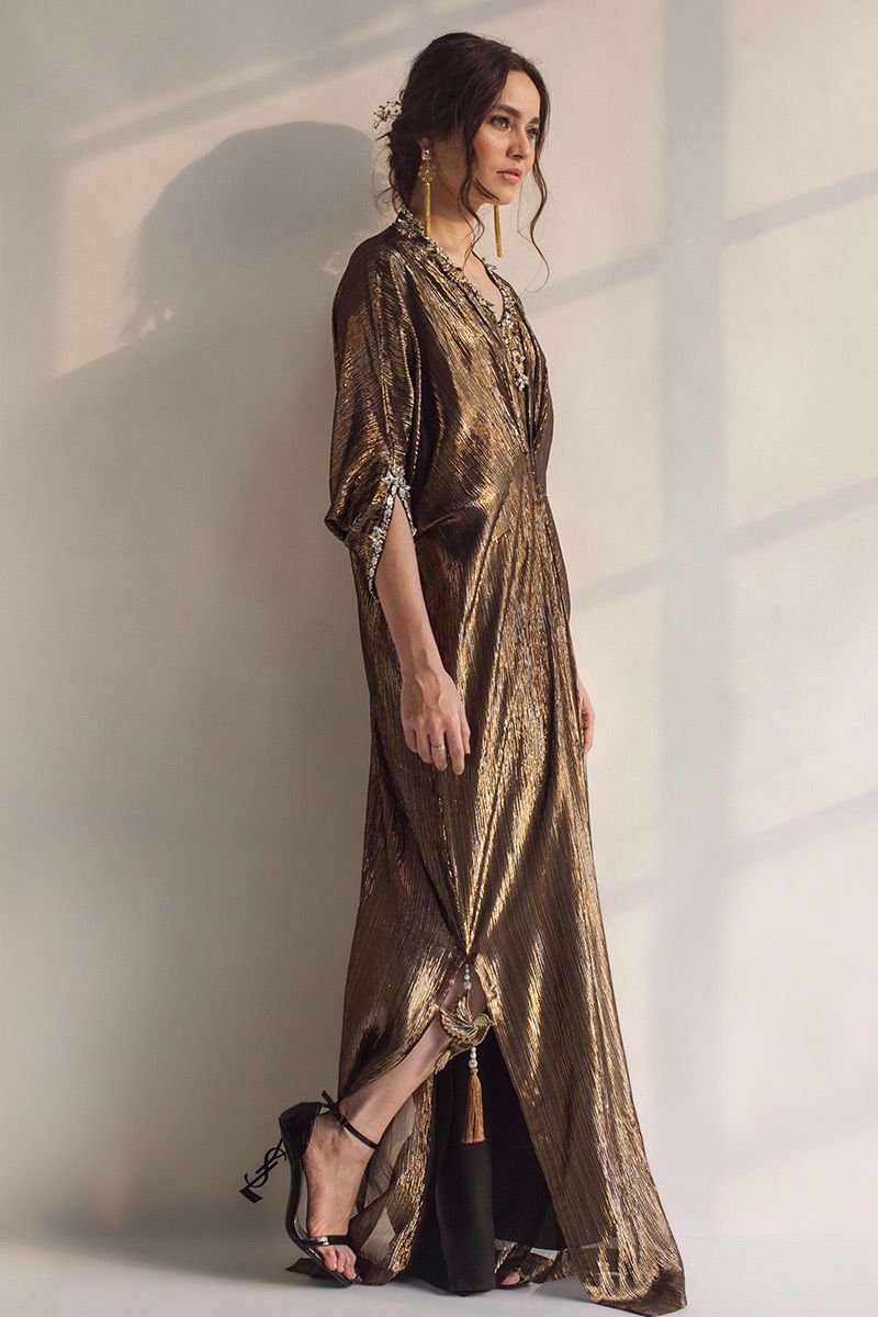 This kaftan showcases the complex weave of the gold and silver zari work all over. The simplified look is enhanced by beskope metal ornaments along with crystals, pearls and beads. The sleek straight look is uplifted by the beautifully embellished.