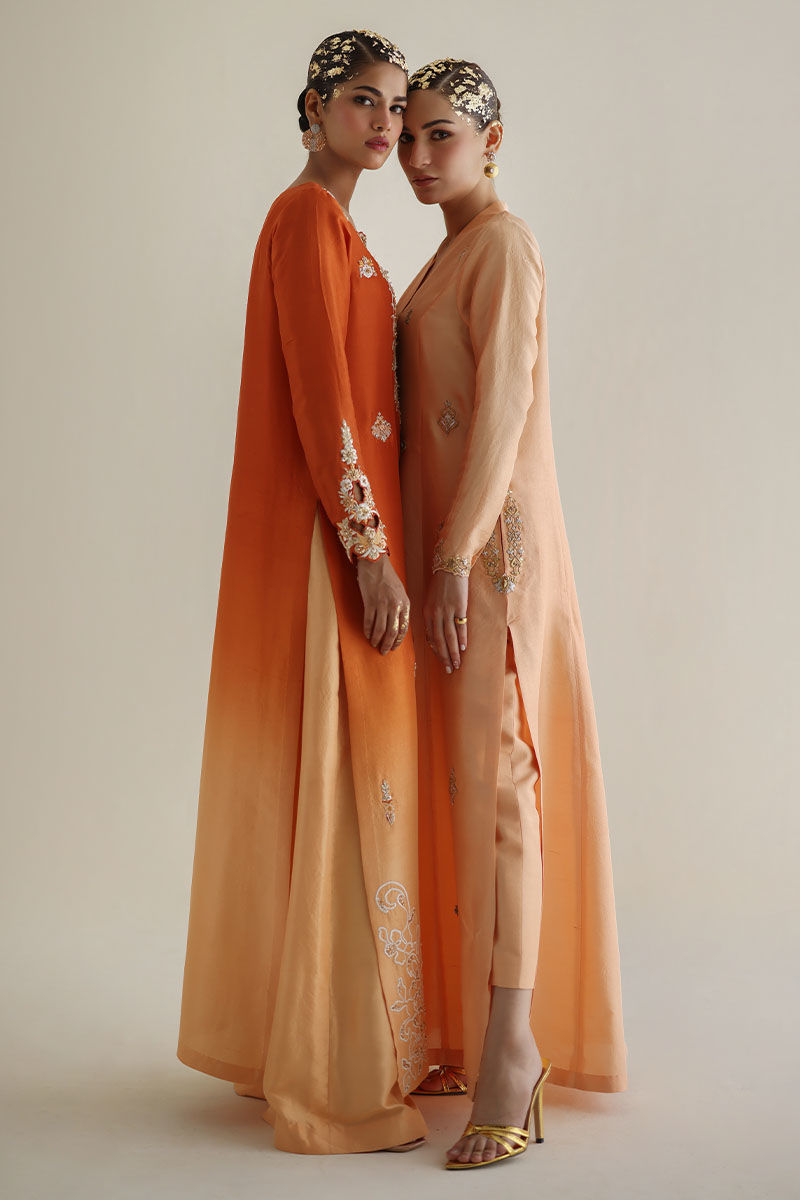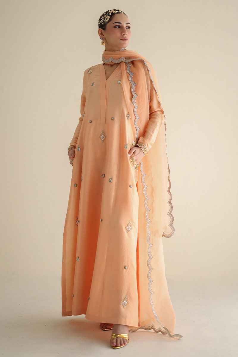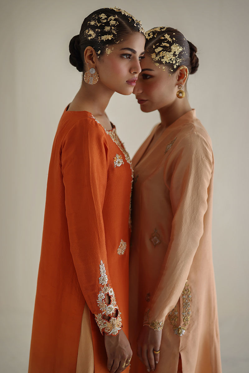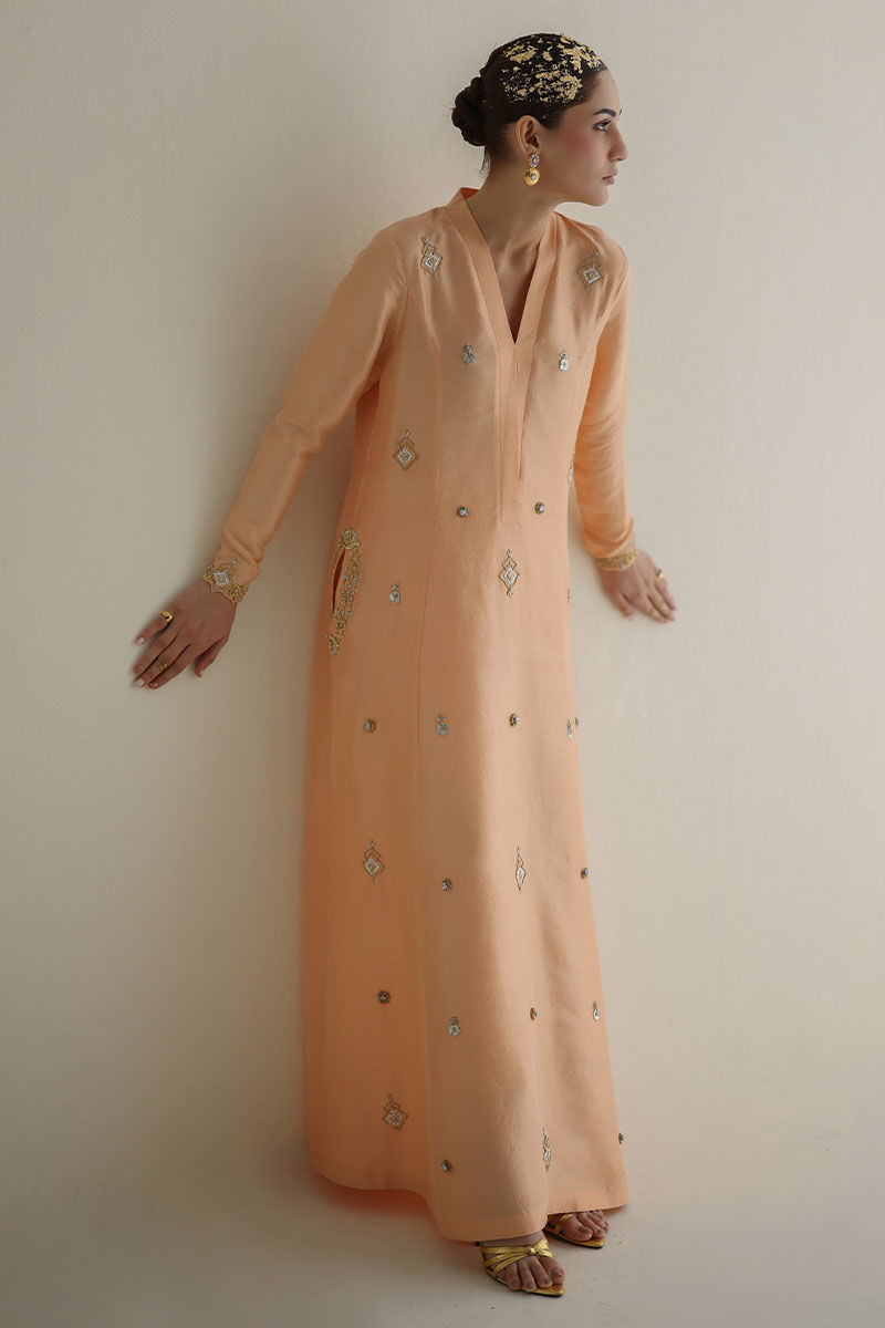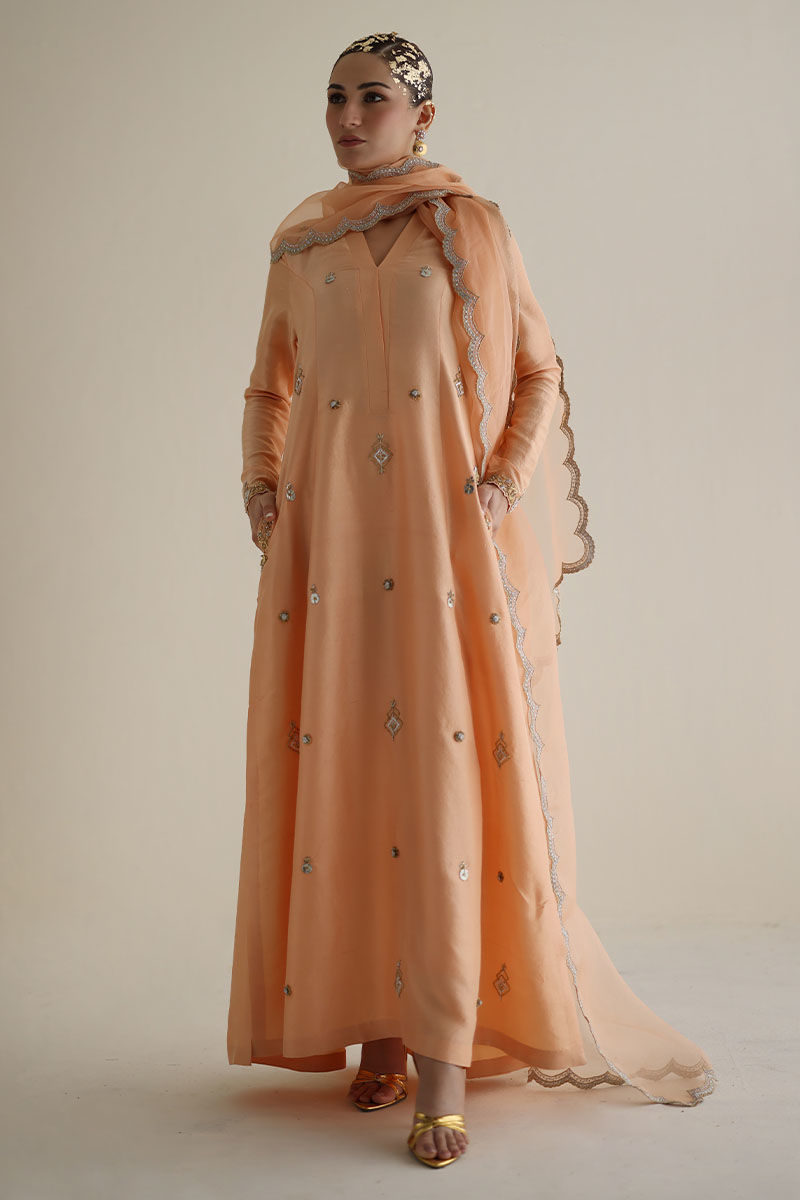 Introducing our peach fuzz pure raw silk prince panel shirt, a stunning addition to your wardrobe. Crafted from premium raw silk (80 gms), this shirt features intricate embroidery with gota, cutdana, tiki stones, pearls, danka, nakshi, and sequins adorning the front, pockets, and sleeves, adding a touch of elegance to your ensemble. Paired with pure raw silk pants and a pure organza dupatta, this outfit exudes sophistication and charm. Elevate your style with this exquisite ensemble. The model's shirt length is 54.