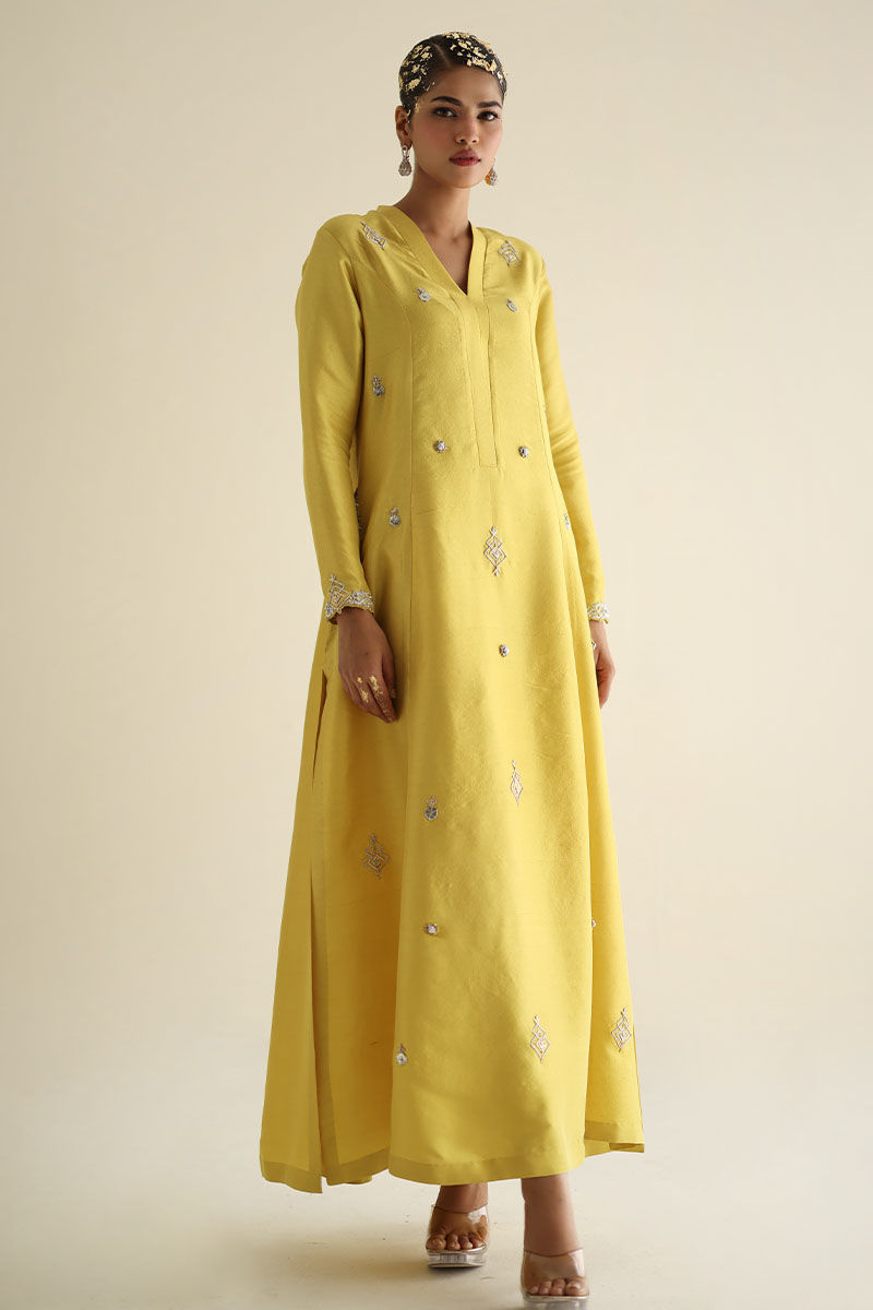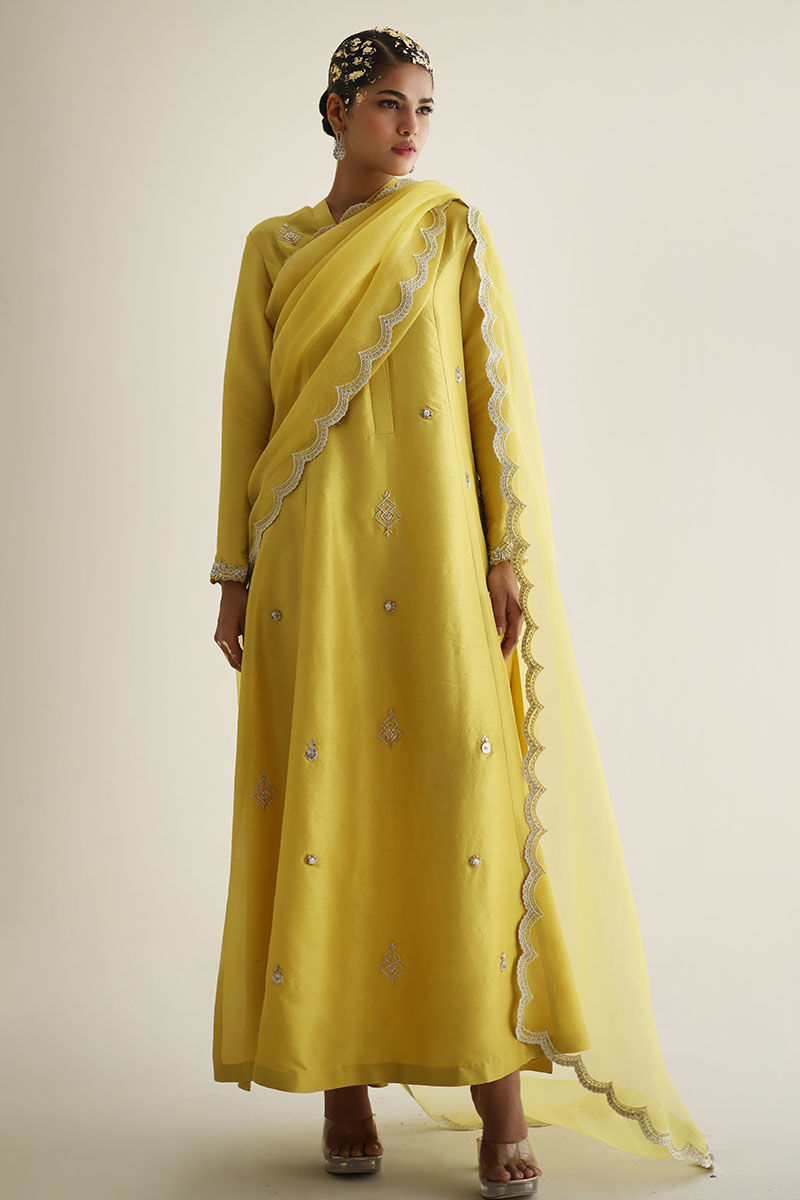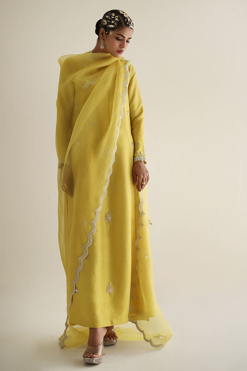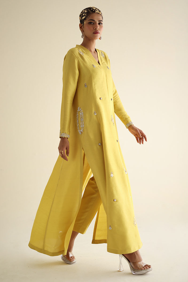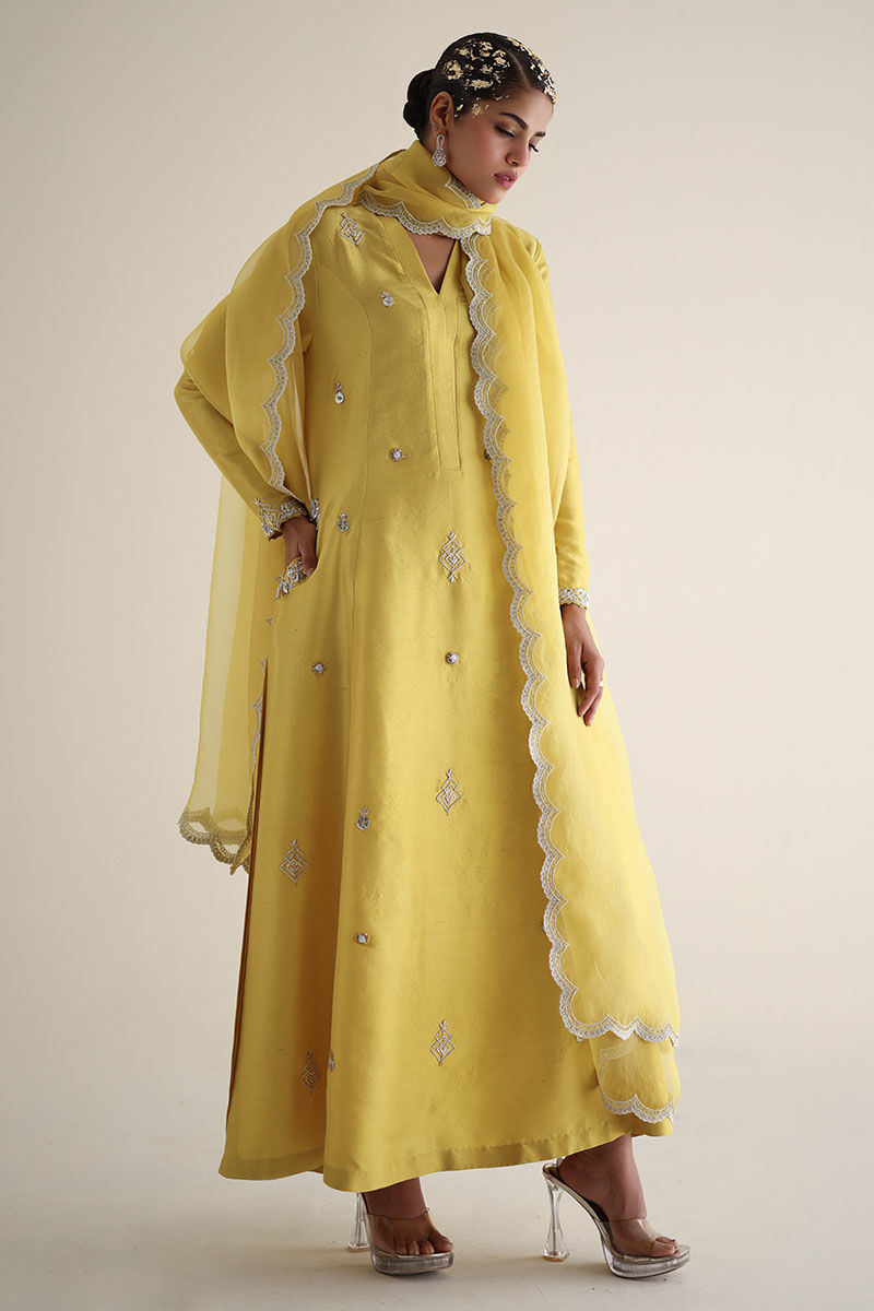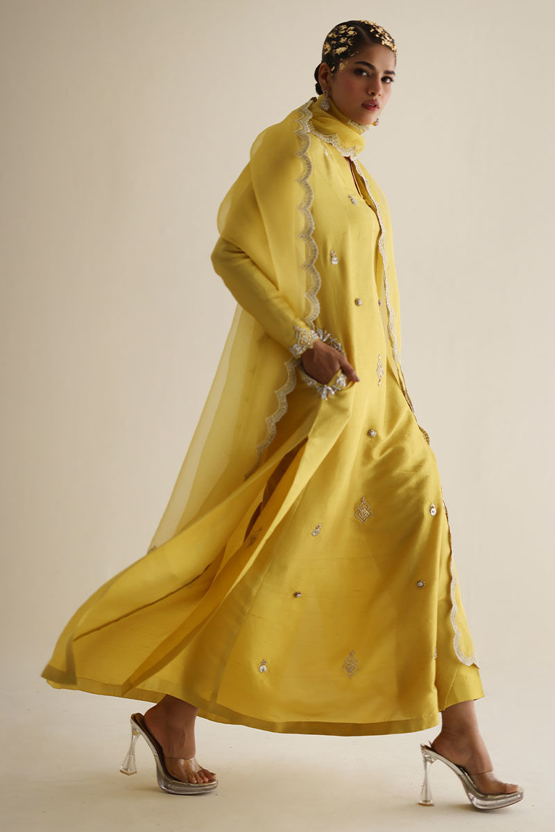 Introducing our dusky citron pure raw silk prince panel shirt, a graceful addition to your collection. Made from premium raw silk (80 gms), this shirt features intricate embroidery with gota, cutdana, tiki stones, pearls, dabkka, nakshi, and sequins embellishments adorning the front, pockets, and sleeves, exuding opulence and style. Paired with pure raw silk pants and a pure organza dupatta, this ensemble is perfect for any special occasion, offering both elegance and comfort. Elevate your wardrobe with this exquisite outfit. The model's shirt length is 54.