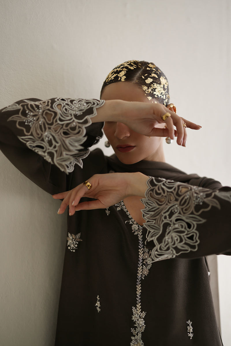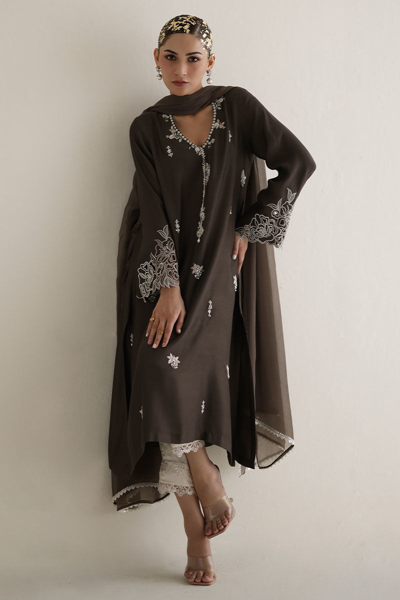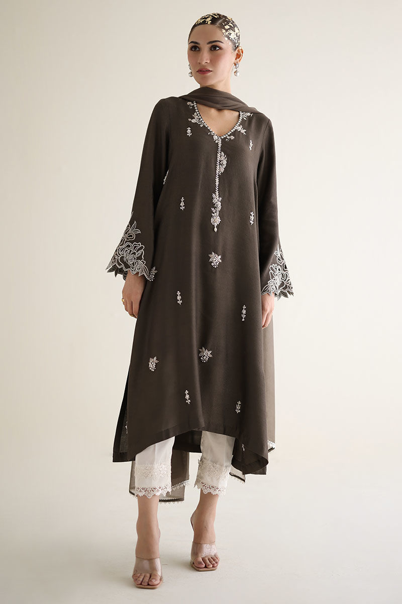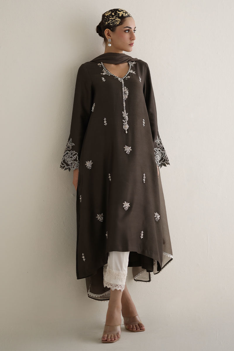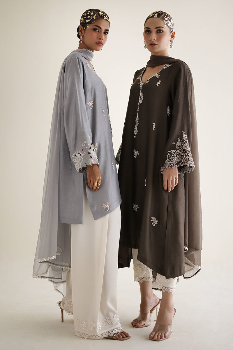 Introducing our stunning rock ridge khaadi shirt, crafted to perfection for your special occasions. Made from high-quality khaadi fabric, this shirt features exquisite embroidery with resham, zari, cutdana, tiki stone, pearls, dabka, nakshi, Indian moti, and sequins, meticulously adorning the front and cutwork sleeves. Paired with candy crape pants adorned with delicate lace detailing at the bottom and a chiffon dupatta embellished with lace, this ensemble exudes elegance and charm. Elevate your style with this timeless outfit, perfect for any celebration. The model's shirt length is 43.
