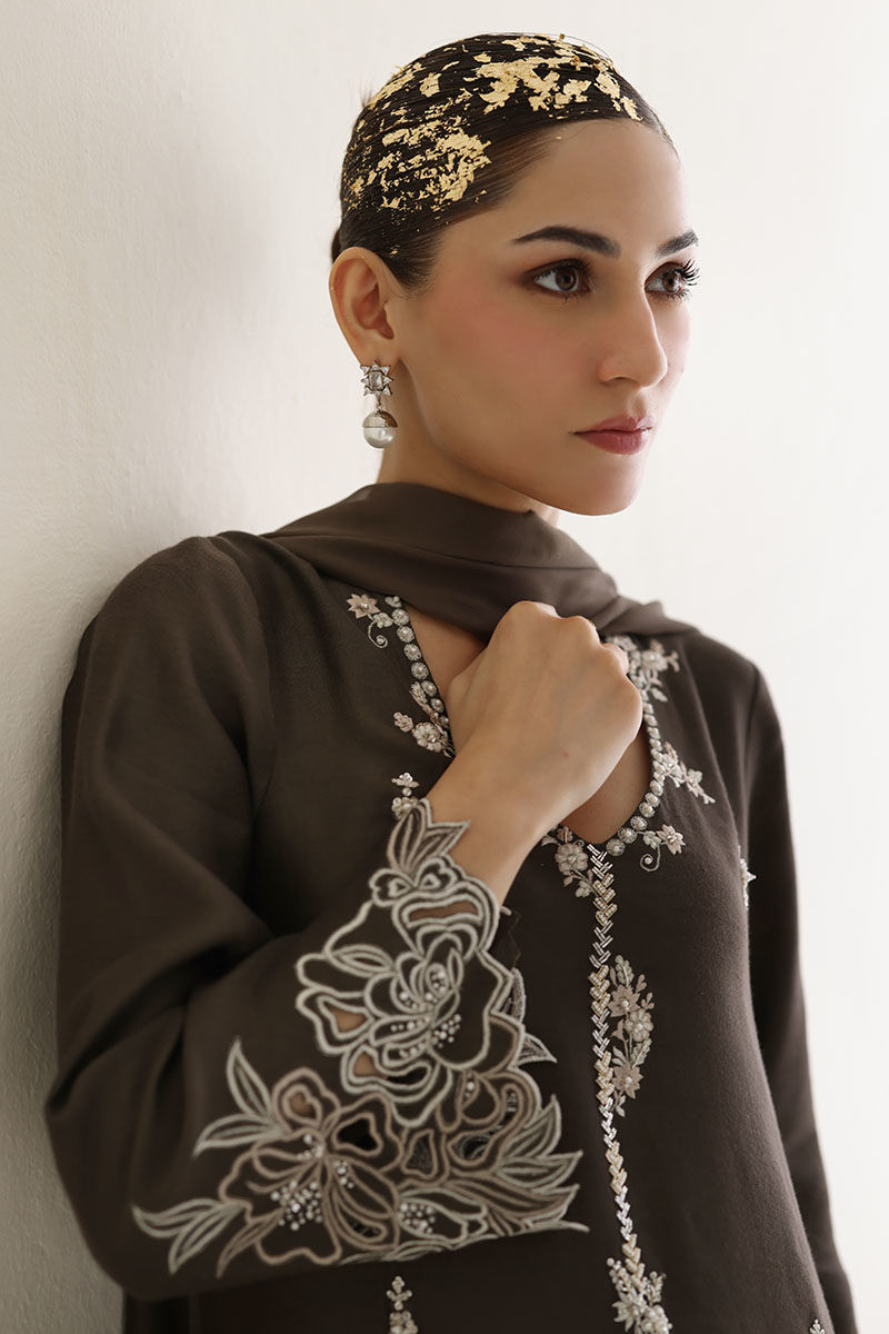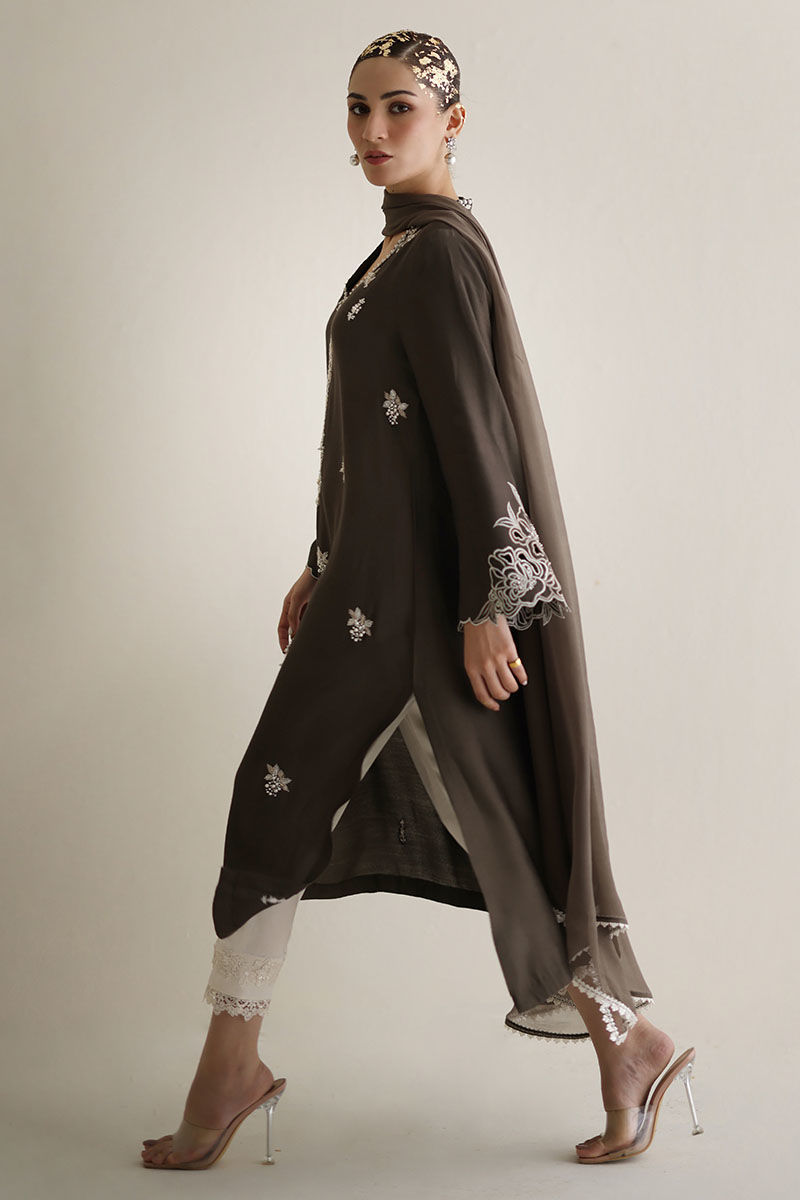 Introducing our stunning rock ridge khaadi shirt, crafted to perfection for your special occasions. Made from high-quality khaadi fabric, this shirt features exquisite embroidery with resham, zari, cutdana, tiki stone, pearls, dabka, nakshi, Indian moti, and sequins, meticulously adorning the front and cutwork sleeves. Paired with candy crape pants adorned with delicate lace detailing at the bottom and a chiffon dupatta embellished with lace, this ensemble exudes elegance and charm. Elevate your style with this timeless outfit, perfect for any celebration. The model's shirt length is 43.The outfit includes an embelished duptta and Candy Crape Culottes