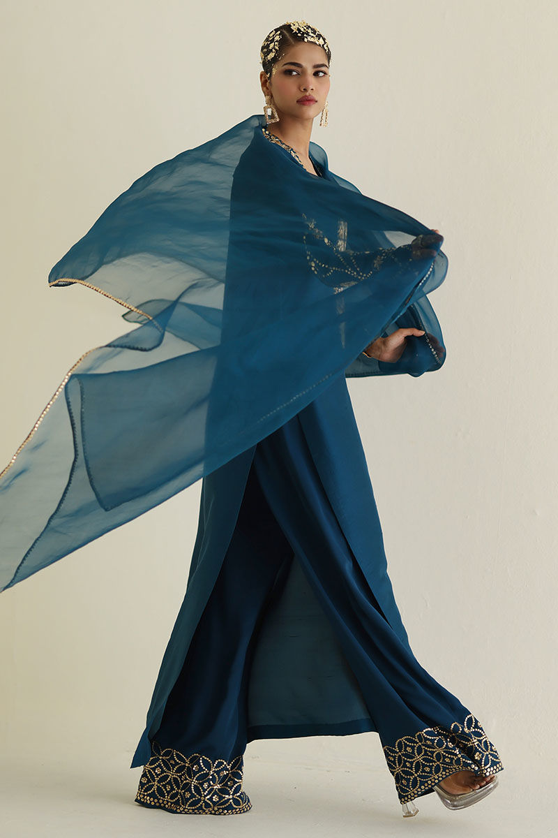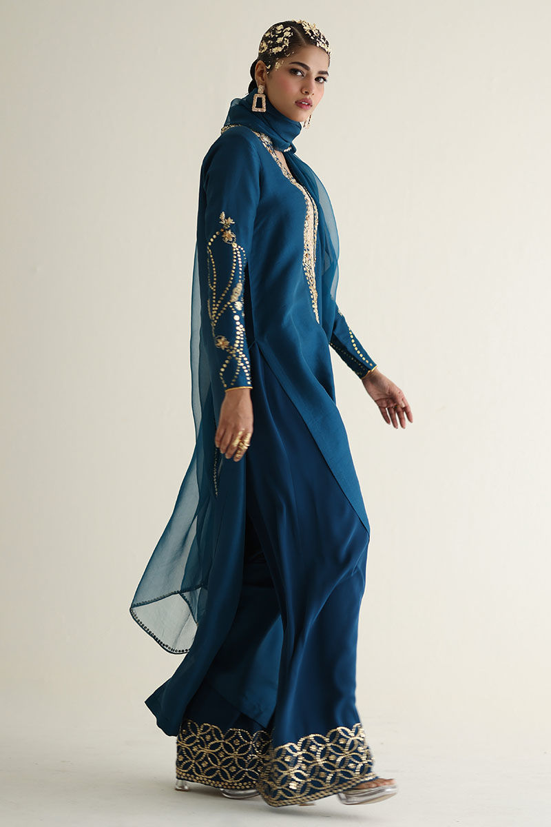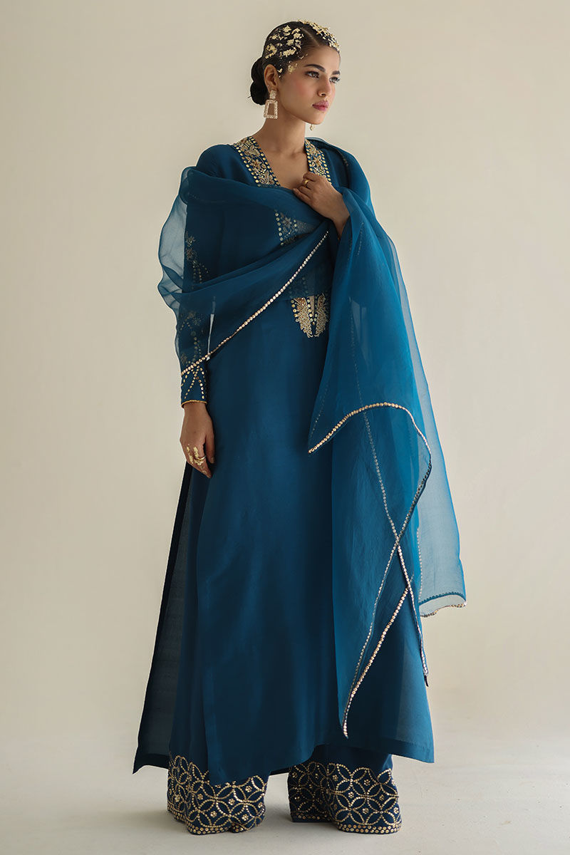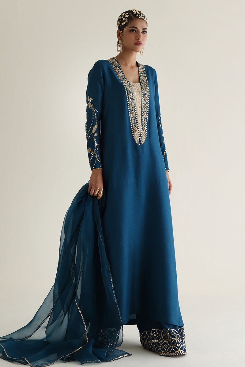 Introducing our teal blue pure raw silk Straight Long Shirt, a masterpiece of timeless elegance. Crafted from premium raw silk 80 gms, this shirt features intricate handwork of Kamdani, dabka, naqshi, crystals, sequence, and tiki stones delicately embellishing the neckline and sleeves. Paired with an Italian crepe hizar adorned with exquisite sequence work and an organza dupatta finished with delicate sequence edging, this ensemble exudes sophistication and grace. The model's shirt length is 54.