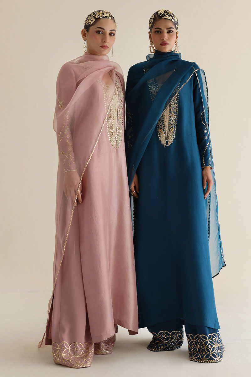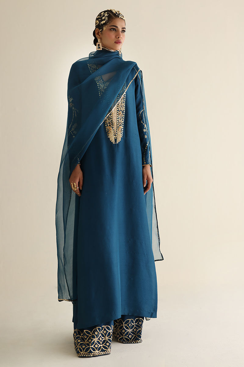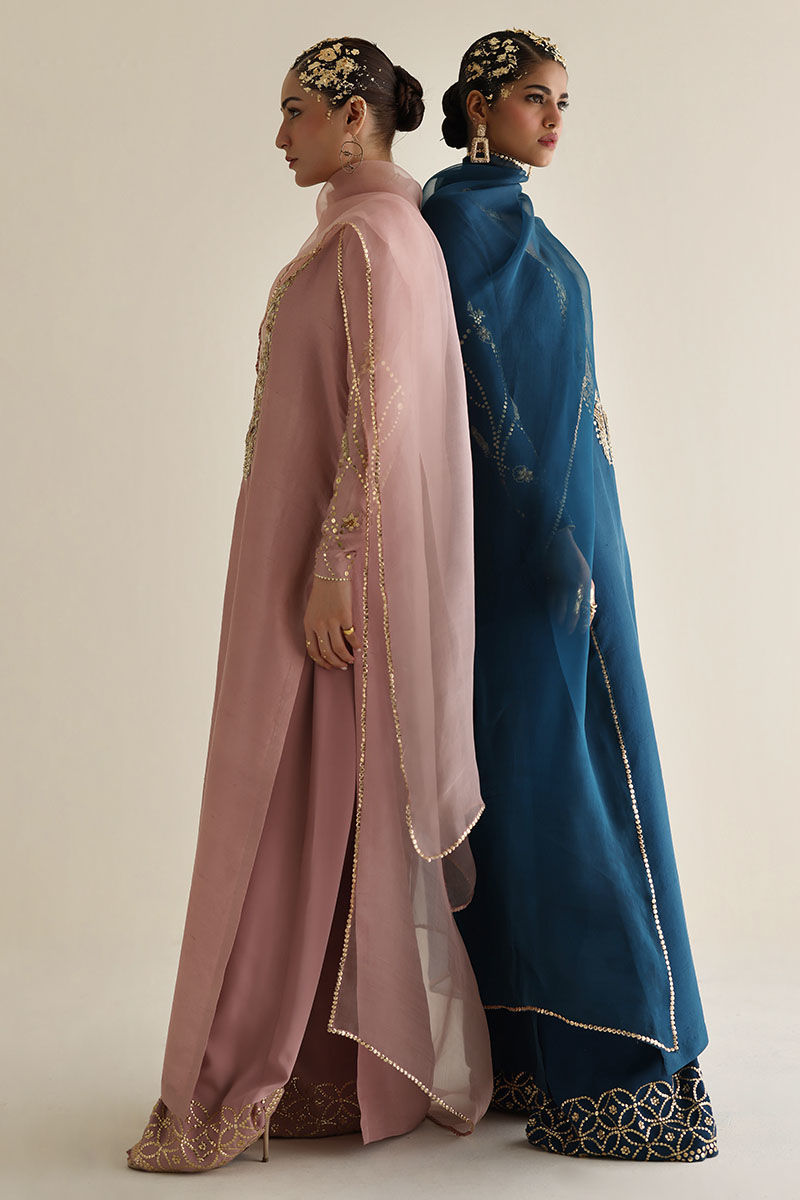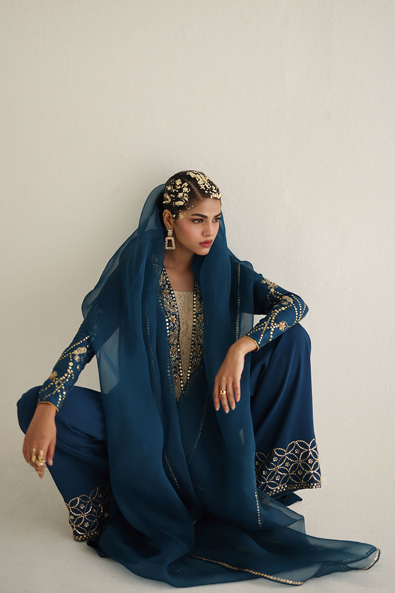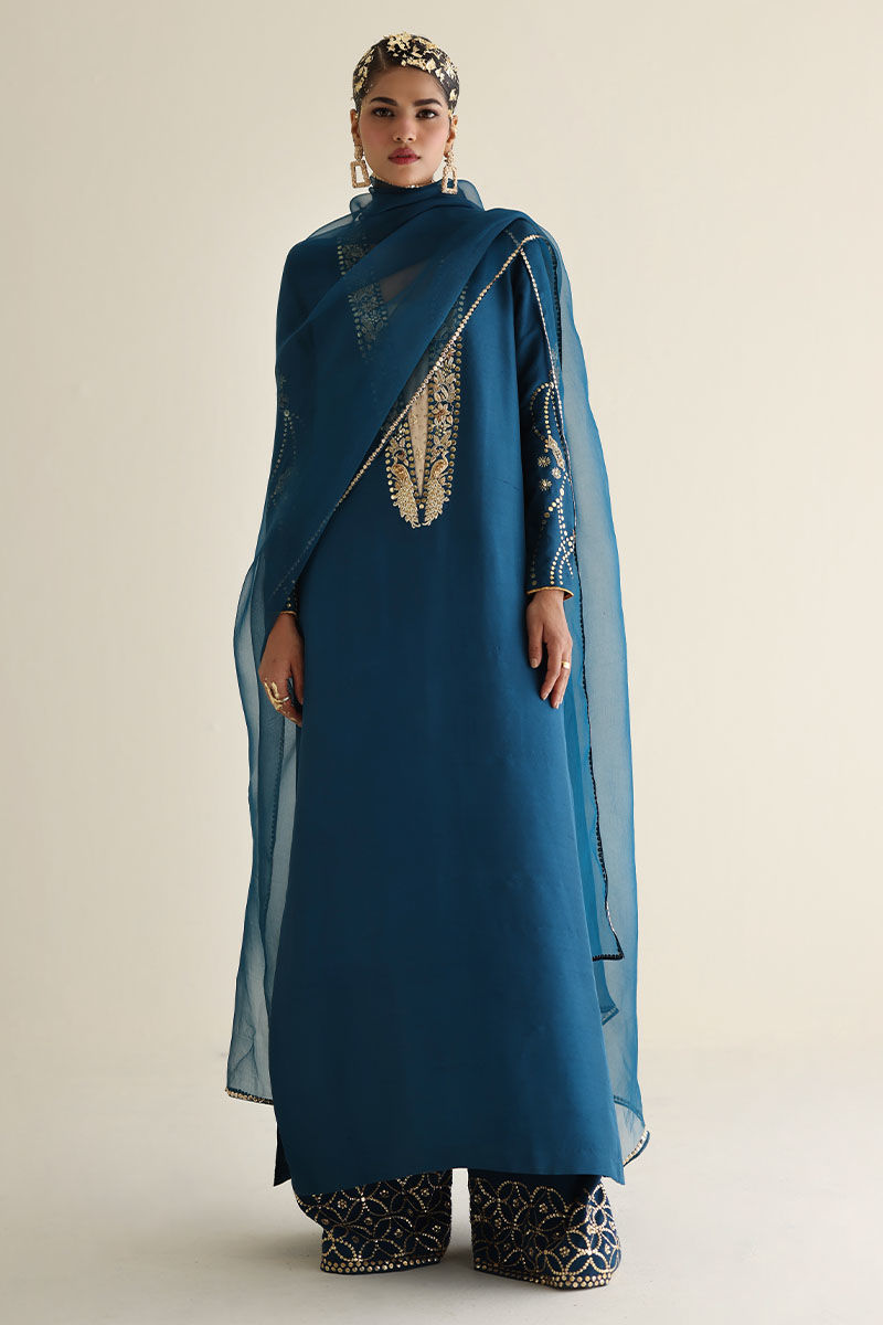 Introducing our teal blue pure raw silk Straight Long Shirt, a masterpiece of timeless elegance. Crafted from premium raw silk 80 gms, this shirt features intricate handwork of Kamdani, dabka, naqshi, crystals, sequence, and tiki stones delicately embellishing the neckline and sleeves. Paired with an Italian crepe hizar adorned with exquisite sequence work and an organza dupatta finished with delicate sequence edging, this ensemble exudes sophistication and grace. The model's shirt length is 54.