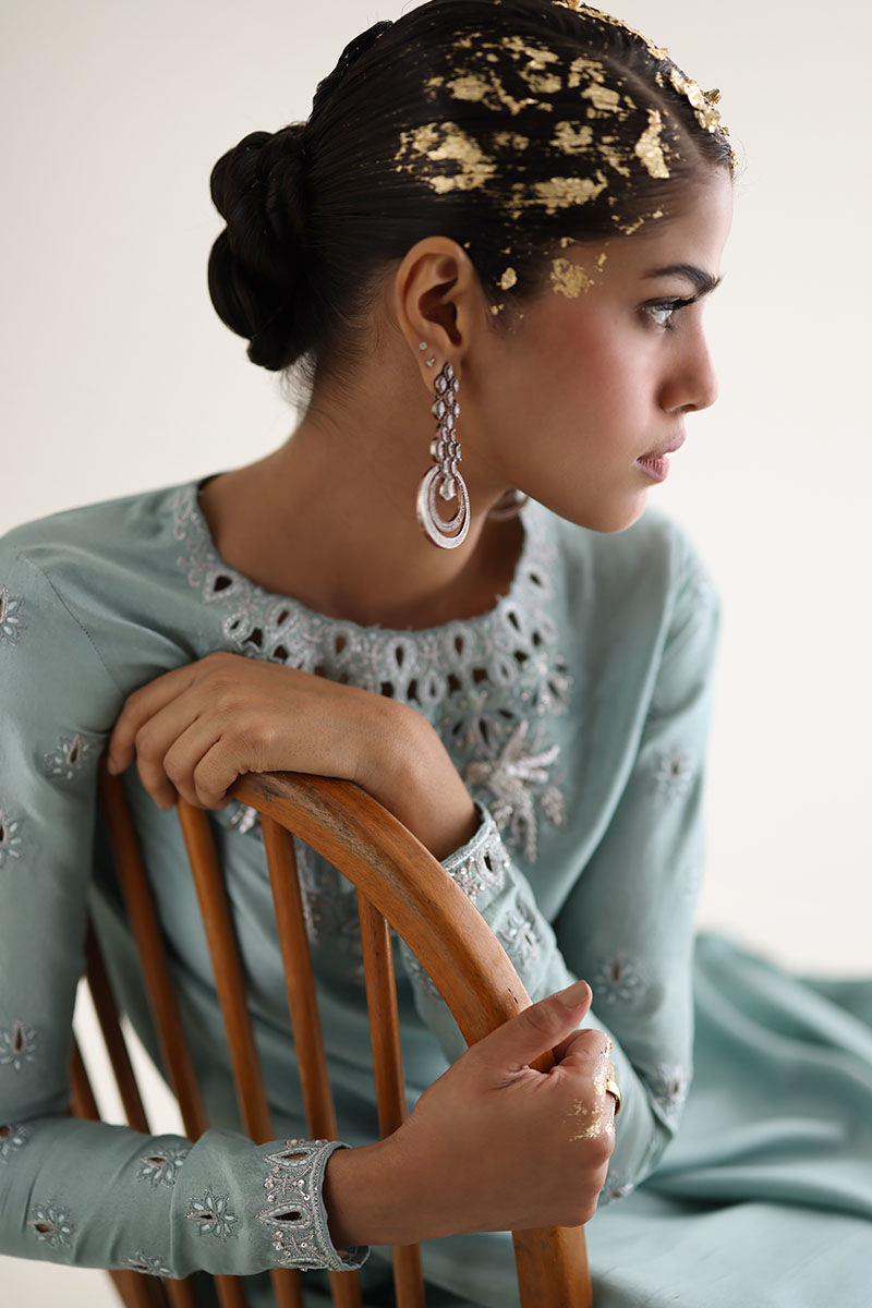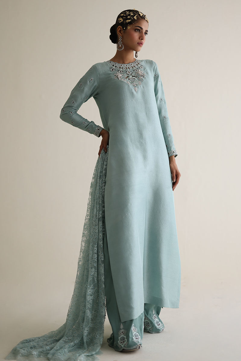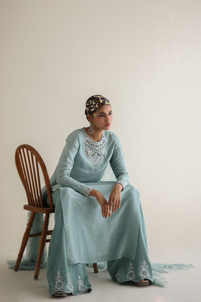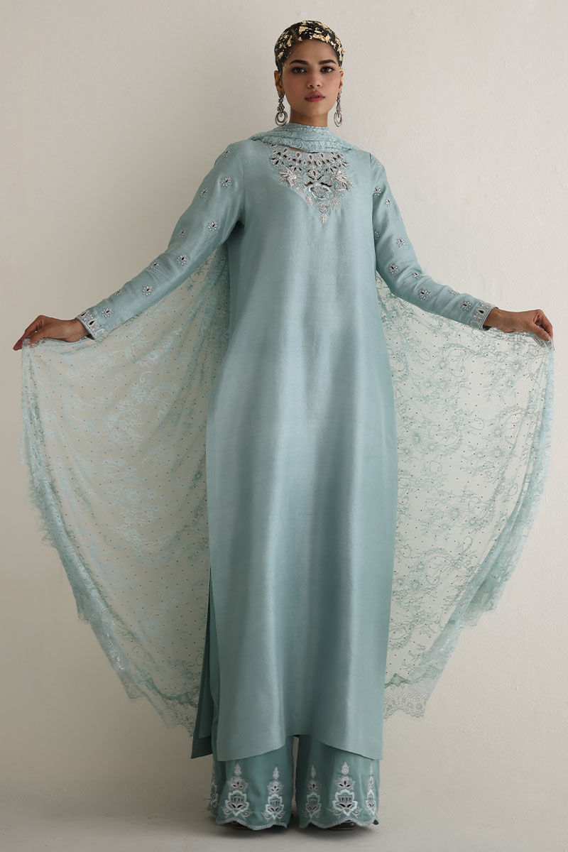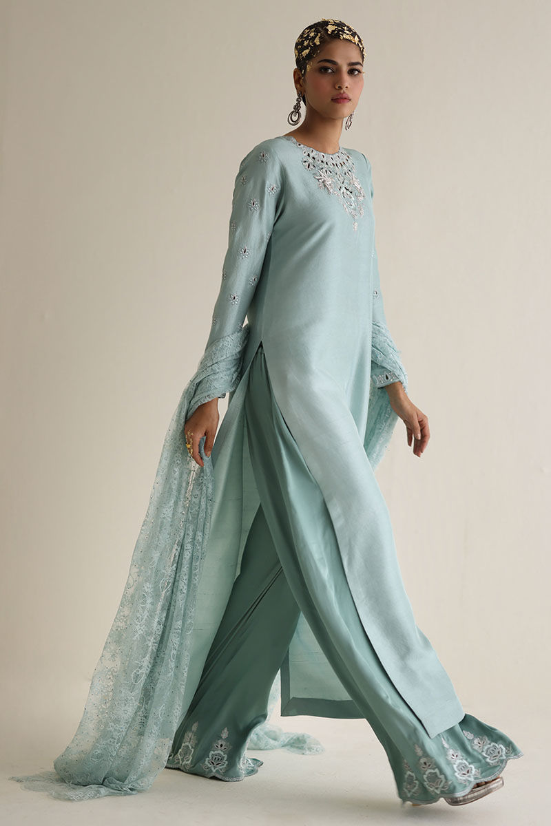 Introducing our bleached aqua pure raw Silk Straight Shirt, a vision of elegance and charm. Crafted from premium raw silk 80 gms, this shirt boasts exquisite embroidery featuring resham, zari, cutdana, tiki stones, and sequins on the front neck, back, and sleeves. Paired with candy crape culottes adorned with resham and zari embroidery on the bottom, this ensemble exudes sophistication. Complete the look with our Chantilly dupatta for an added touch of grace and finesse. The model's shirt length is 53.