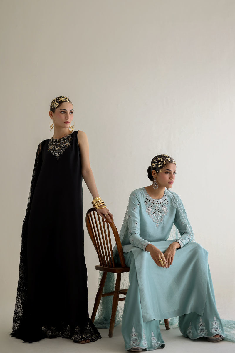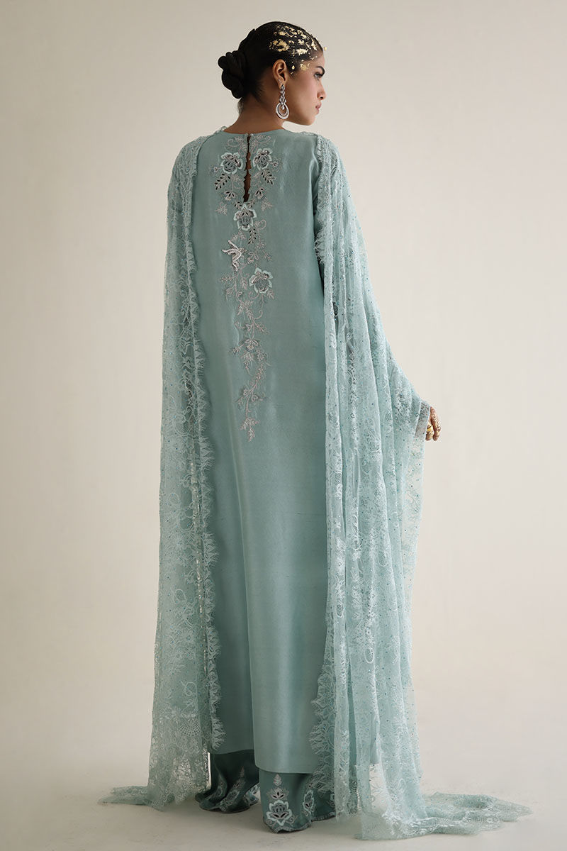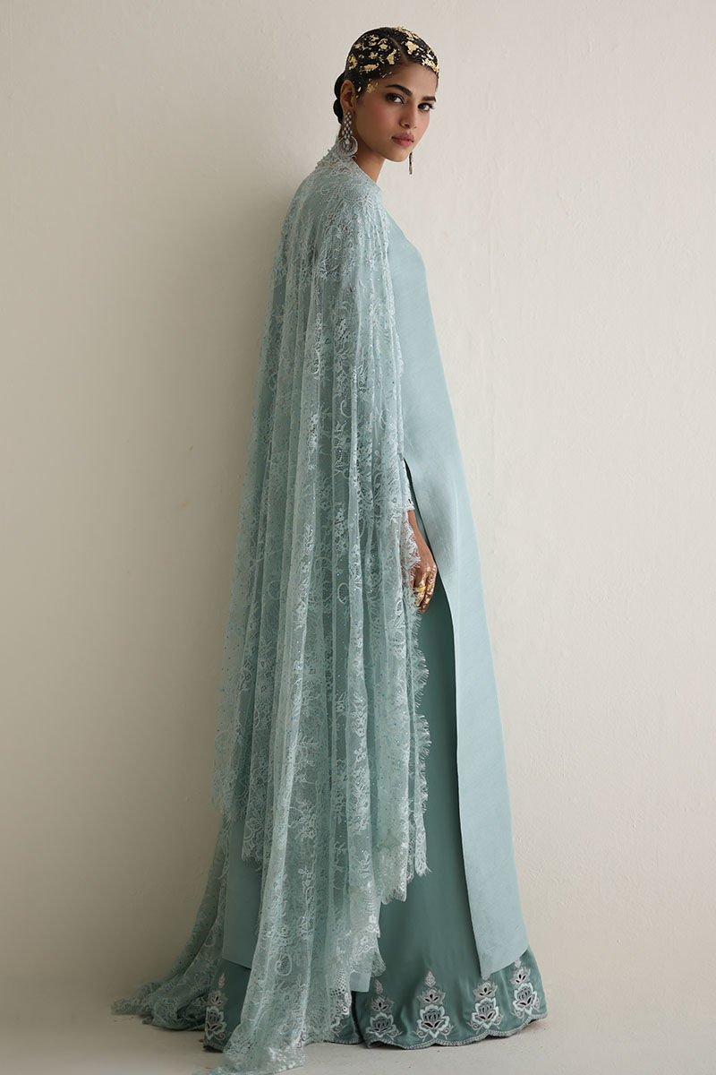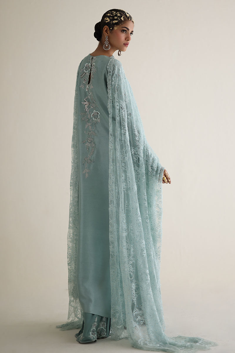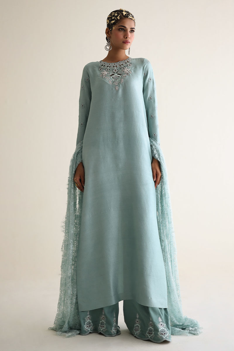 Introducing our bleached aqua pure raw Silk Straight Shirt, a vision of elegance and charm. Crafted from premium raw silk 80 gms, this shirt boasts exquisite embroidery featuring resham, zari, cutdana, tiki stones, and sequins on the front neck, back, and sleeves. Paired with candy crape culottes adorned with resham and zari embroidery on the bottom, this ensemble exudes sophistication. Complete the look with our Chantilly dupatta for an added touch of grace and finesse. The model's shirt length is 53.