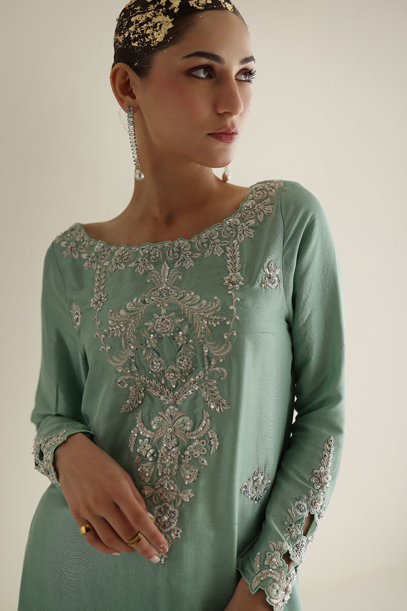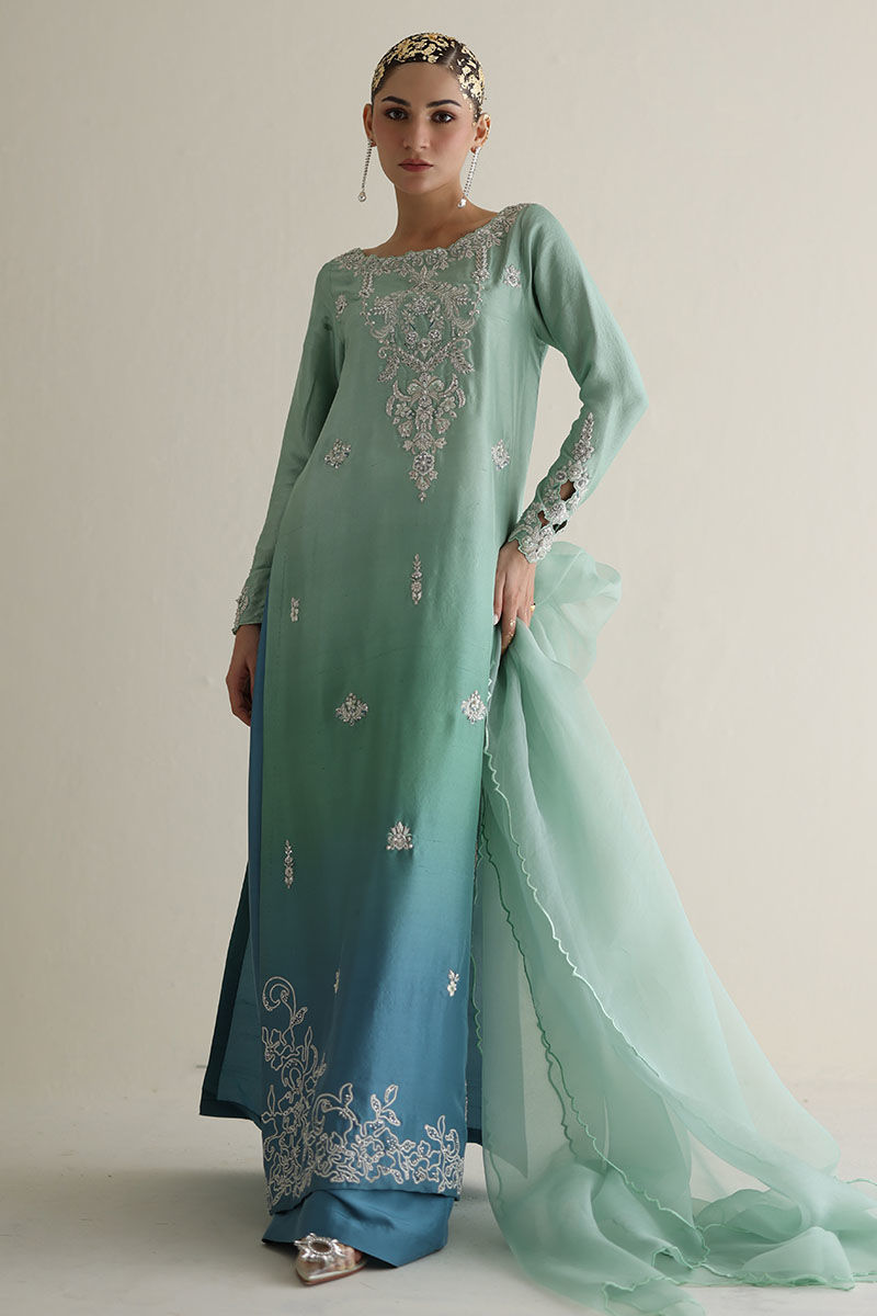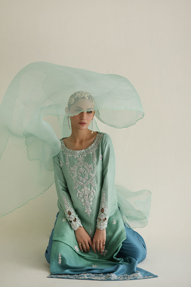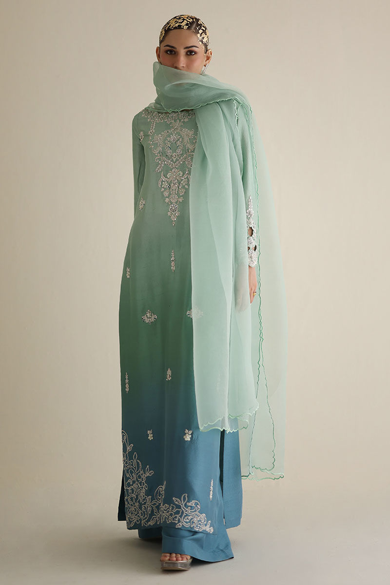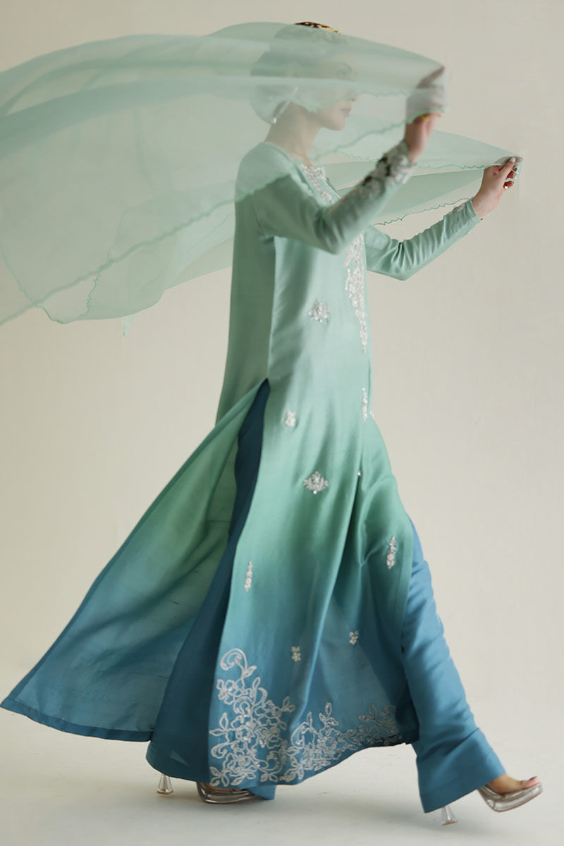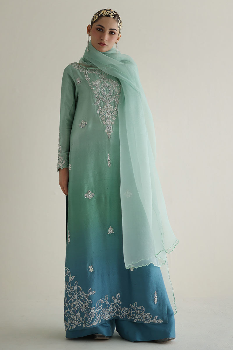 Introducing our Misty Jade ombre pure raw silk straight shirt, a fusion of sophistication and allure. Crafted from premium raw silk 80 gms, this shirt features intricate embroidery with resham, zari, cutdana, tiki stones, pearls, crystals, and sequins on the front and sleeves, adding a touch of opulence to your ensemble. Paired with pure raw silk culottes for a seamless look and complemented by a pure organza dupatta, this outfit exudes elegance and charm. Elevate your style with this stunning ensemble. The model's shirt length is 54.