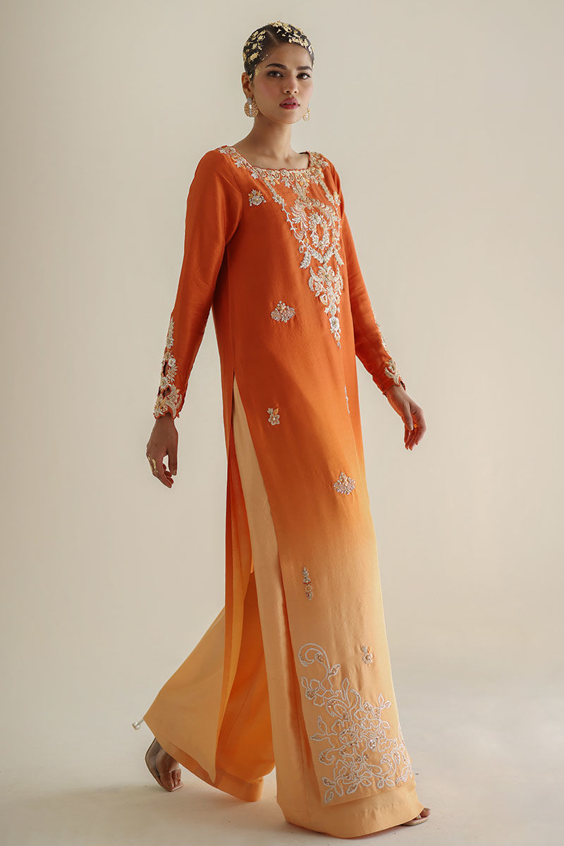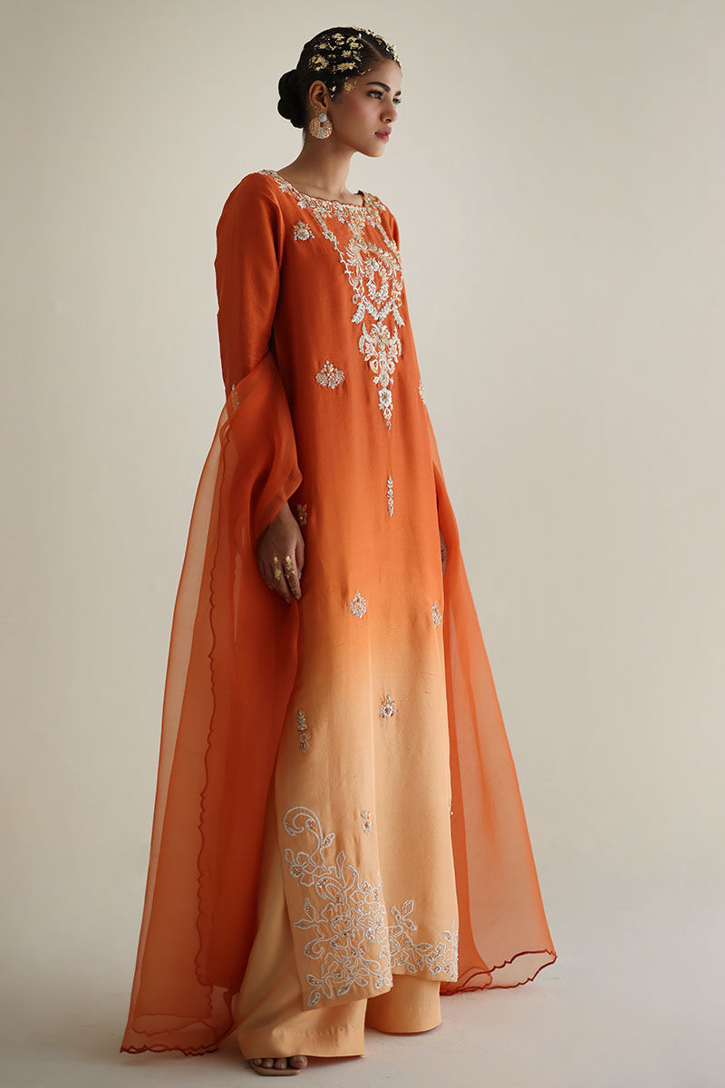 Introducing our apricot crush ombre pure raw silk straight shirt, a blend of grace and sophistication. Made from premium raw silk (80 gms), this shirt boasts exquisite embroidery with resham, zari, cutdana, tiki stones, pearls, crystals, and sequins adorning the front and sleeves, adding a touch of glamour to your attire. Accompanied by pure raw silk culottes for a flawless ensemble and paired with a pure organza dupatta, this outfit is the epitome of elegance and style. Elevate your wardrobe with this captivating ensemble. The model's shirt length is 54.