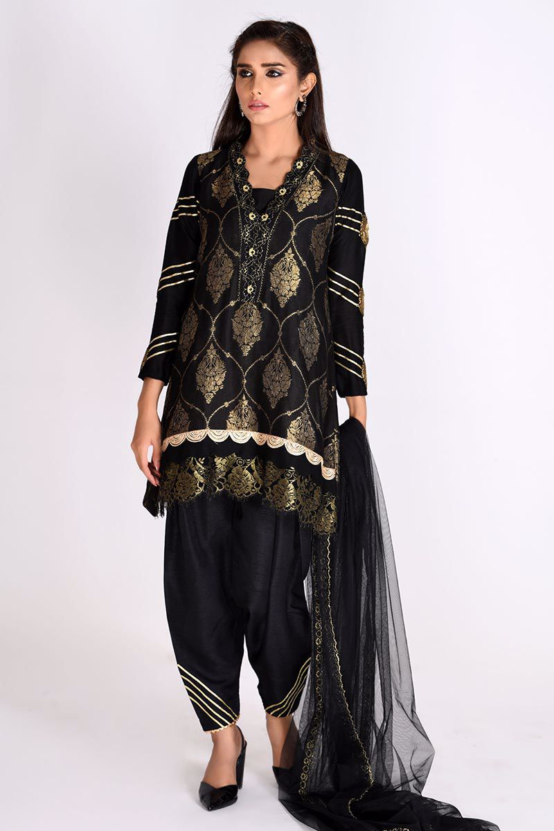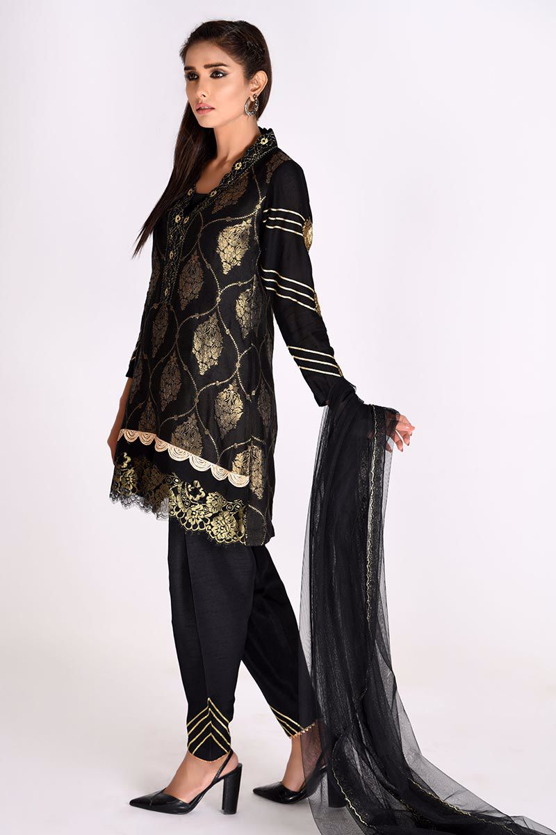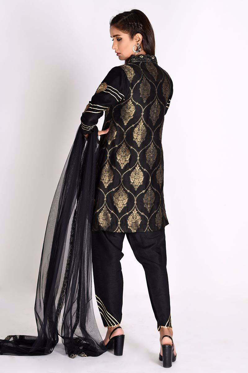 An exquisite piece of black and gold pure khadi banarsi detailed with chantilly nets and gota work. Styled with khari Shalwar and black net Dupatta with chantilly net finishing's. Dupatta and Shalwar can be purchased separately.