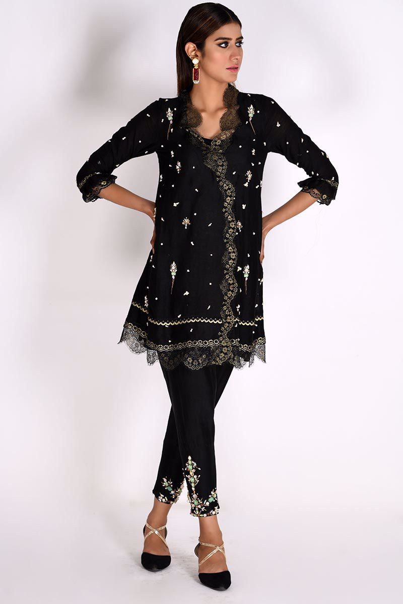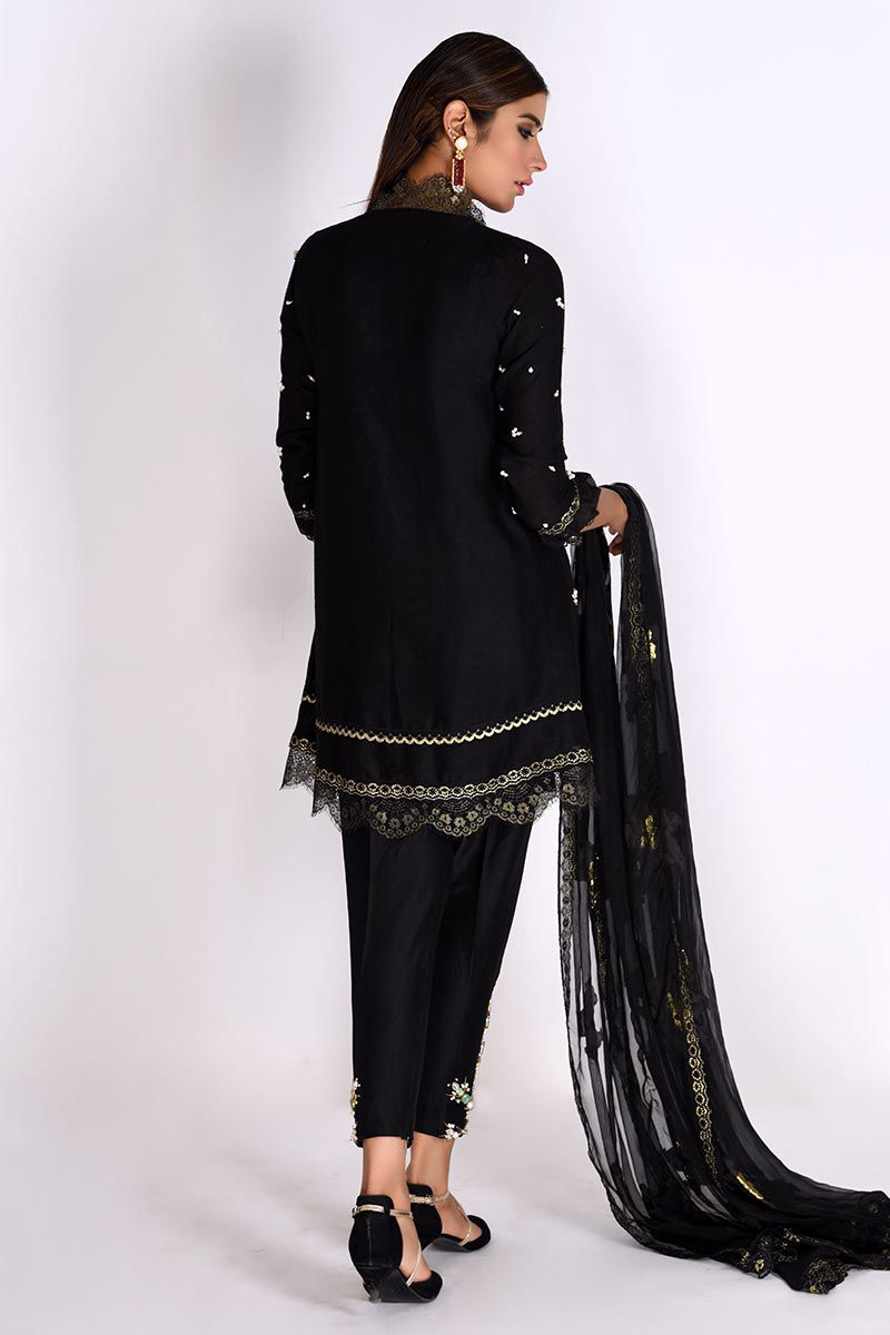 Timeless elegance is our Black pure khadi scallops Shirt, hand worked with stones, sequins, pearls, crystals, chains and cut dana. Finished with organza and chantilly net. Heavy hand worked straight Pants and pure chiffon brochette Dupatta with chantilly net edgings can bought separately to complete the look.