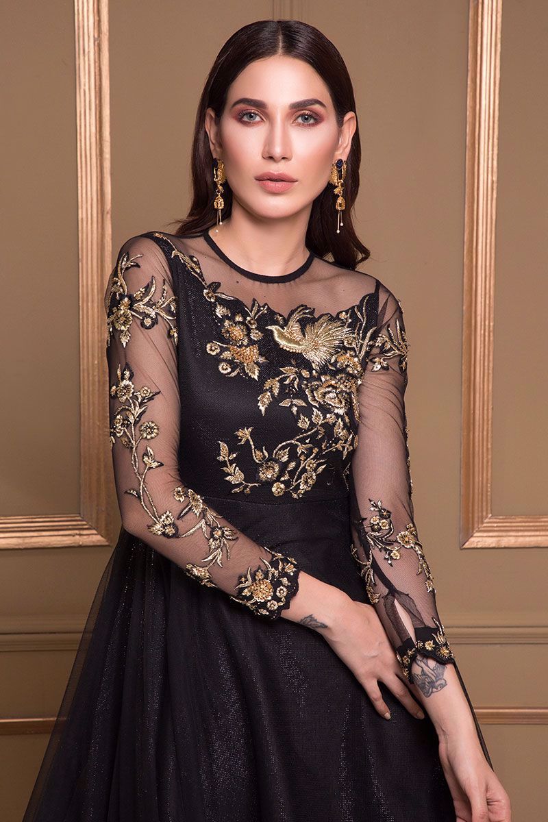Absolutely regal and classic black net gown with black glitter under layer tailored with fitted sleeves featuring intricate handwork of gold zardozi, thread zari, sequins, beads and crystals.