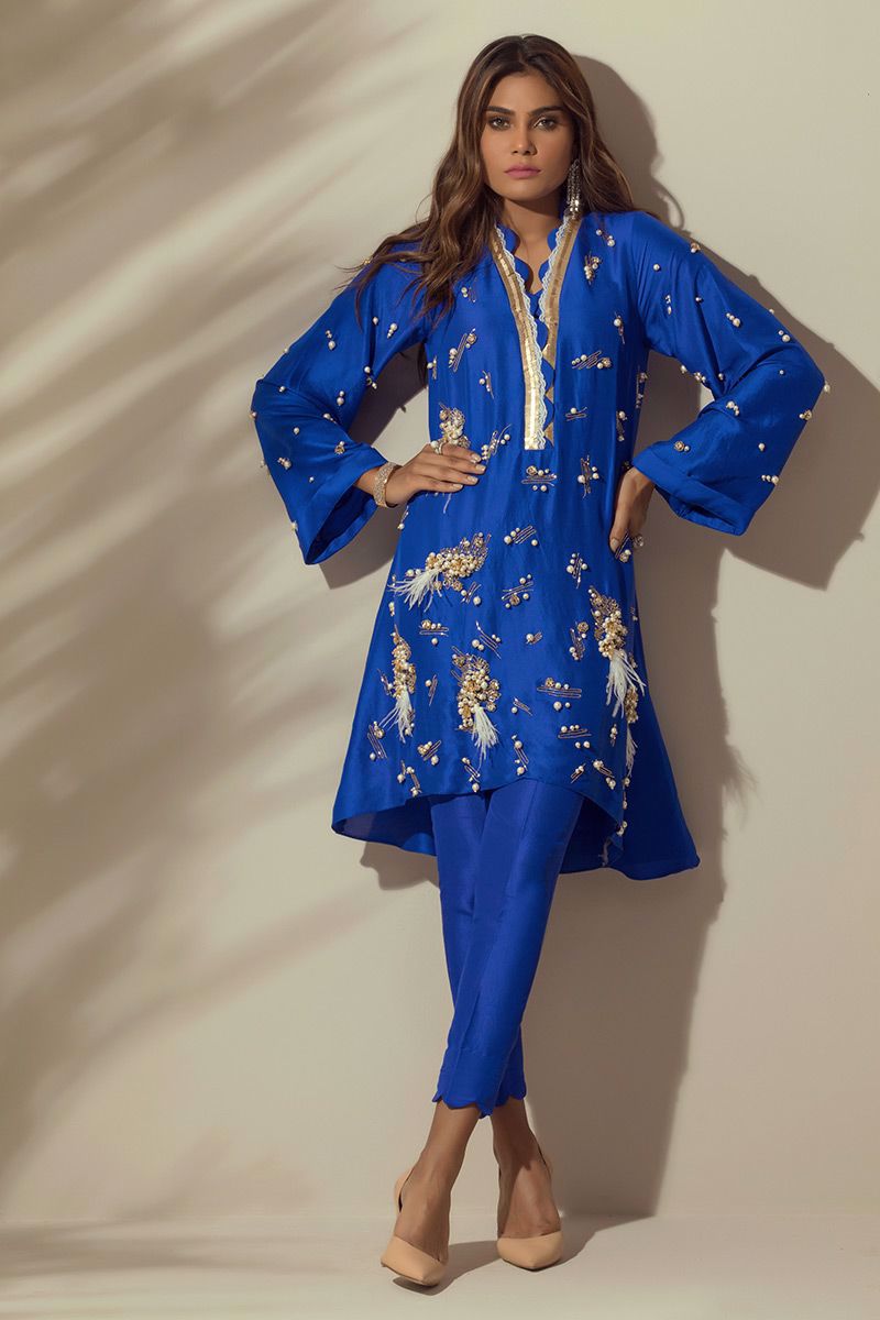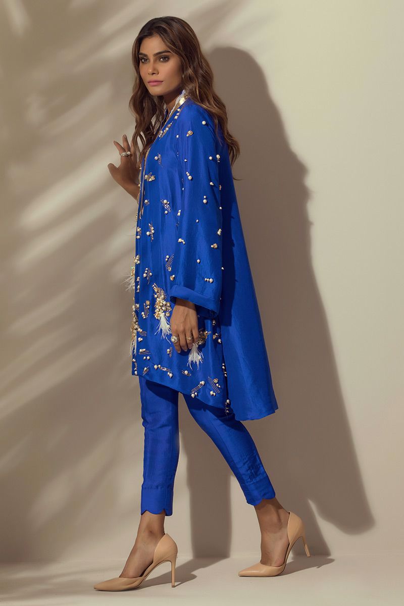 Electric Blue colored pure raw silk Top with all over hand worked bunches and Chan.