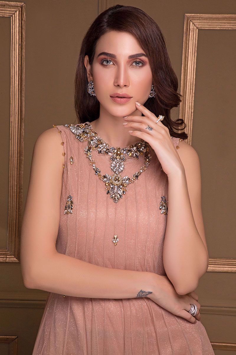 The most mesmerizing pale blush short net peplum with moonlight lining with innovative embellishments of jewel stones, tikki stones, crystals, finished jamawar pants with work on bottom will be provided with this top.