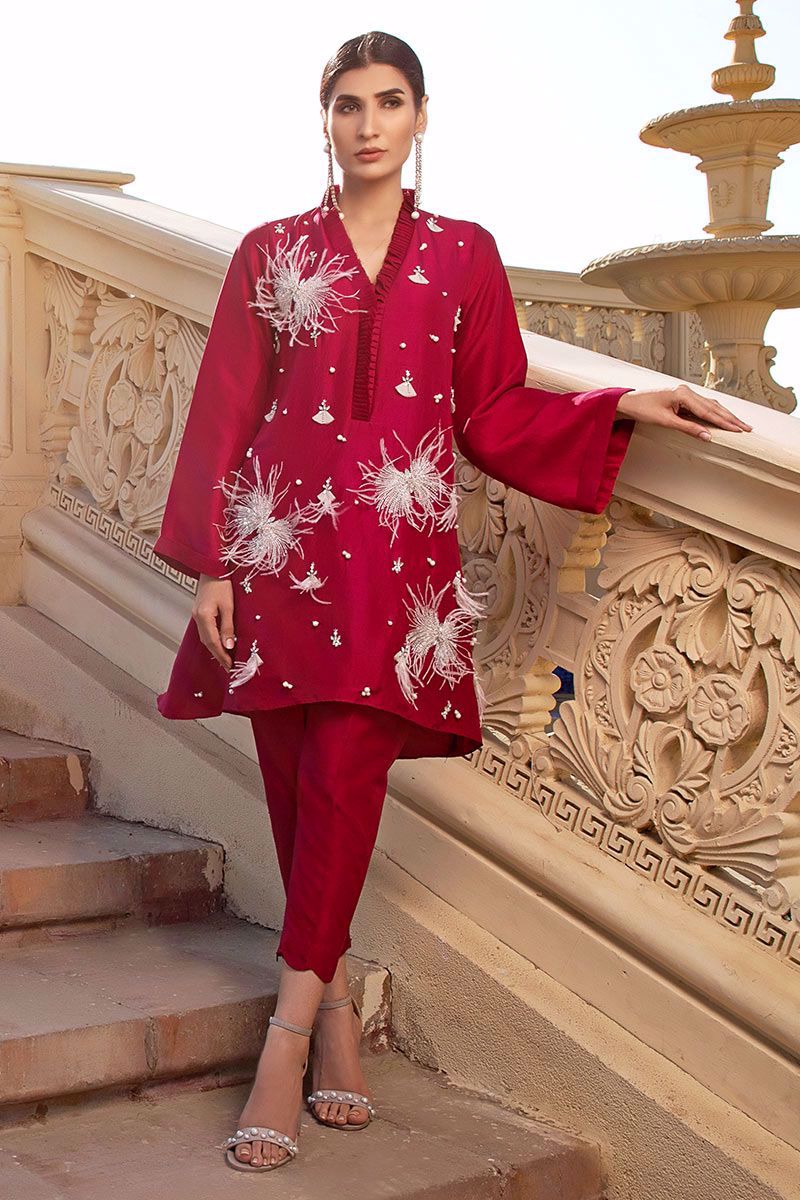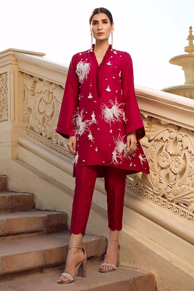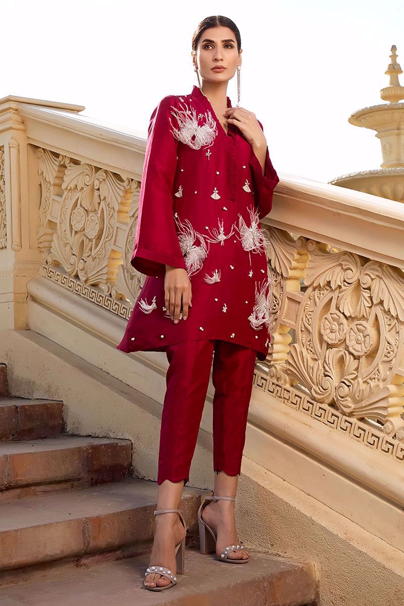 Swoon-worthy and delicately worked burgundy top in pure raw silk embellished with intricate stonework, pearls, embellishments, feathers, cut dana and net fabric manipulation finished with organza detailing's on the neck. Same color Pants can be bought separately to complete the look.