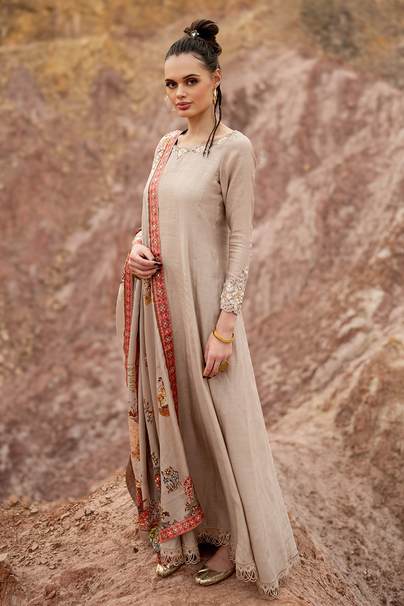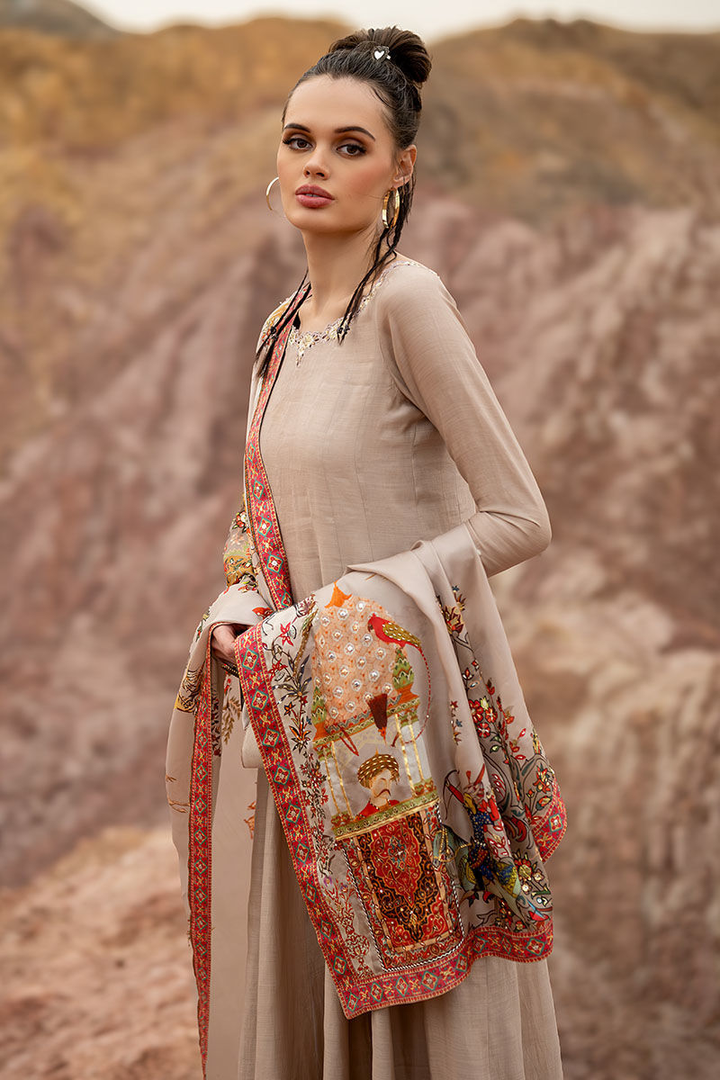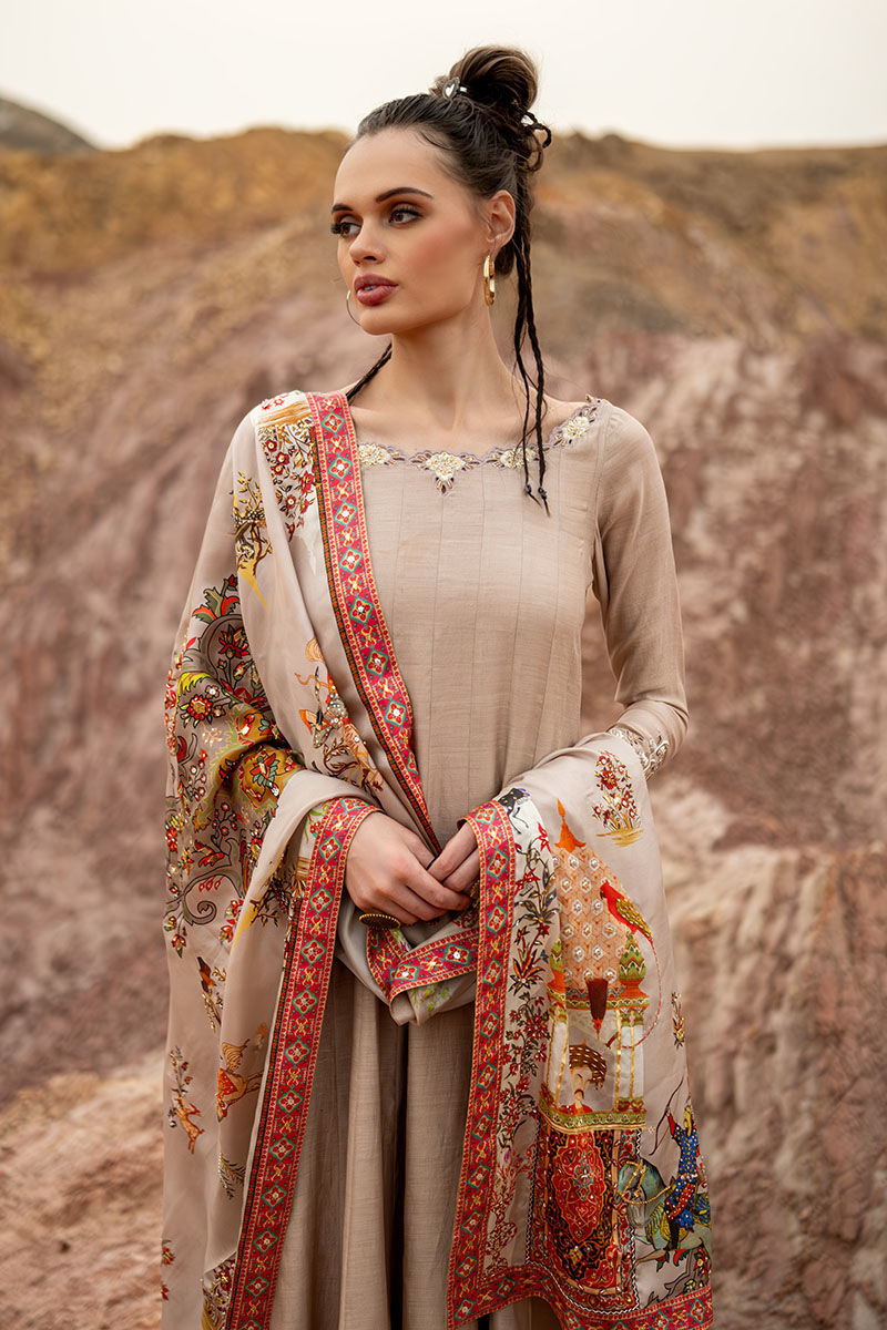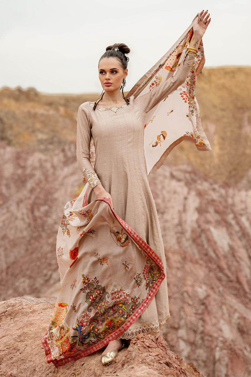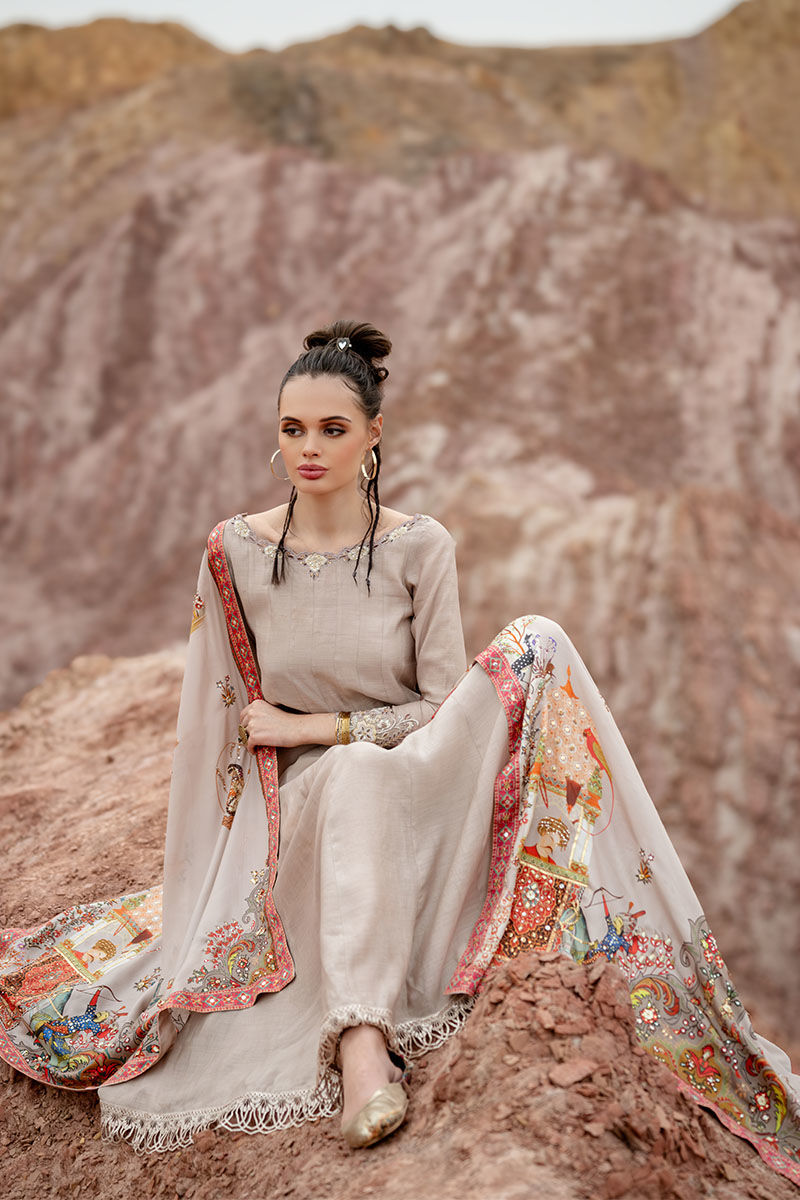 Introducing our captivating moonlight Kalidaar, meticulously crafted from 100% pure khaadi silk, adorned with intricate embroidery of resham, cutdana, sequence, tiki stone, and gota on the front and back, exuding opulence and sophistication. Paired with a Chaadar featuring a matching digital print with a Mughal-based theme, handworked with zardozi, gota, dabka, tikki stone, naqshi, and pearls, this ensemble captures the essence of timeless elegance and luxury. Elevate your wardrobe with this exquisite ensemble, perfect for adding a touch of regal charm to any occasion.