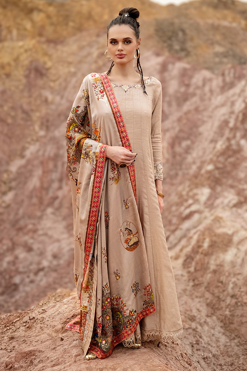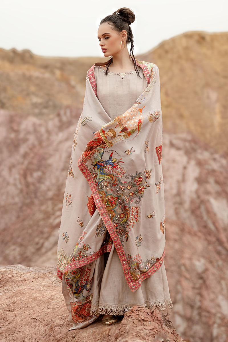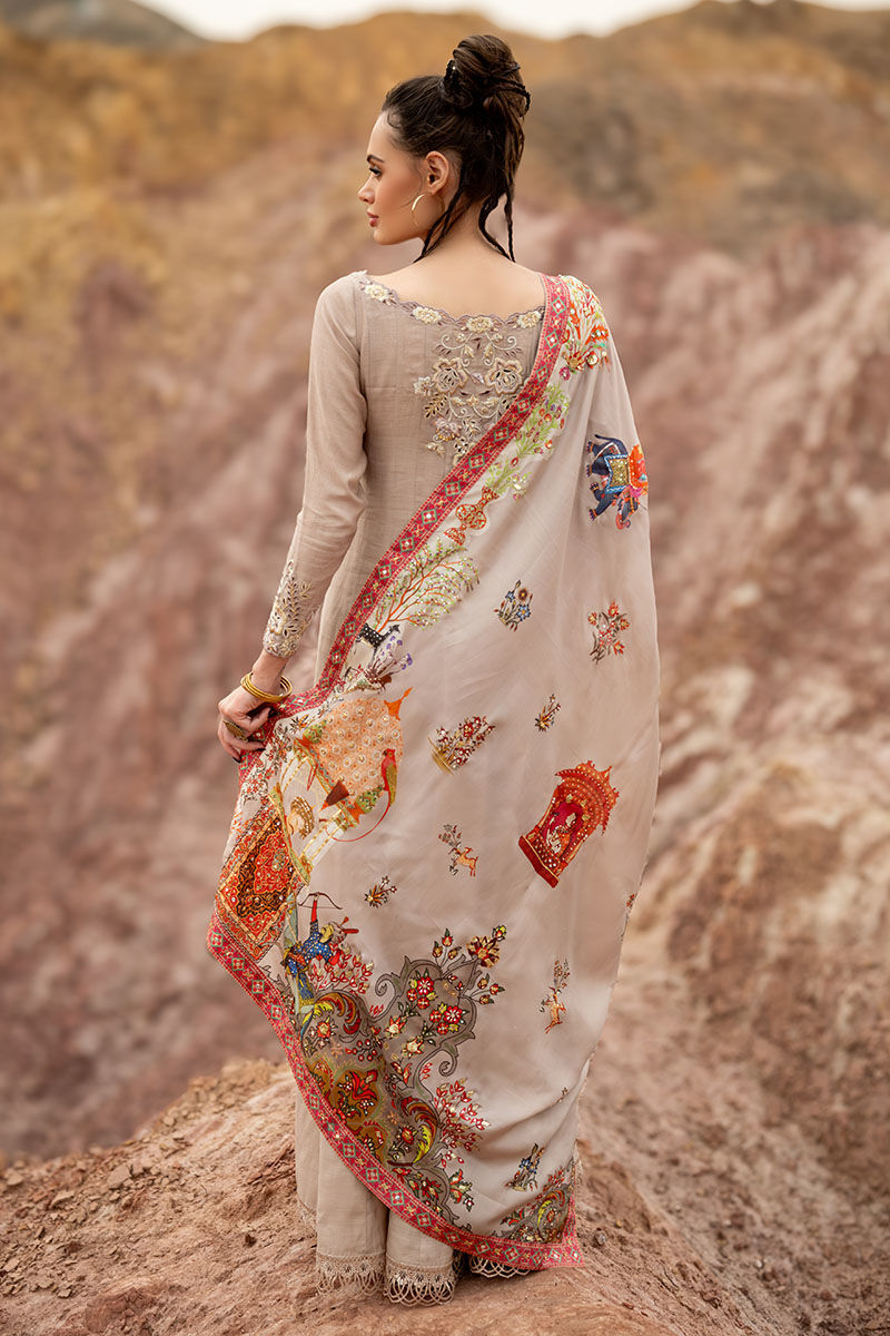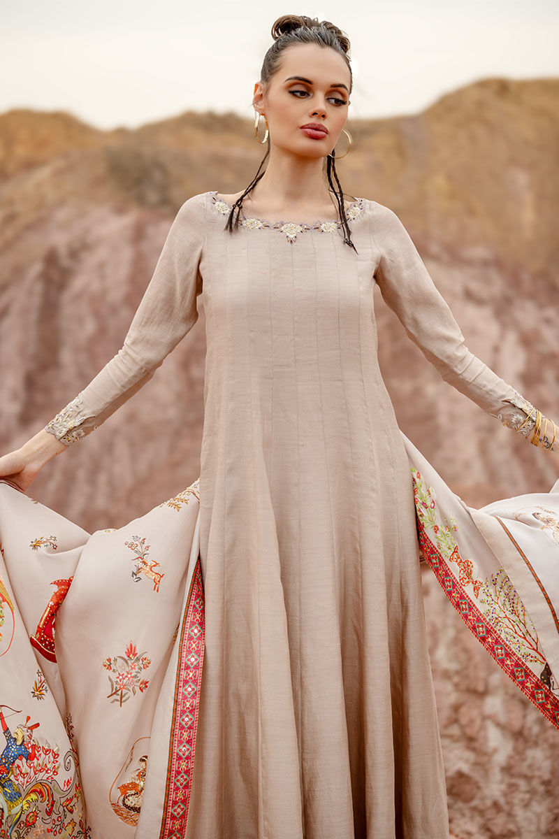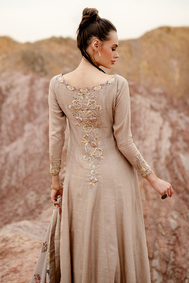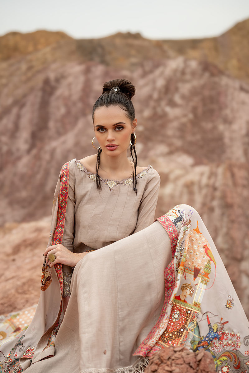 Introducing our captivating moonlight Kalidaar, meticulously crafted from 100% pure khaadi silk, adorned with intricate embroidery of resham, cutdana, sequence, tiki stone, and gota on the front and back, exuding opulence and sophistication. Paired with a Chaadar featuring a matching digital print with a Mughal-based theme, handworked with zardozi, gota, dabka, tikki stone, naqshi, and pearls, this ensemble captures the essence of timeless elegance and luxury. Elevate your wardrobe with this exquisite ensemble, perfect for adding a touch of regal charm to any occasion.