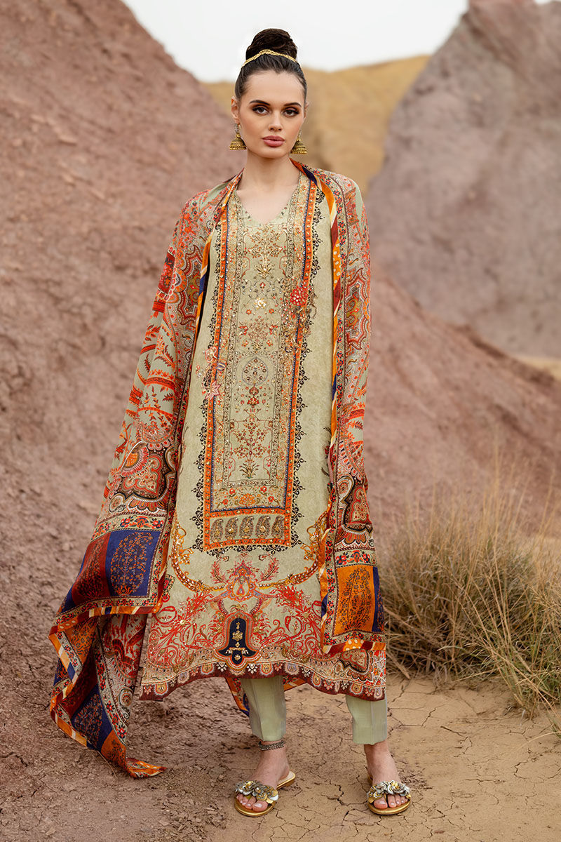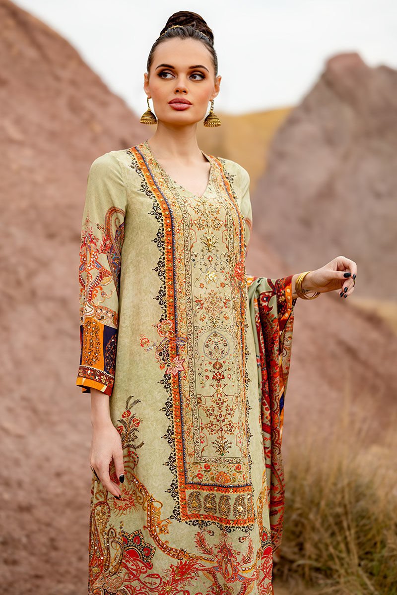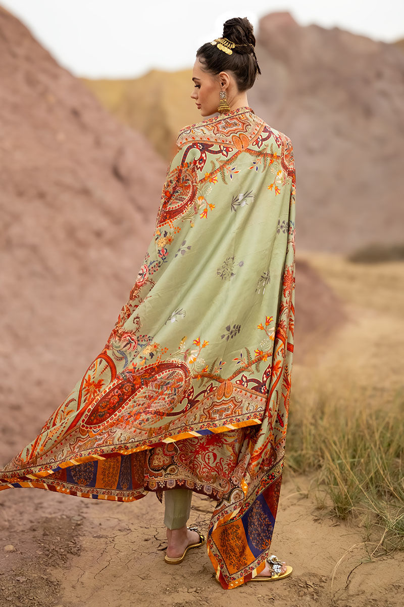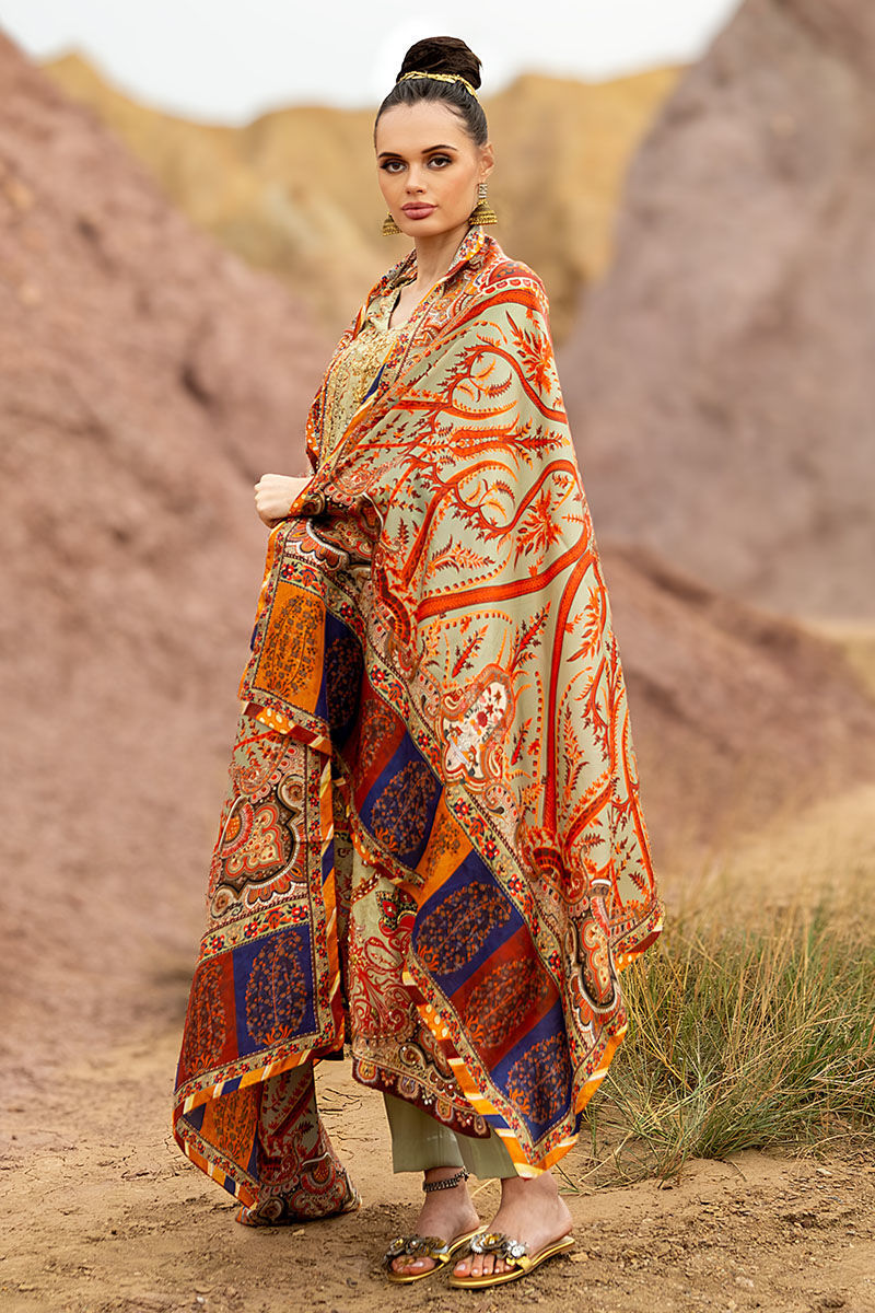 Introducing our enchanting shirt and dupatta set in the serene hue of nile green. The shirt, crafted from 100% pure crepe silk, embodies luxury and comfort, while the medium silk dupatta adds a touch of elegance to the ensemble. Adorned with a captivating digital print inspired by Mughal and Kashmiri themes, both pieces feature intricate detailing with gota, sequence, tiki stones, pearls, kora, dabka, and naqshi. Elevate your style with this exquisite set that combines tradition with modern sophistication. The model's shirt length is 47.