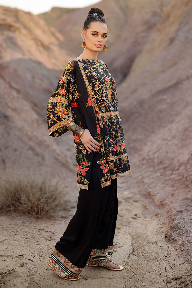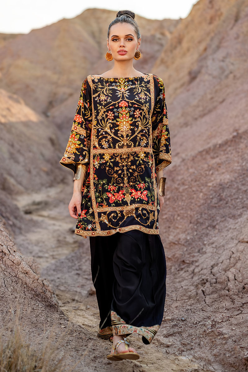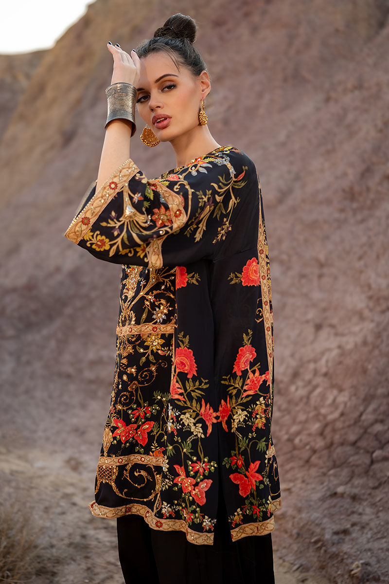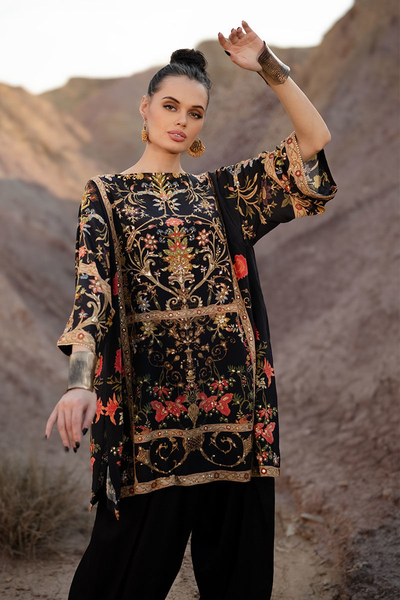 Introducing our black shirt and shalwar, crafted from 100% pure crepe silk for luxurious comfort and elegance. The shirt boasts a captivating digital print inspired by mughal and kashmiri themes, adorned with intricate embellishments including gota, sequence, tiki stones, pearls, kora, dabka, and naqshi. Paired with a semi-pure shalwar featuring a printed border and gota detailing, this set offers both sophistication and style. It’s perfect for adding a touch of understated luxury to your wardrobe. The model's shirt length is 33.5.