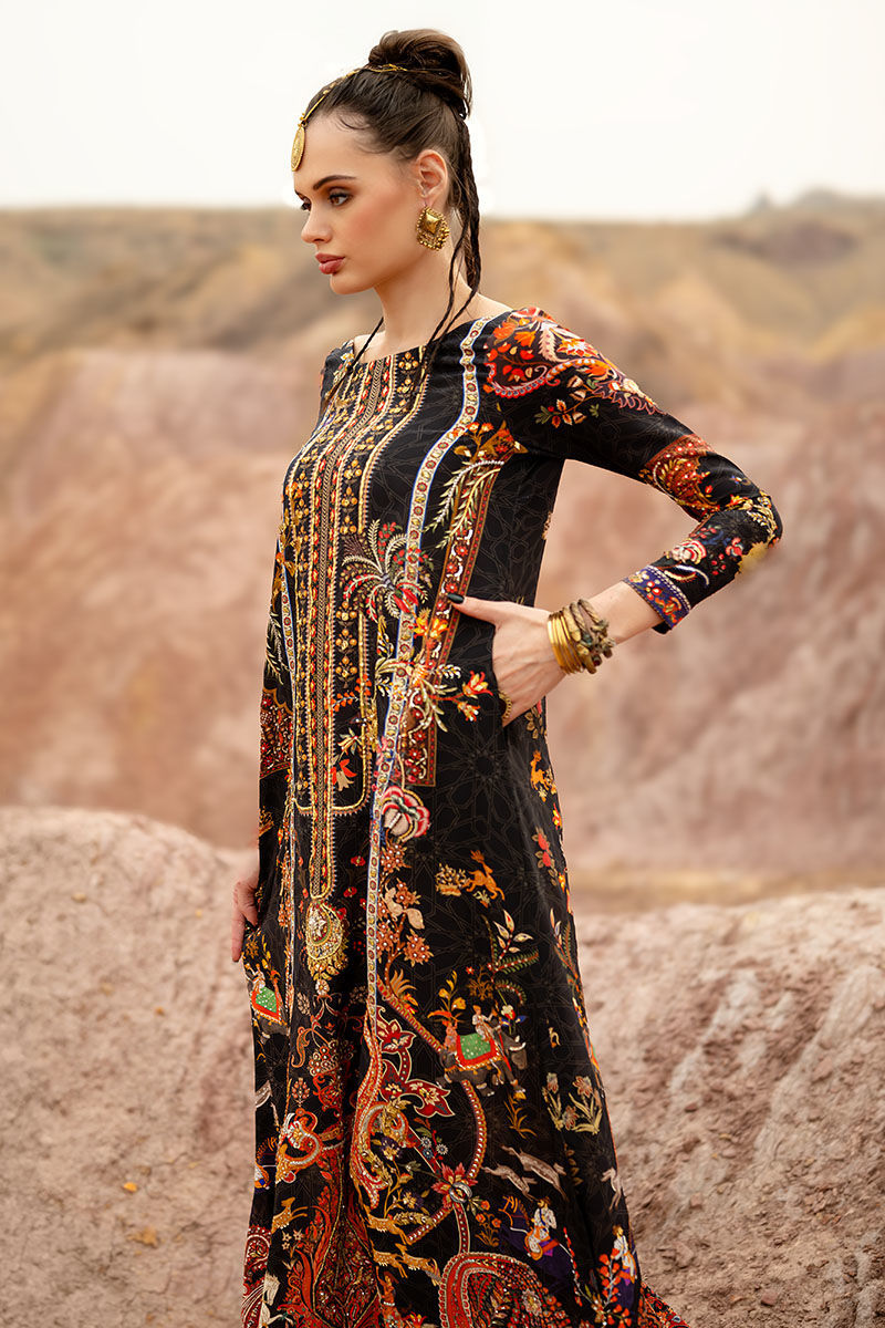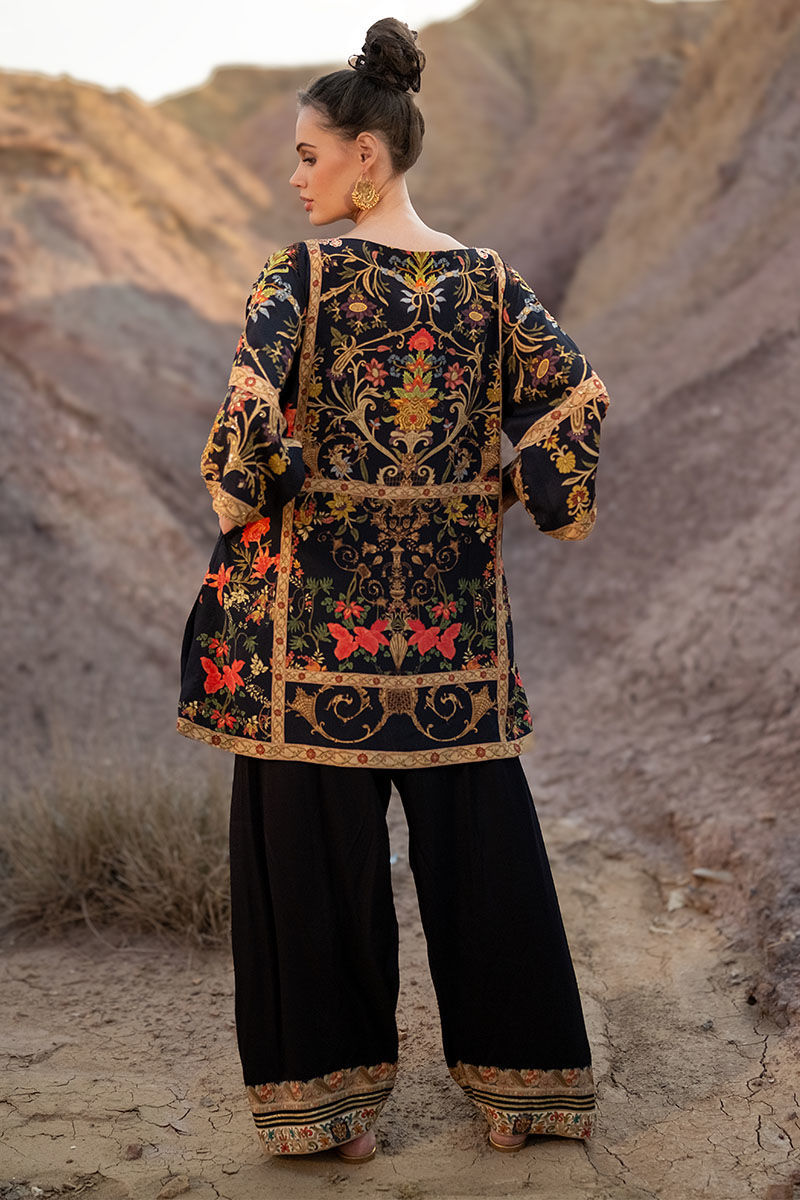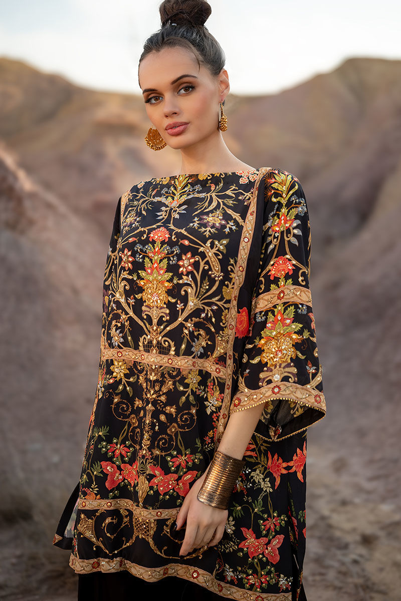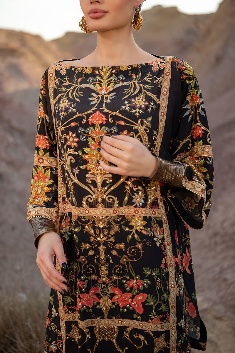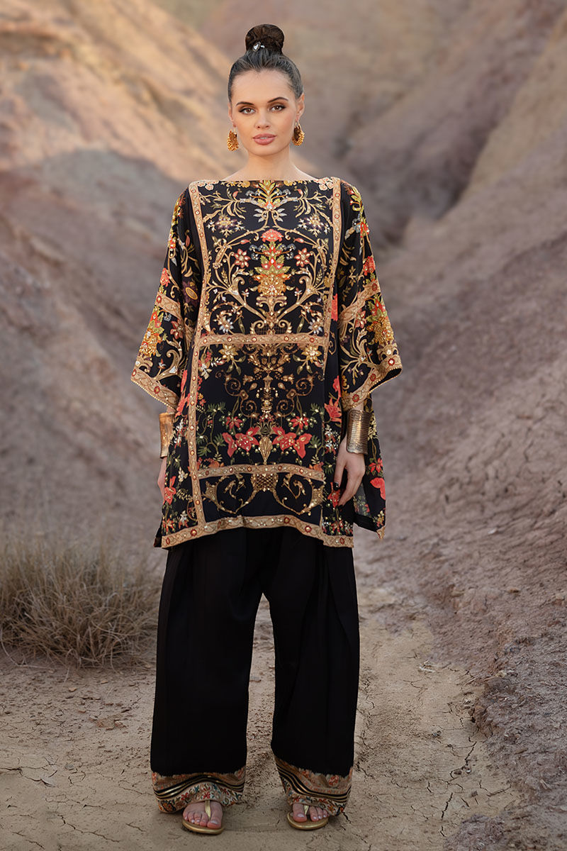 Introducing our black shirt and shalwar, crafted from 100% pure crepe silk for luxurious comfort and elegance. The shirt boasts a captivating digital print inspired by mughal and kashmiri themes, adorned with intricate embellishments including gota, sequence, tiki stones, pearls, kora, dabka, and naqshi. Paired with a semi-pure shalwar featuring a printed border and gota detailing, this set offers both sophistication and style. It’s perfect for adding a touch of understated luxury to your wardrobe. The model's shirt length is 33.5.