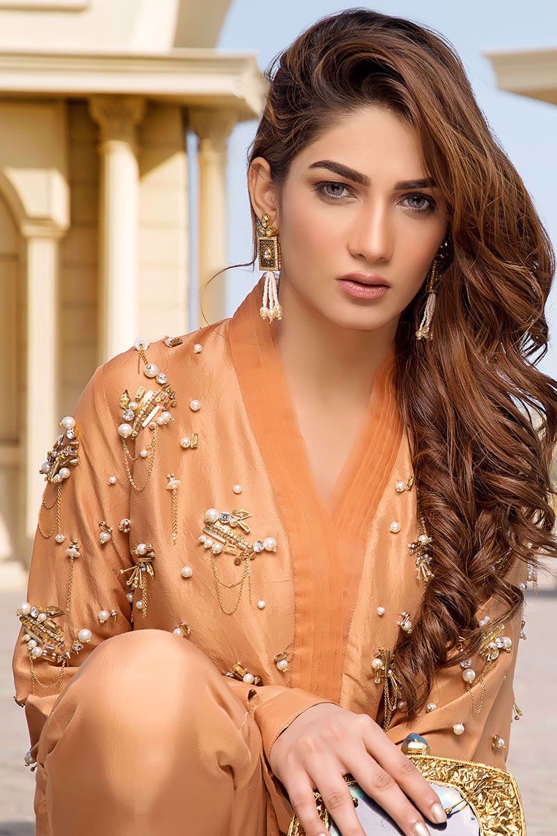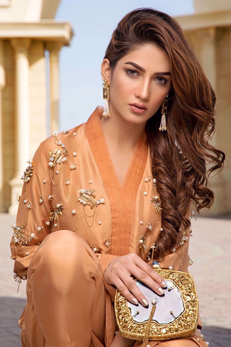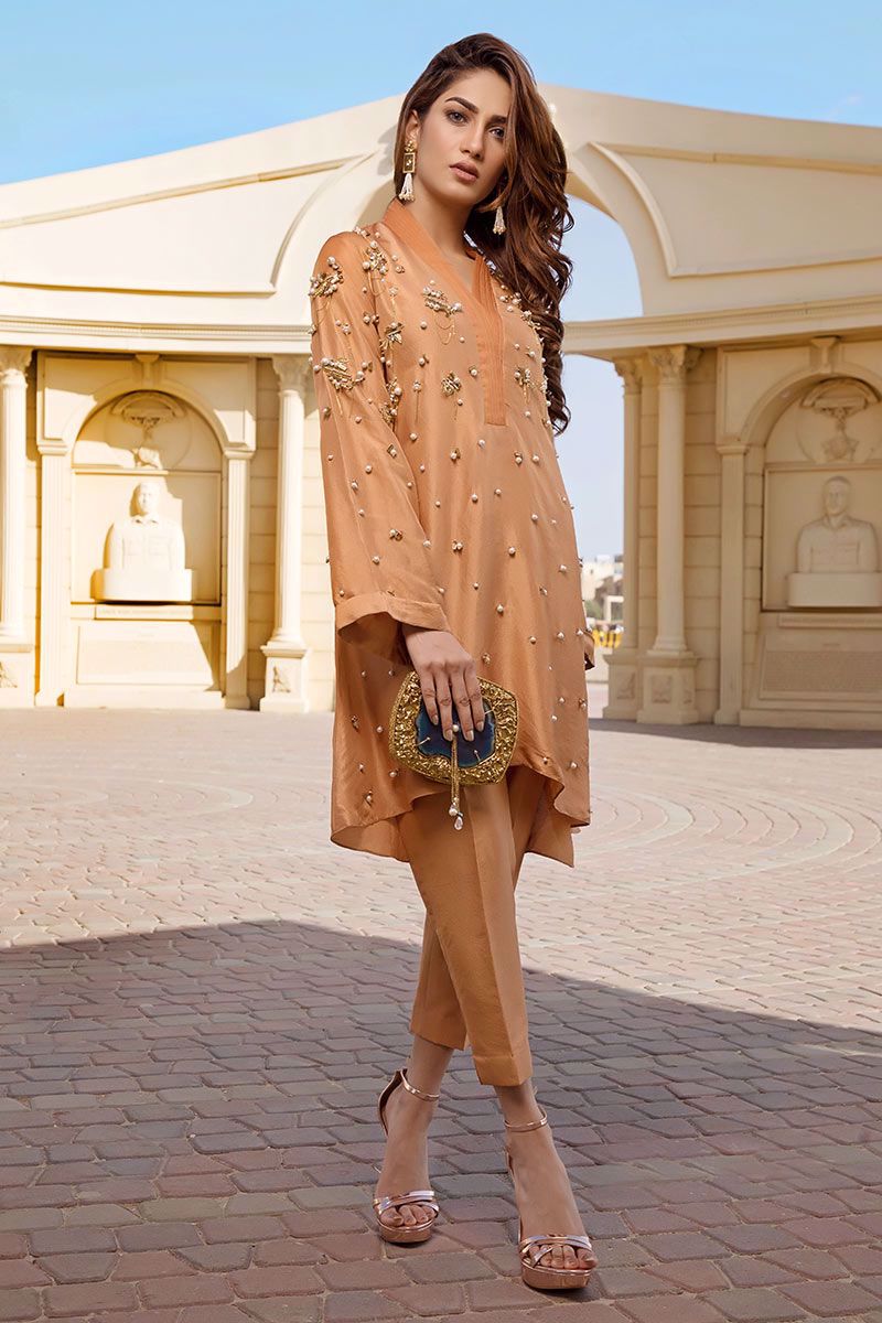 Iridescent and luminous nude peach top in pure raw silk beautifully crafted with metallic embellishments, pearls, stones, cut dana, beads and metallic chains finished with organza detailing's on neckline. Nude Peach Pants can be bought separately to complete the look.