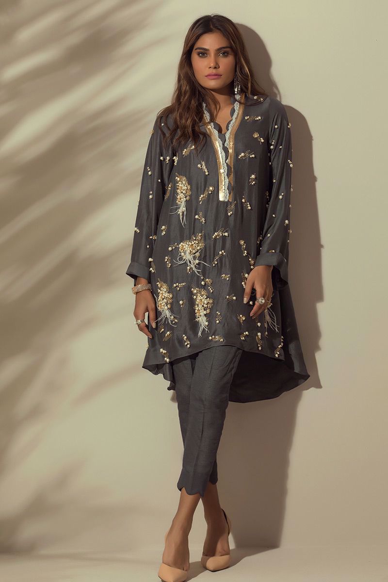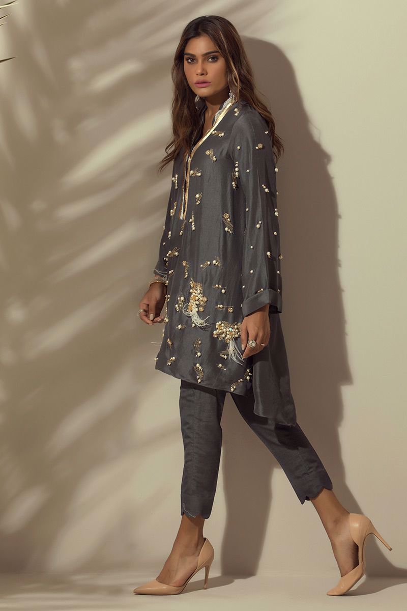Charcoal Grey colored pure raw silk Top with all over hand worked bunches and Chan.