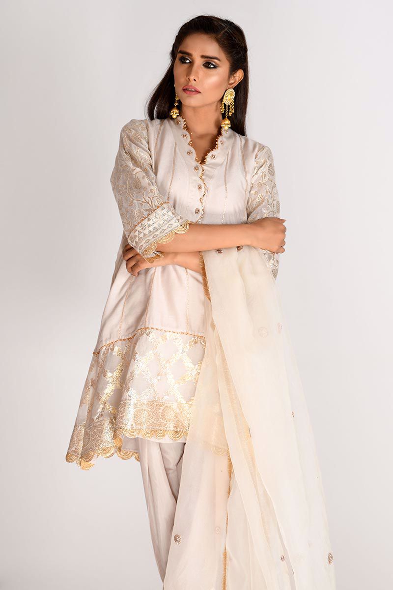 Classic Ivory kalidar pure khadi Dress bringing back traditional silhouettes with innovative handcrafted gota embroideries on neckline and sleeves styled with gota work embellished khari Shalwar and luxury organza Dupatta detailed with gotta work. Dupatta and Shalwar can be purchased separately.
