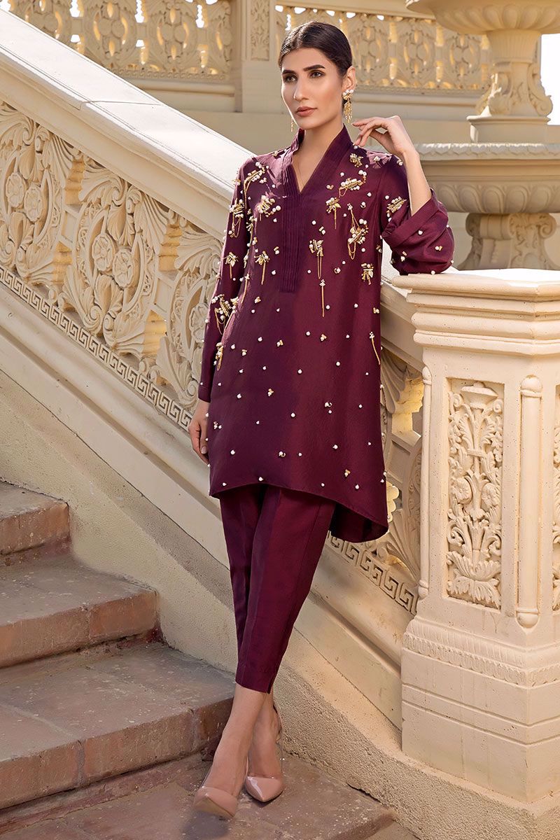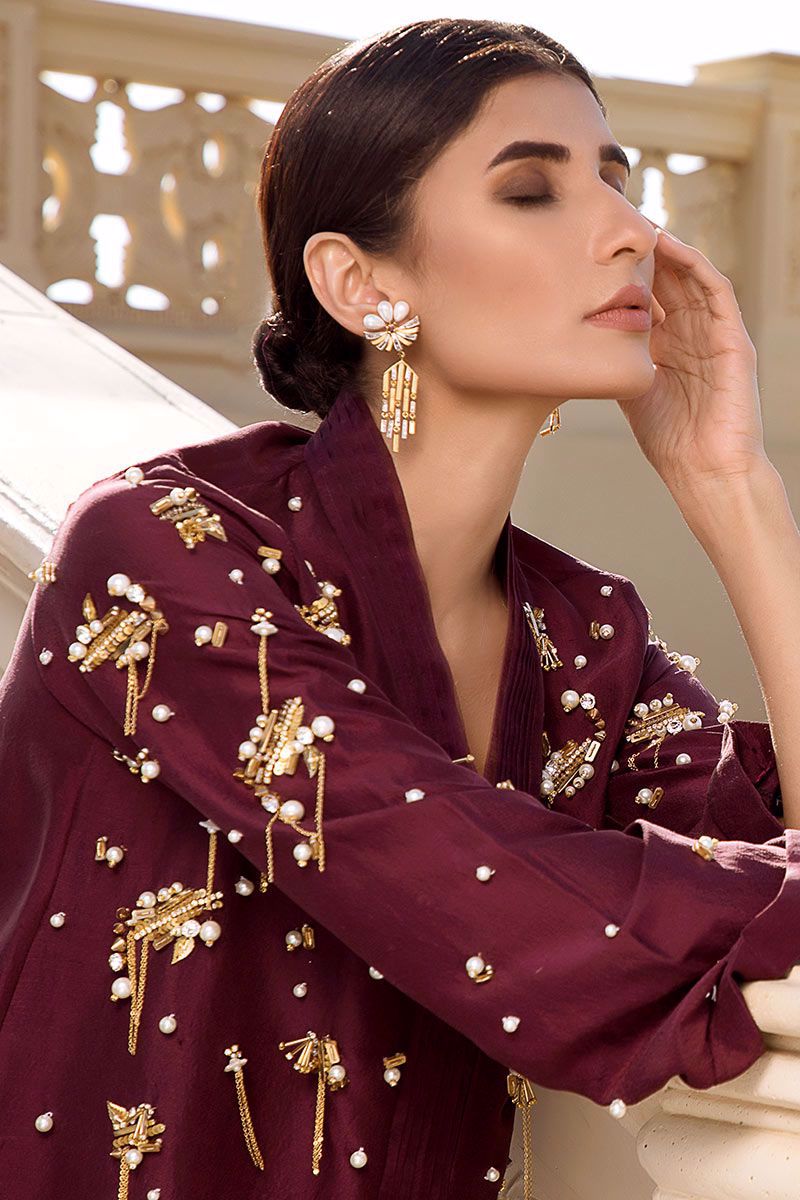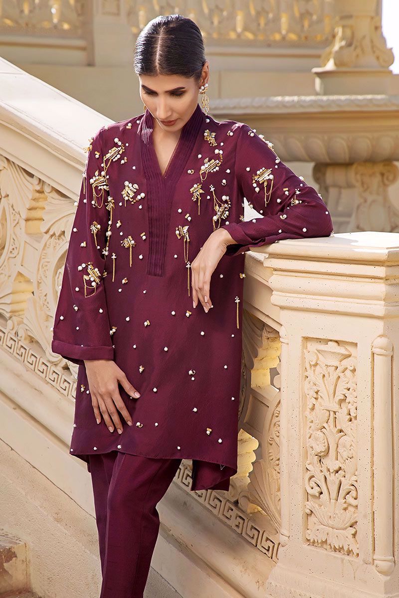 Iridescent and luminous deep plum top in pure raw silk beautifully crafted with metallic embellishments, pearls, stones, cut dana, beads and metallic chains finished with organza detailing's on the neckline. Deep plum Pants can be bought separately to complete the look.