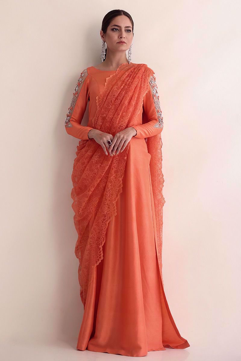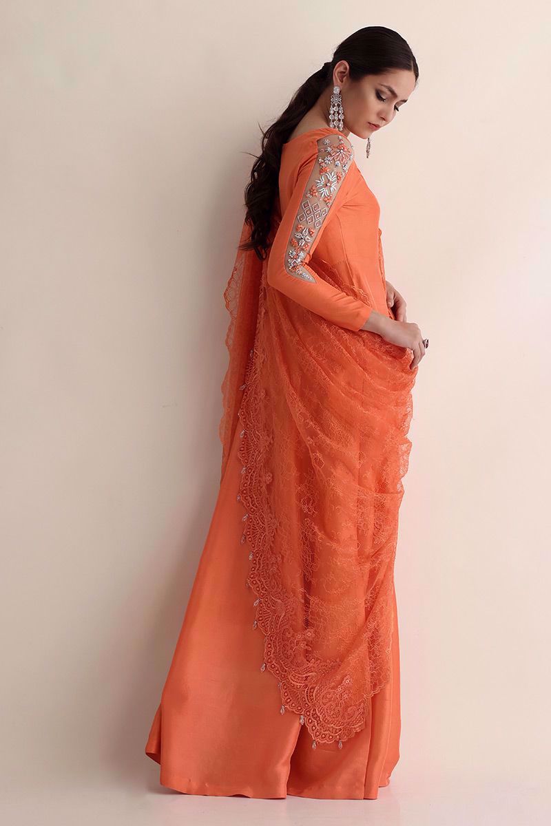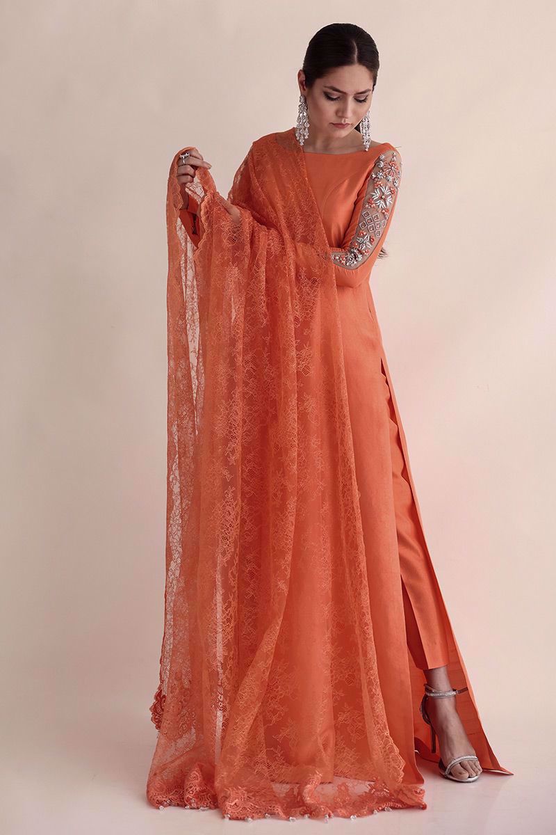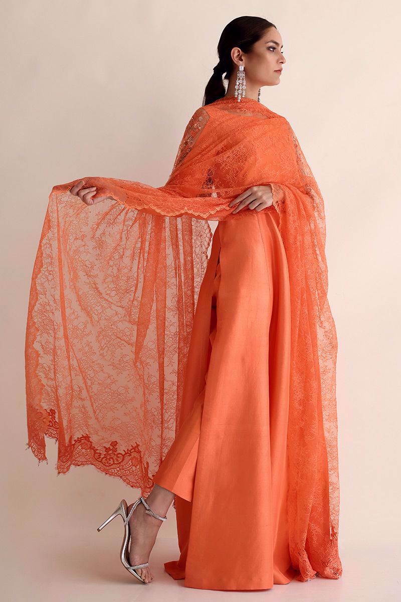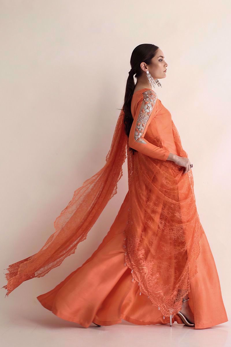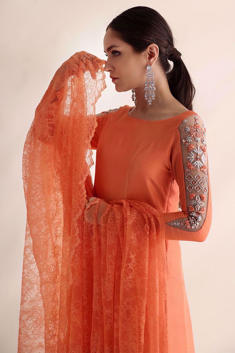 Breathtaking Salmon peach raw silk bodice style, long length with high slits ensemble is designed with extra ordinary detailed embroidered sleeves paired with same colour pure raw silk pants and an oversize long Chantilly dupatta has been provided to drape in multiple ways to make this outfit from classy to trendy looks for different occasions.