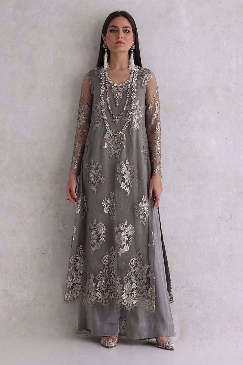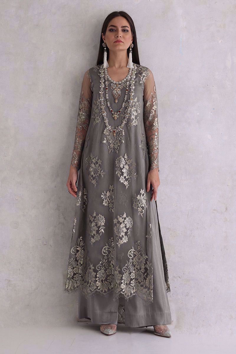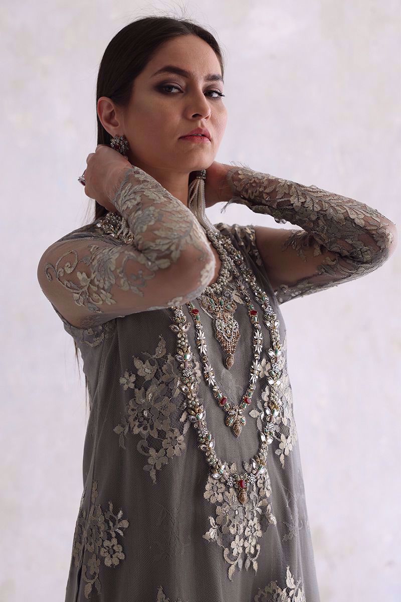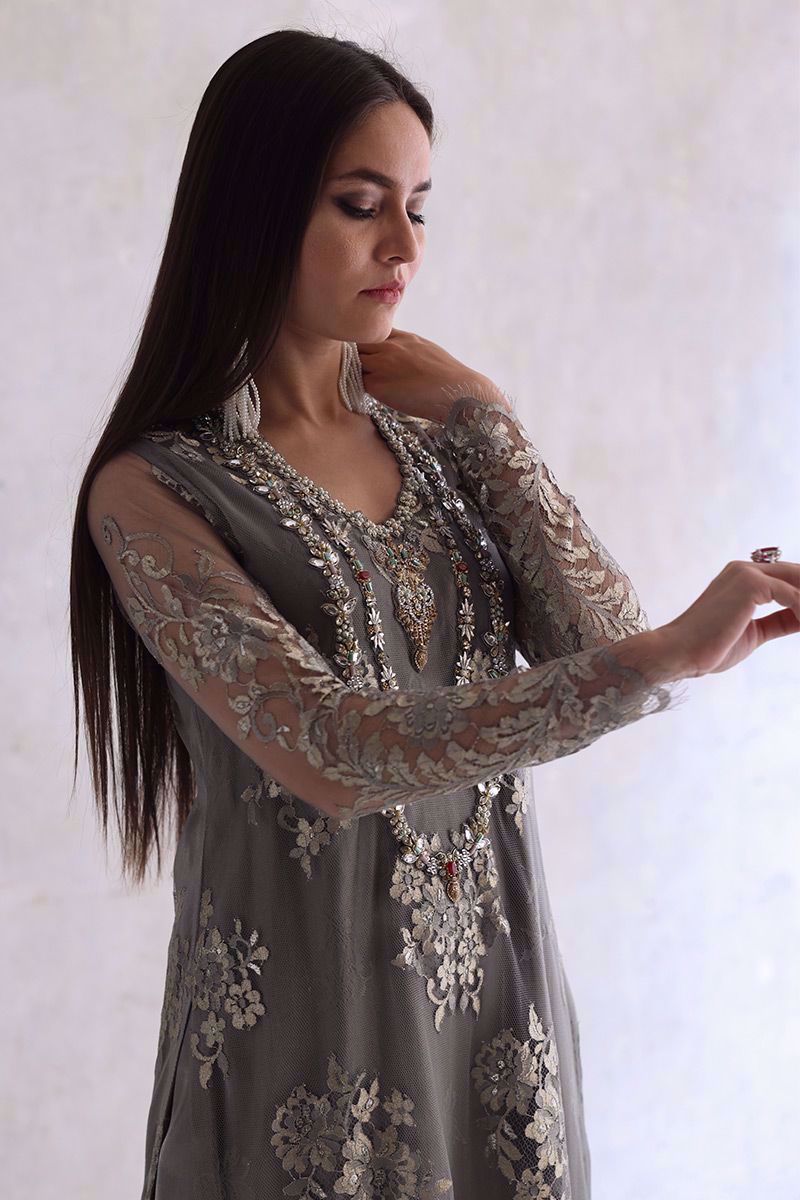 Elegance added to the evening with this moon rock coloured Chantilly long shirt. The elaborated jewels work on neckline giving it the look of heavy royal necklace. The look is finished off with same color shimmer silk culottes and pure organza scalloped dupatta.