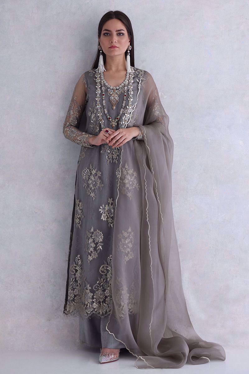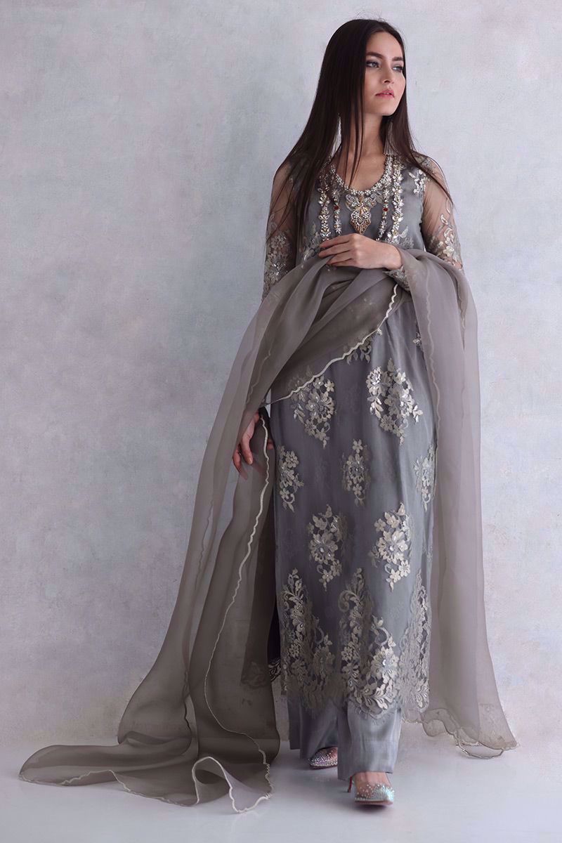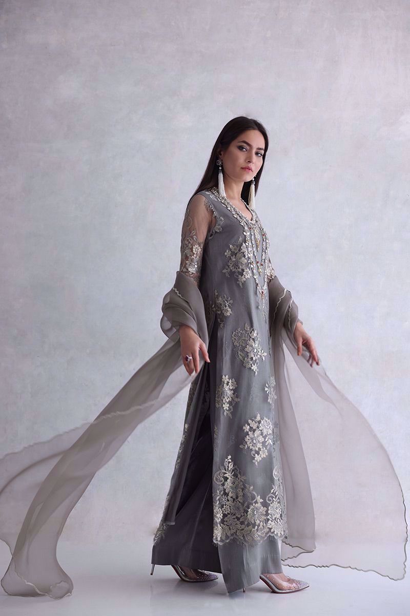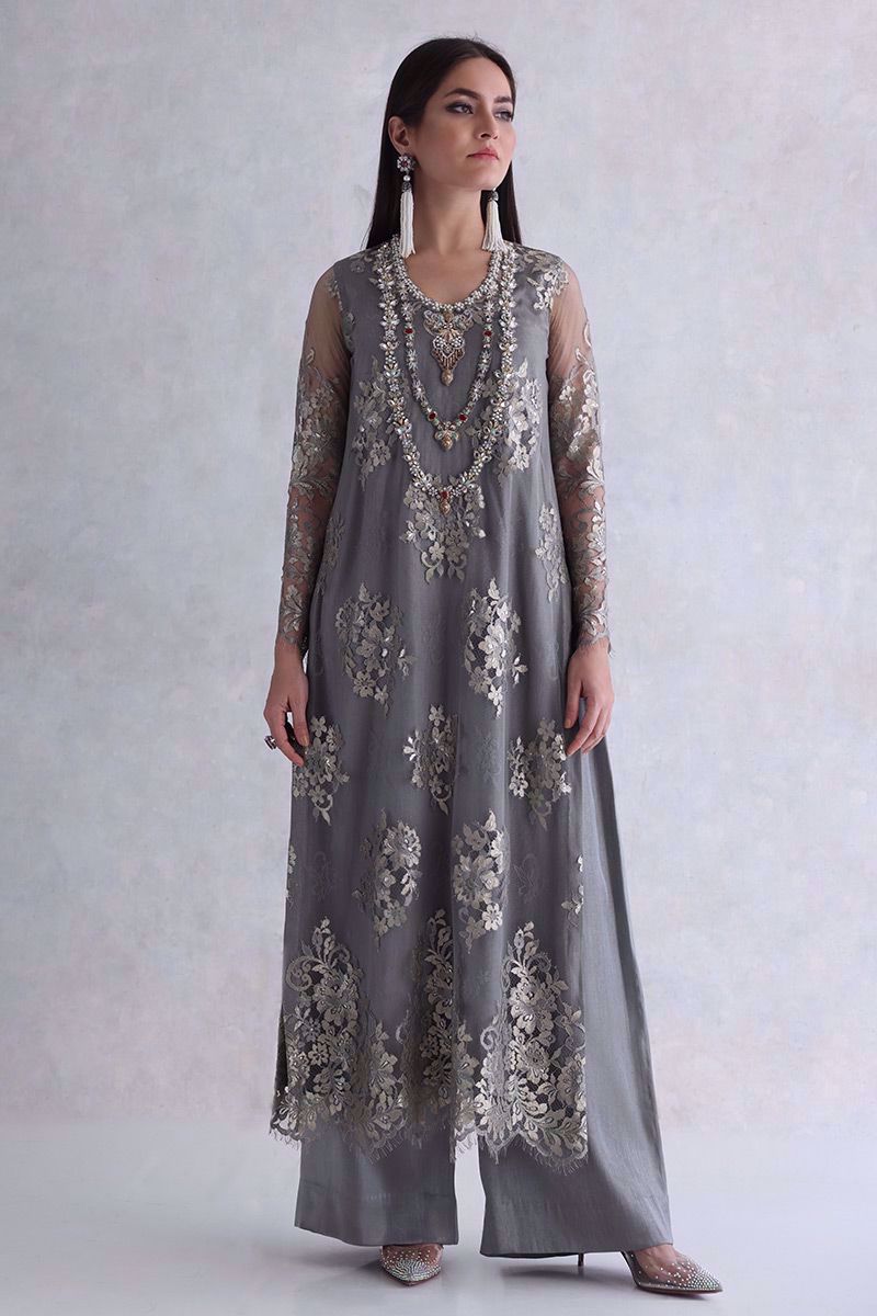 Elegance added to the evening with this moon rock coloured Chantilly long shirt. The elaborated jewels work on neckline giving it the look of heavy royal necklace. The look is finished off with same color shimmer silk culottes and pure organza scalloped dupatta.