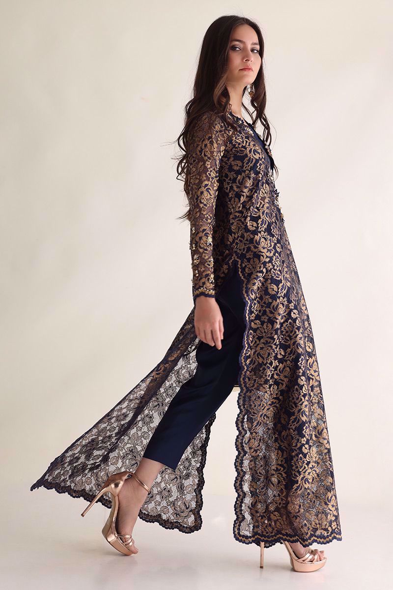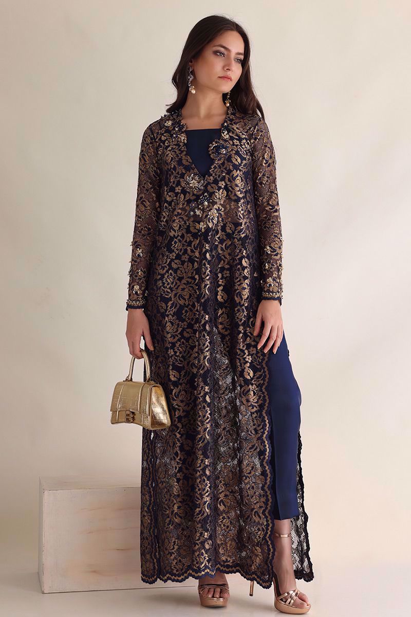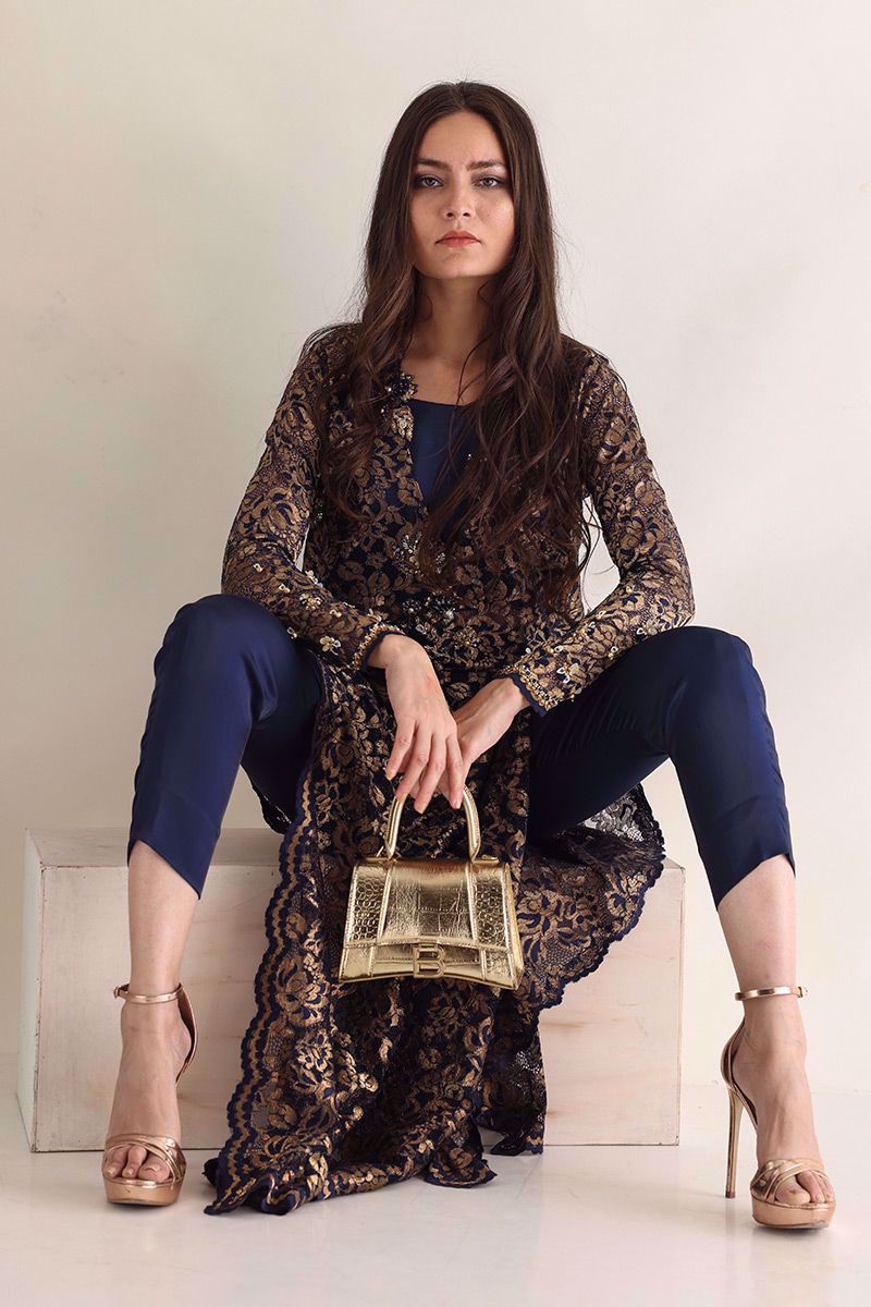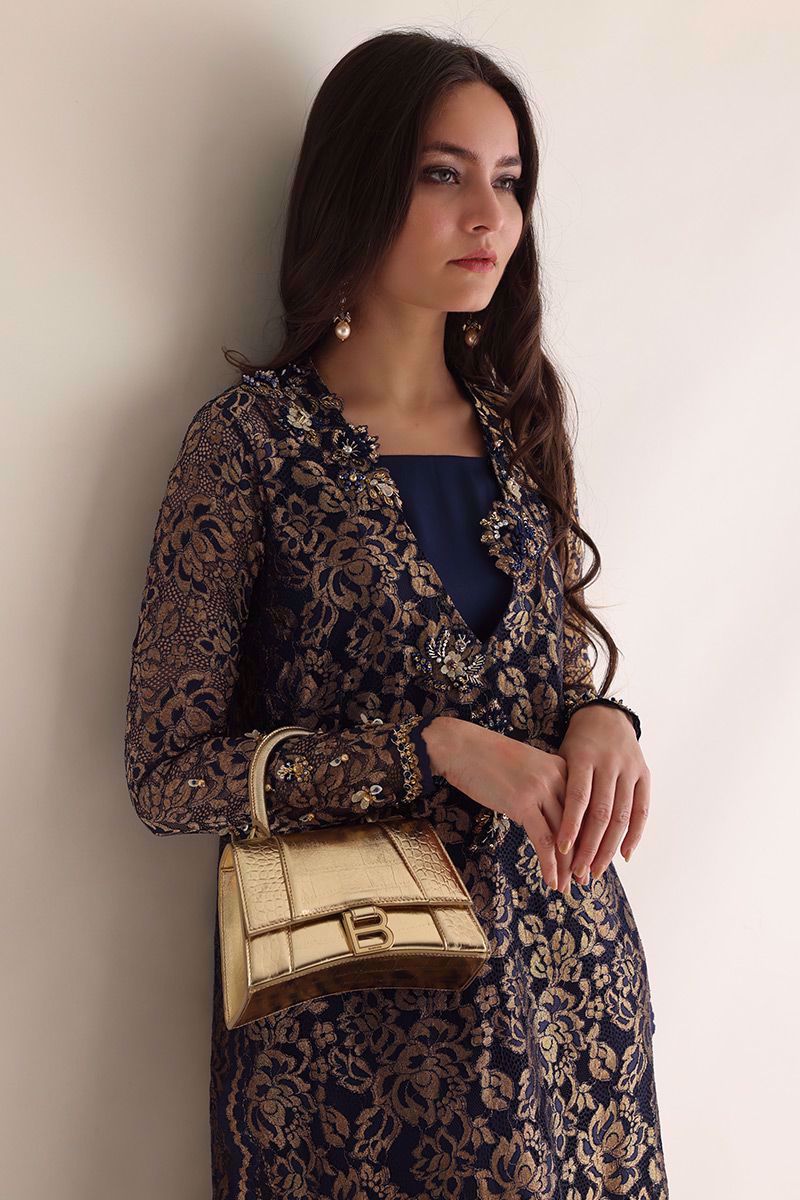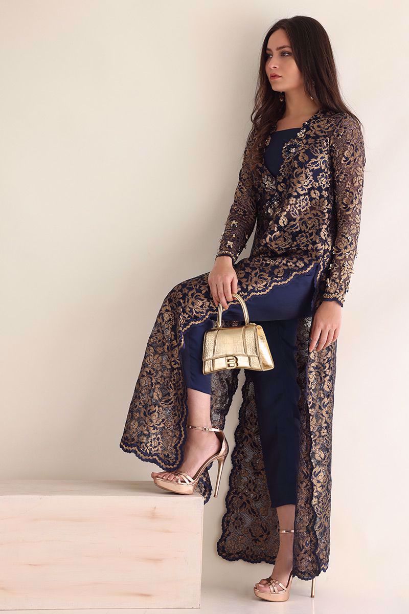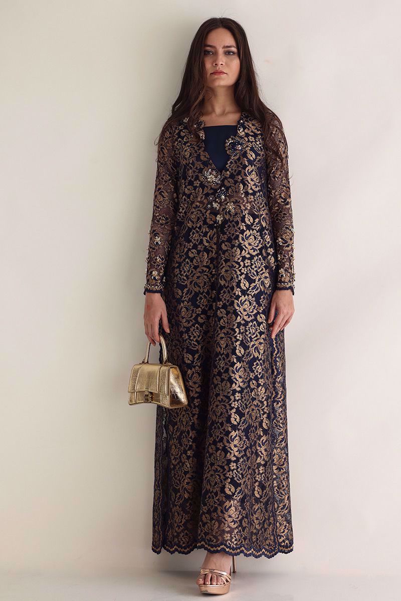Color: Navy Blue with Gold Fabric: Chantilly Work Details: Embellishment