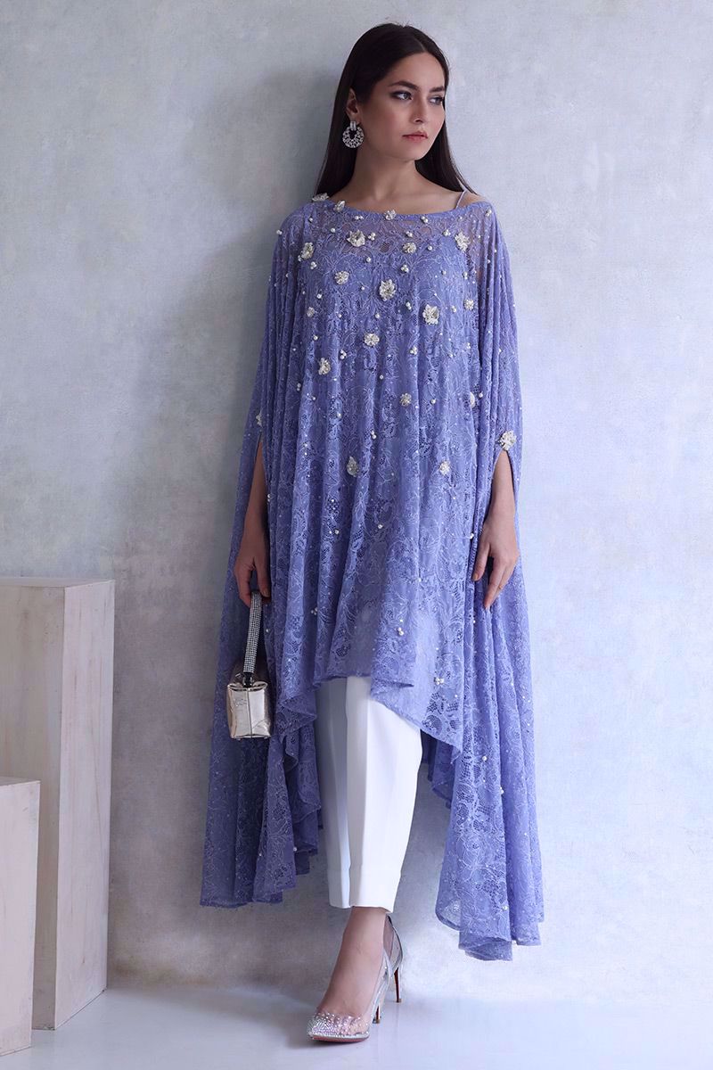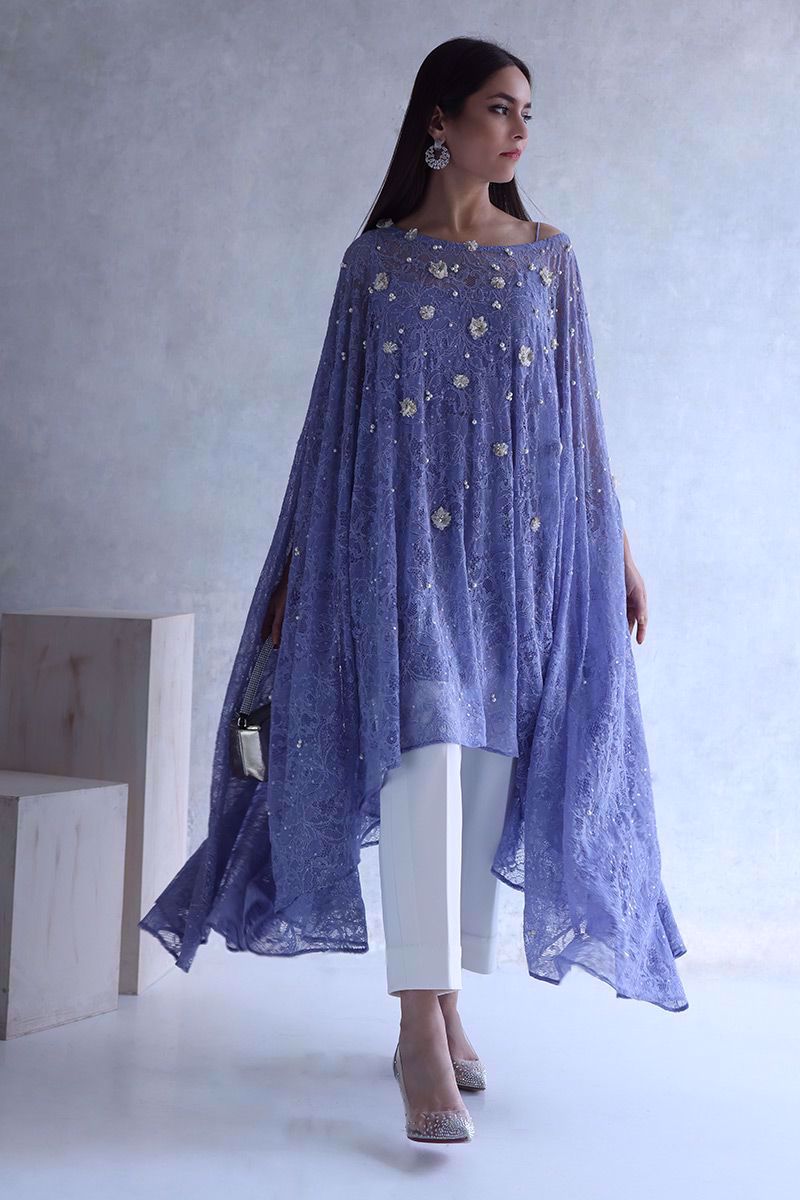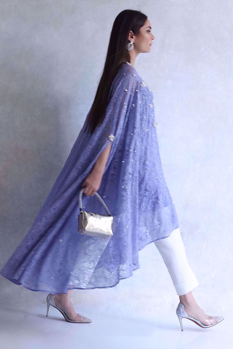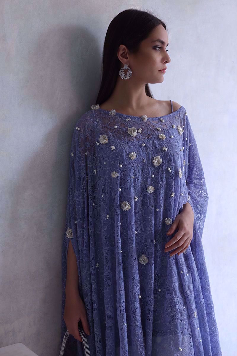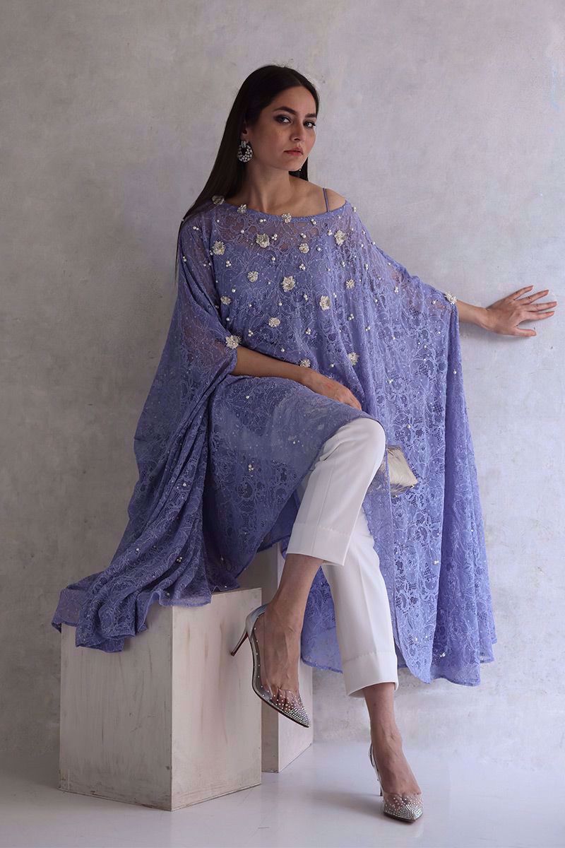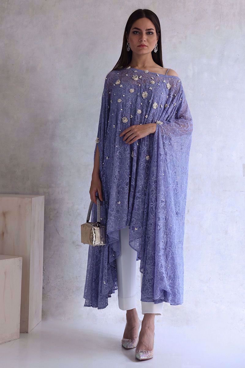 Aesthetically modern styled poncho, comprising of Chantilly lace fabric in sweet lavender color is scattered with handwork of pearls, naqshi, sequins, crystals, fabric petals and stones. This perfect summer ensemble is paired with ivory-coloured stretchable pants at additional cost. (Note: Off shoulder can be made into boat neck on demand)