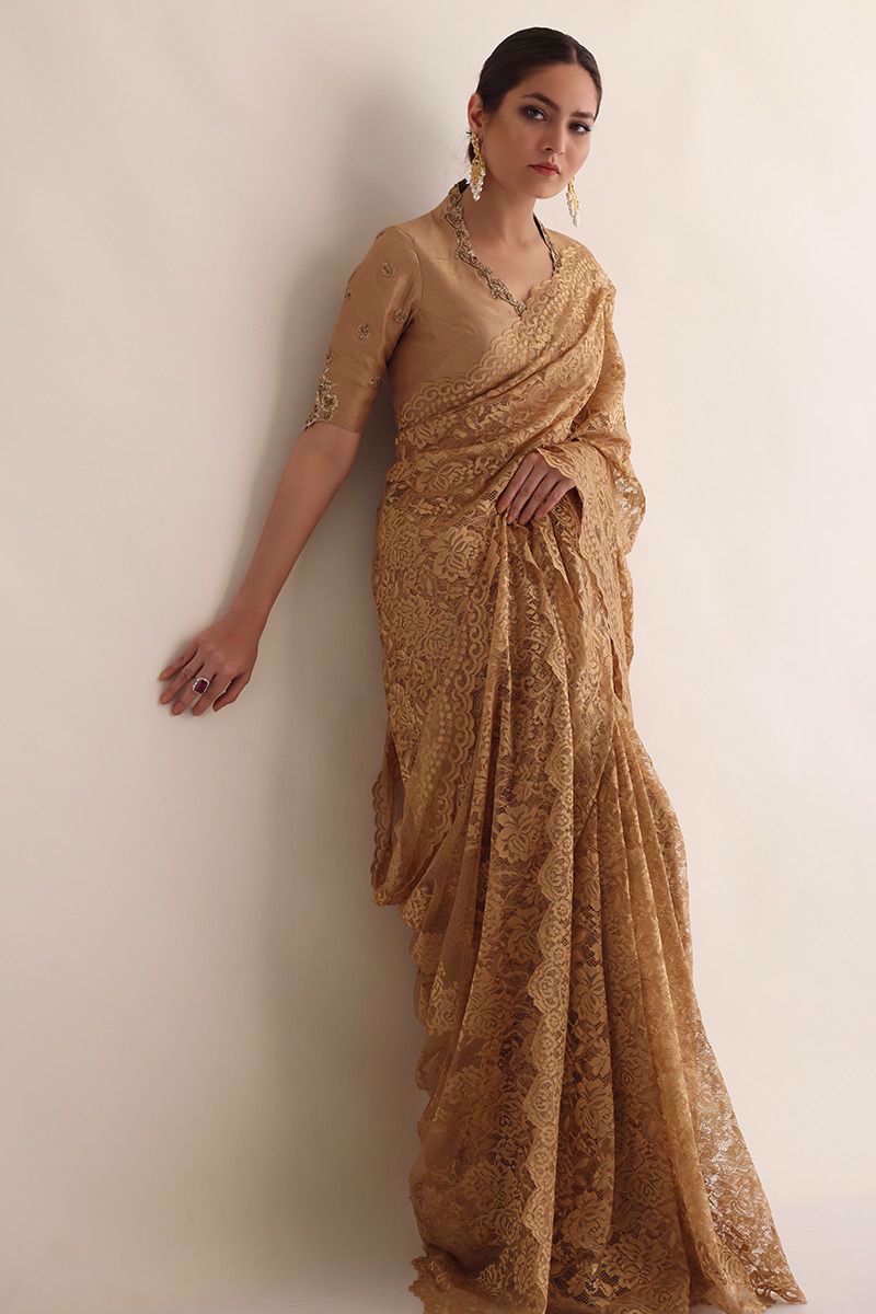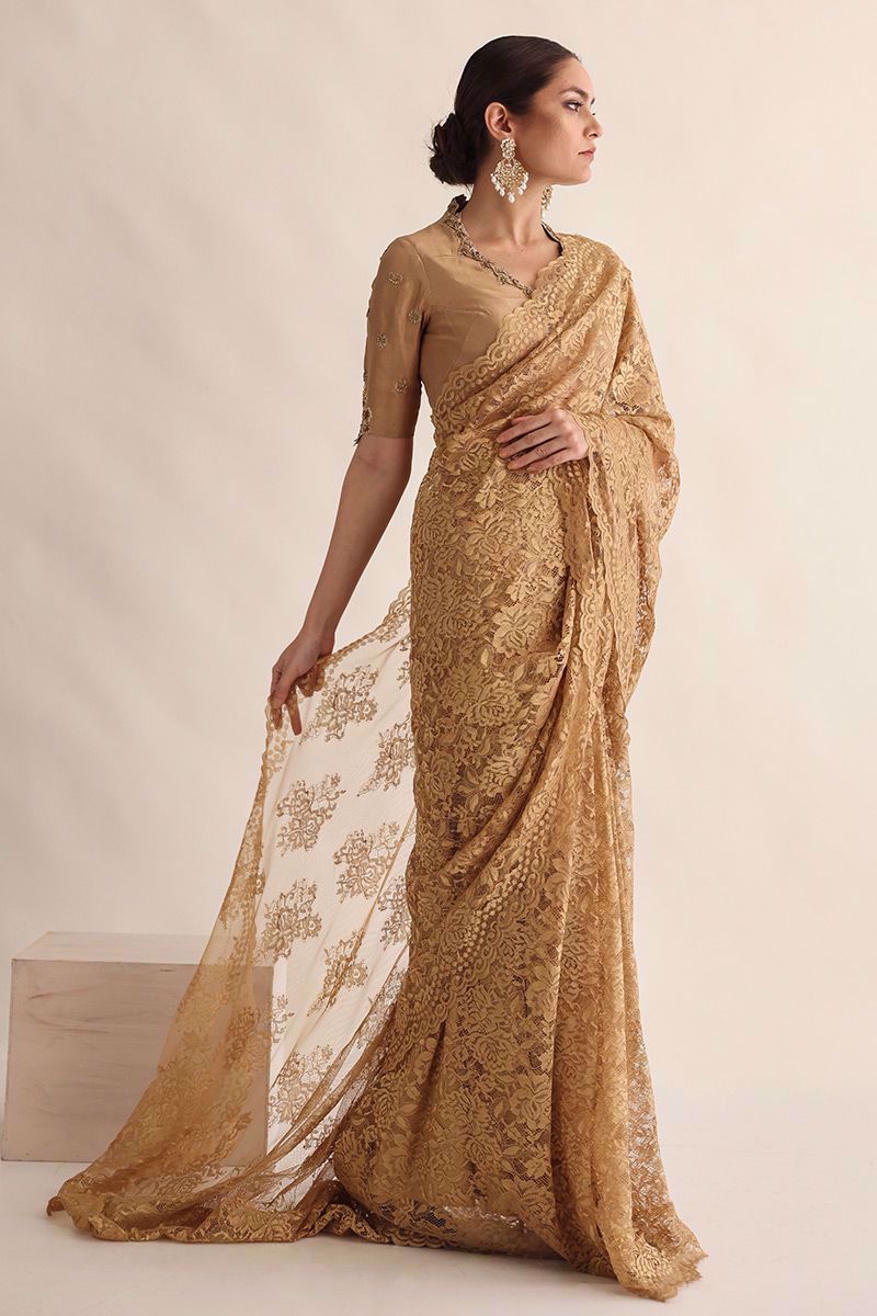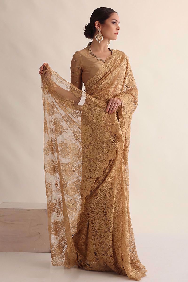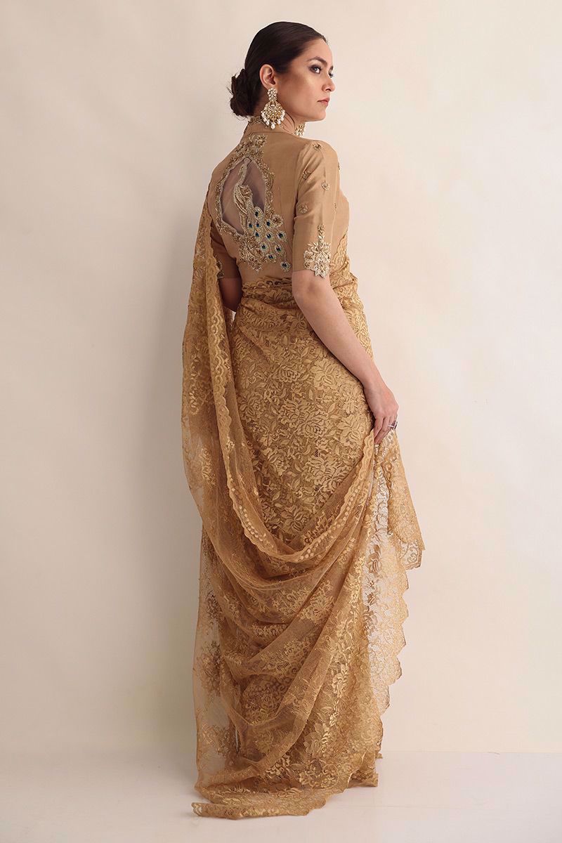 This six yards of splendour neutral gold Chantilly stitched saree with pure raw silk same coloured blouse, beautified with resham, zari, naqshi, dabka and tikki stones on sleeves, front neckline and back of the blouse is the perfect selection for any wedding event.
