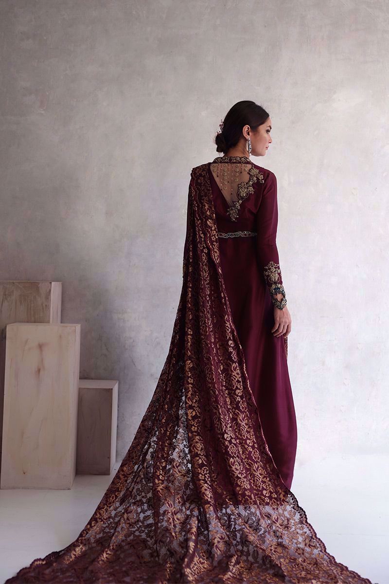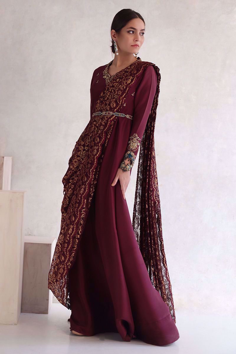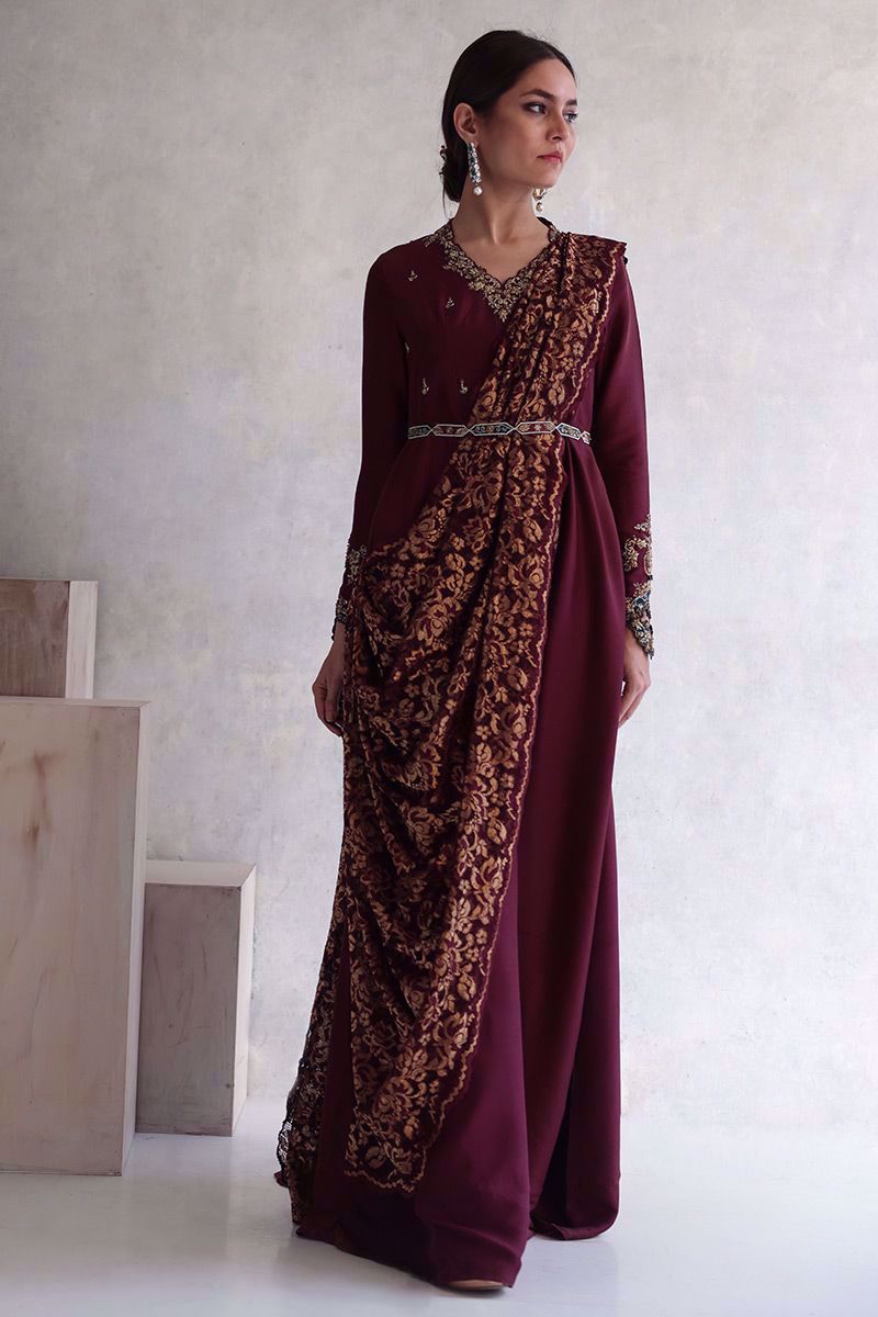 Royal plum and gold Chantilly saree drape style attached to pure raw silk bodice style floor length gown, hand crafted with intricate zardozi work consist of kora, dabka, naqshi, cut dana, zari, crystals, and tikki stones on front/back bodice and sleeves. To enhance the waist shape same theme worked belt has been provided.