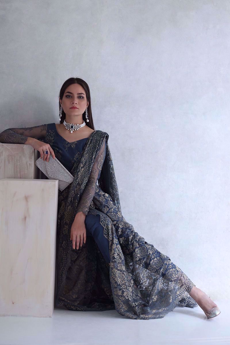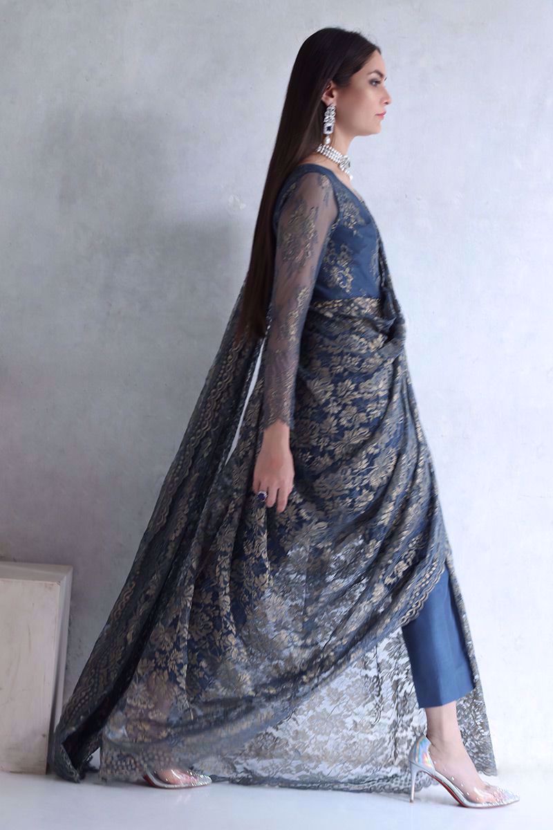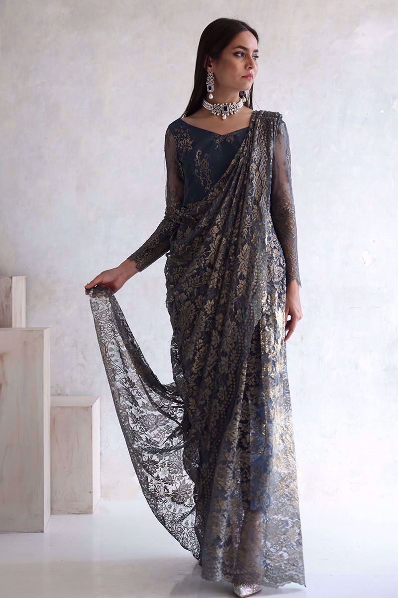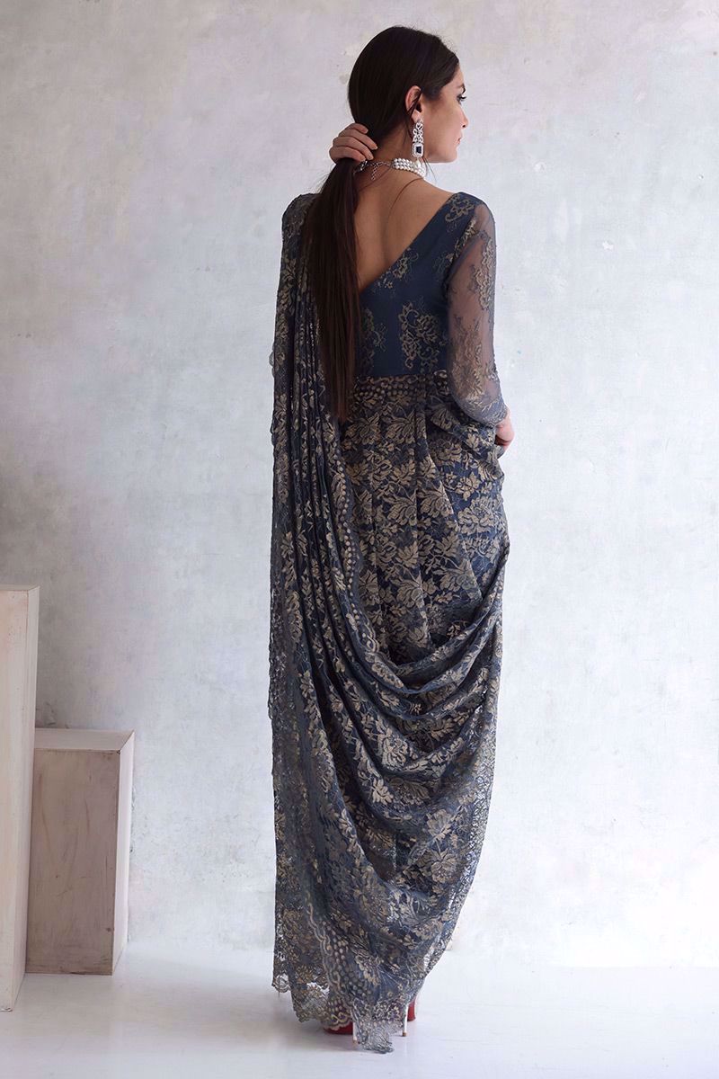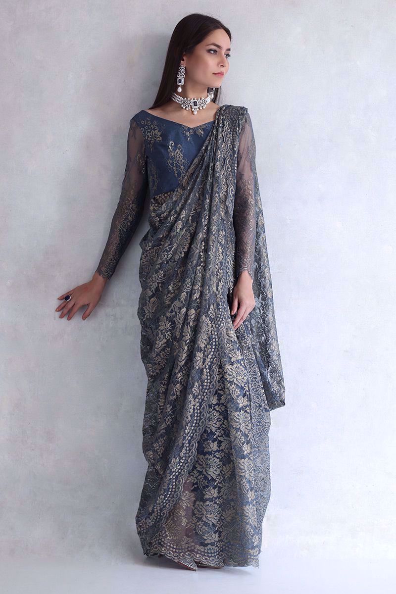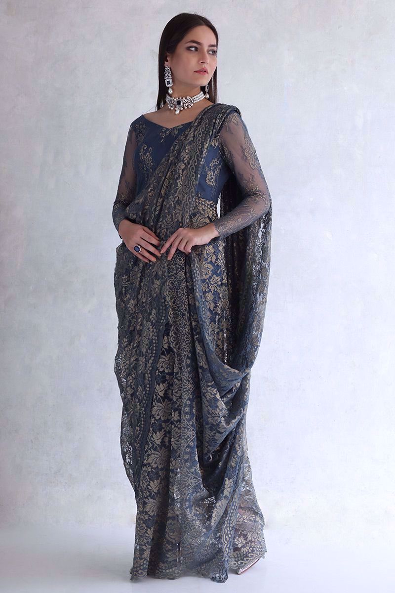 Metallic blue Chantilly saree gown with same color shimmer silk pants is the true example of elegance and class.