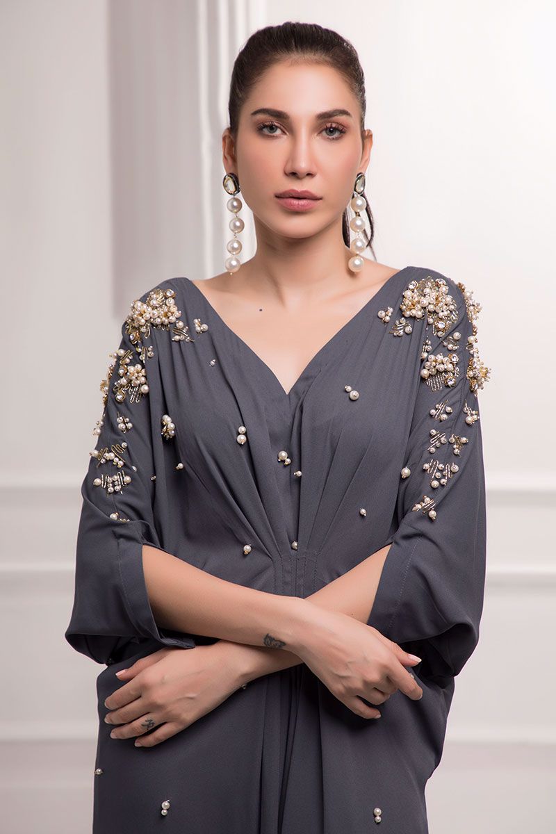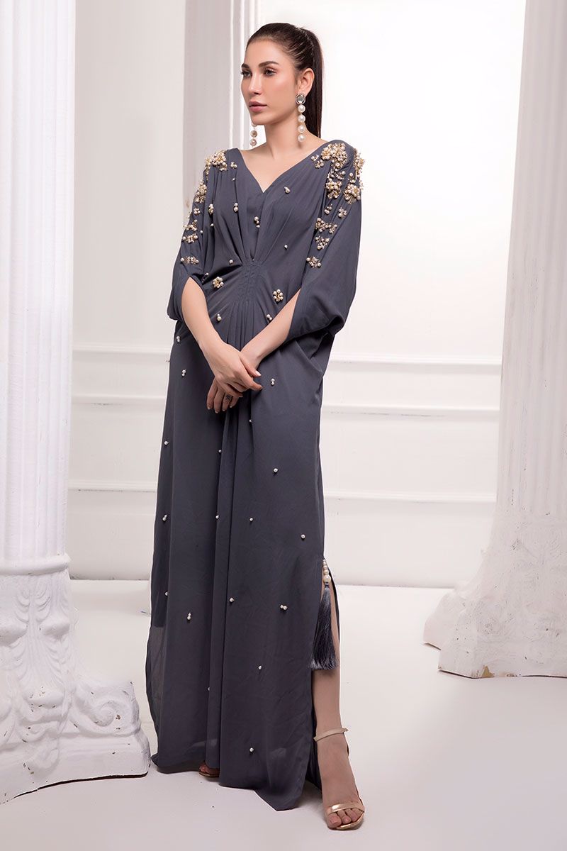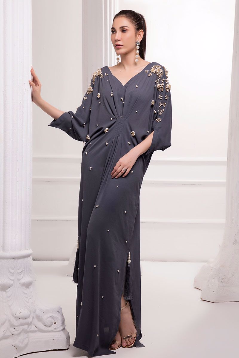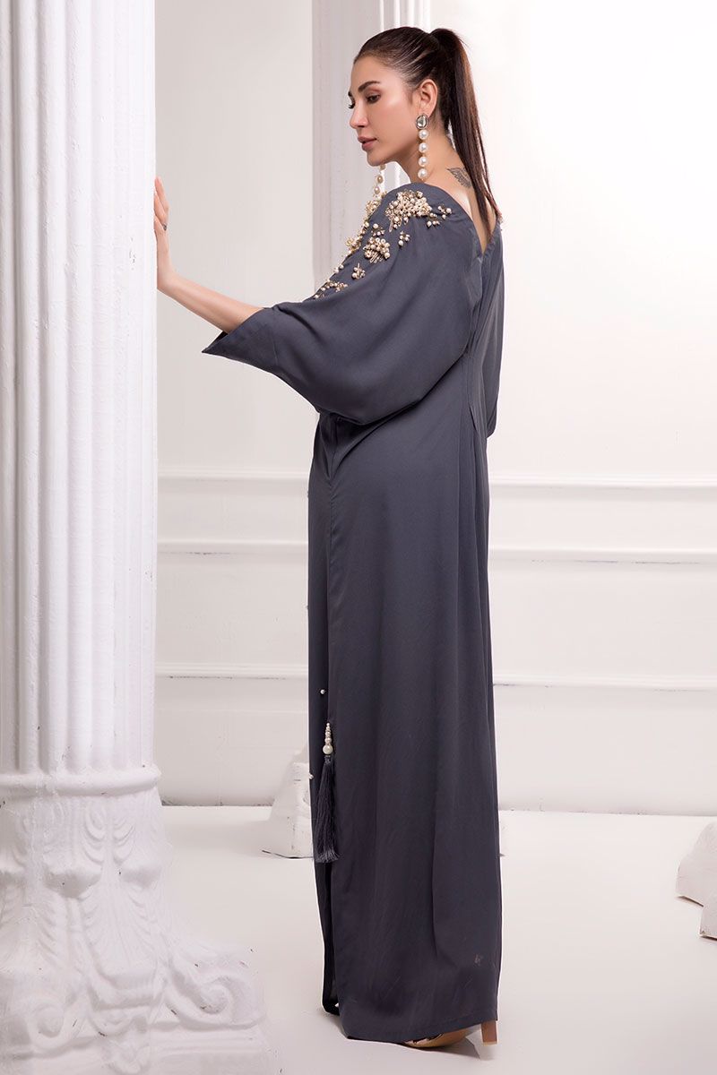 Incredible perfection in our double georgette Charcoal grey kaftan detailed with handwork cutdana crystals and beads.