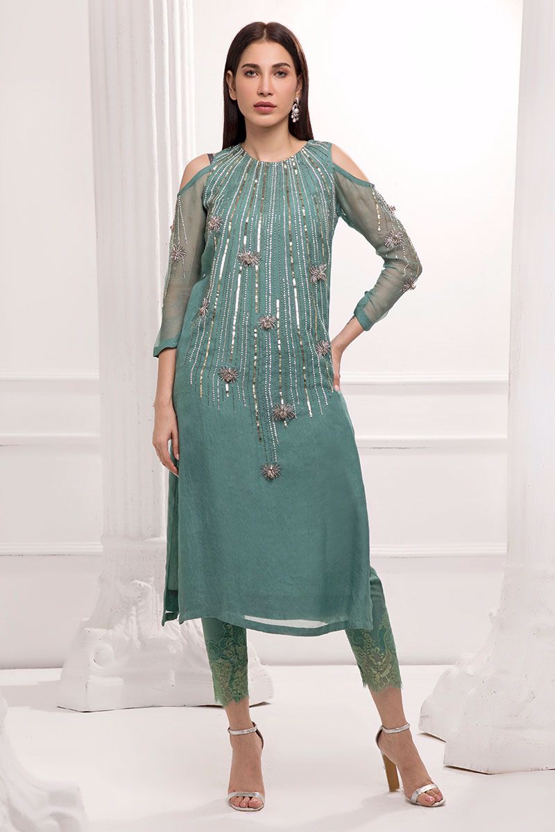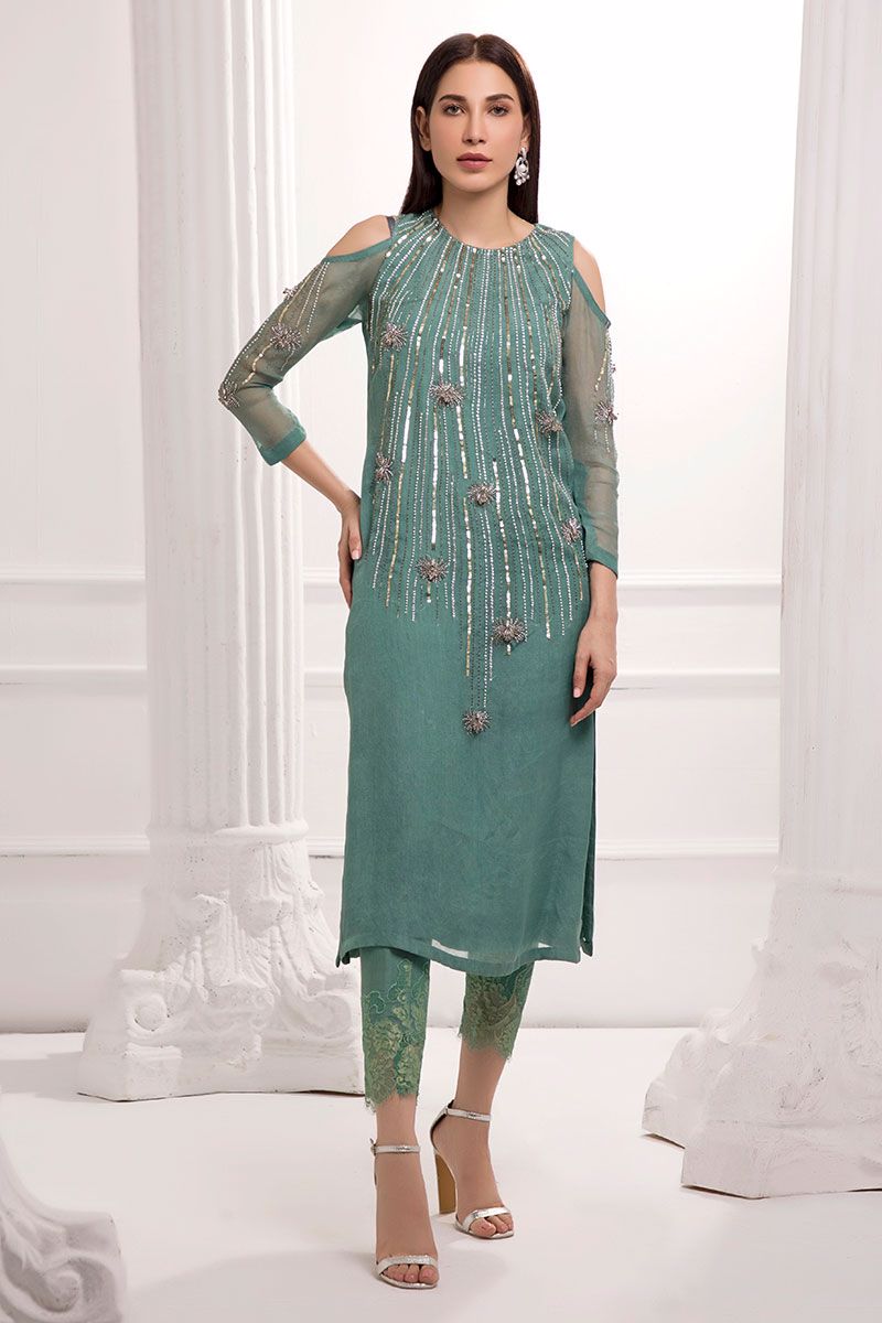 Personifying elegance in a handcrafted Wasabi green pure organza straight shirt, featuring swooning embellishments of pearls, sequins, crystals, cutdana, stones, and feathers. Straight pants with chantilly net detailing, can be bought separately to complete the look.