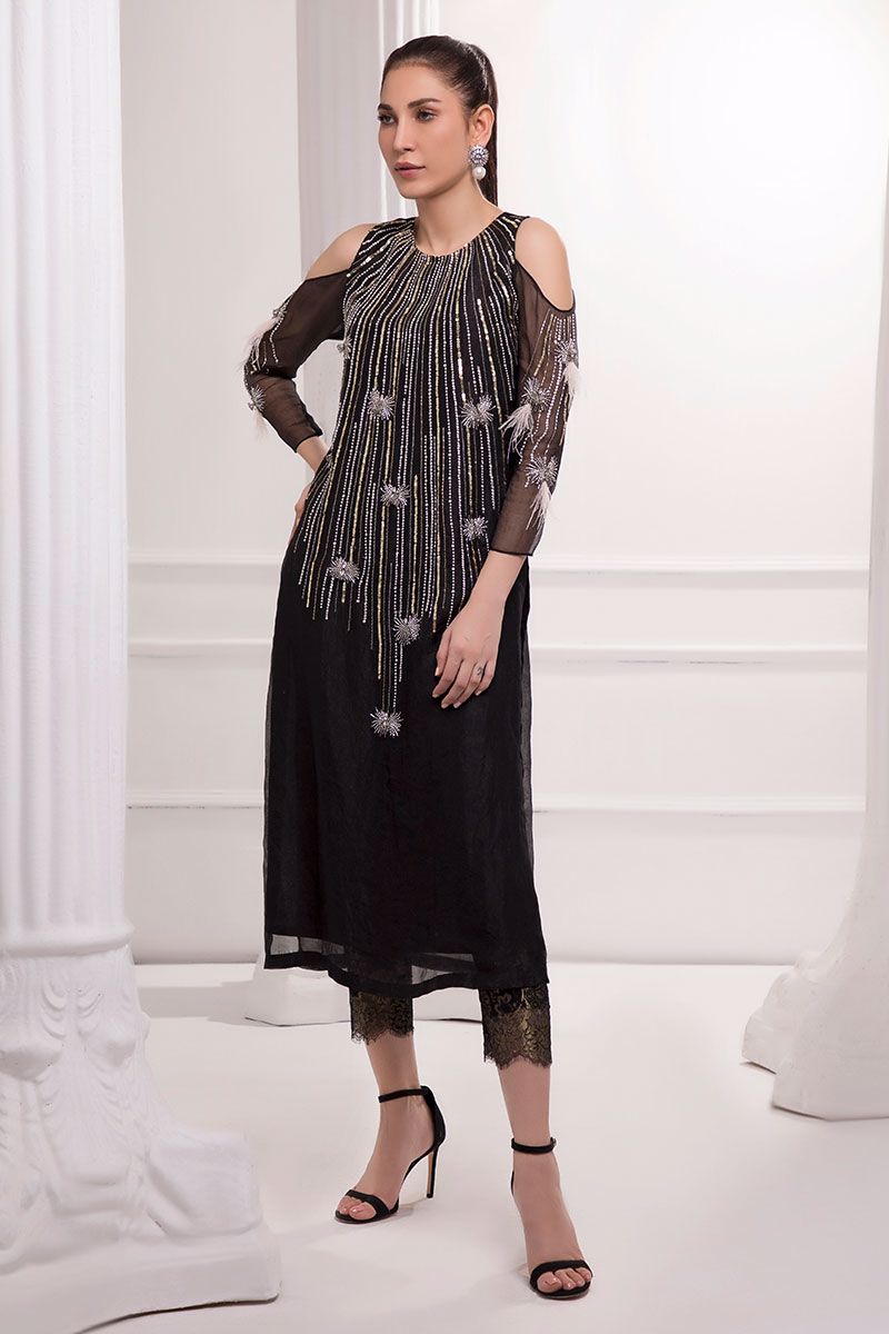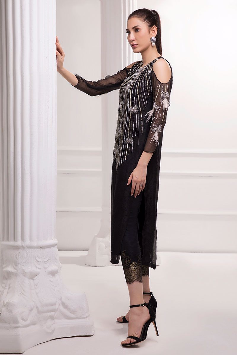 Personifying elegance a handcrafted black pure organza straight shirt, featuring swooning embellishments of pearls, sequins, crystals, cutdana, stones, and feathers. Straight pants with chantilly net detailing, can be bought separately to complete the look.