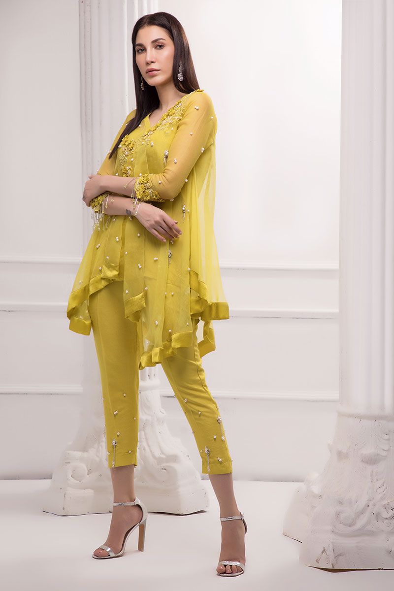 A timeless elegance in lime yellow organza Cape detailed with handwork, stones, pearls, cutdana, crystals and beads. Slip included. Same color embellished Pants can be bought separately to complete the look.