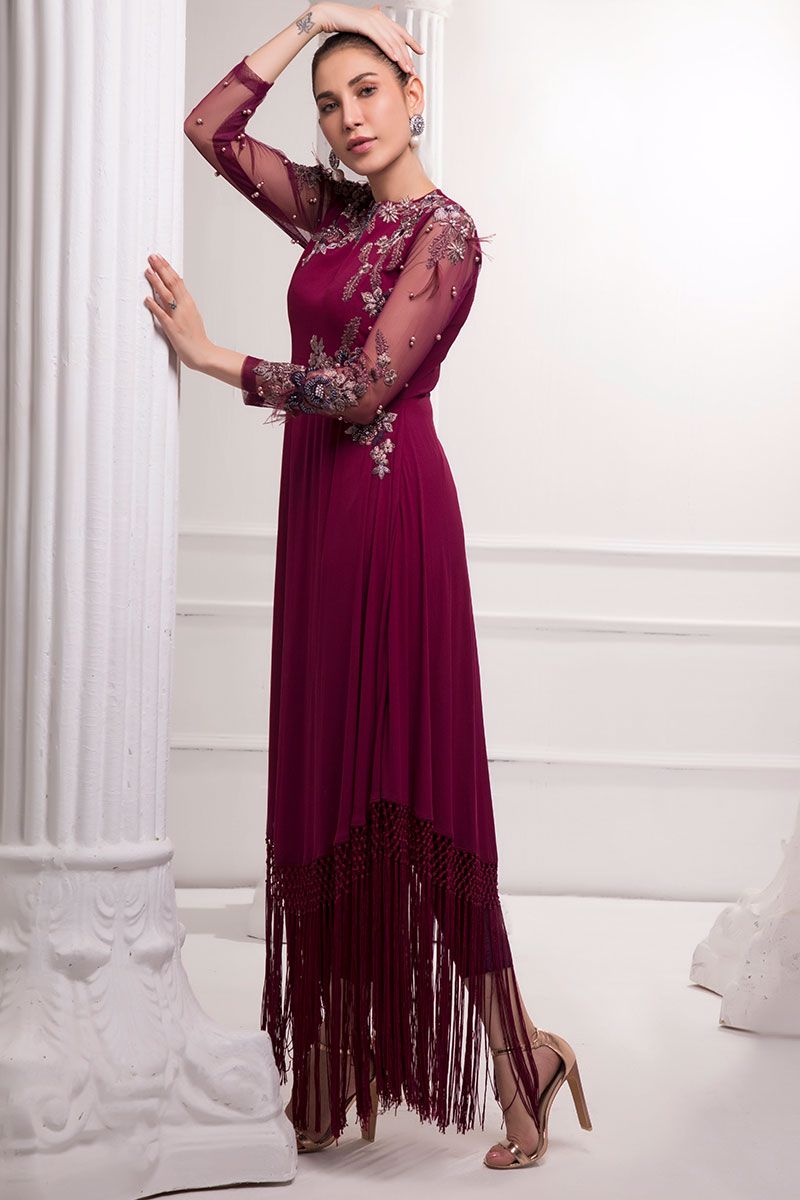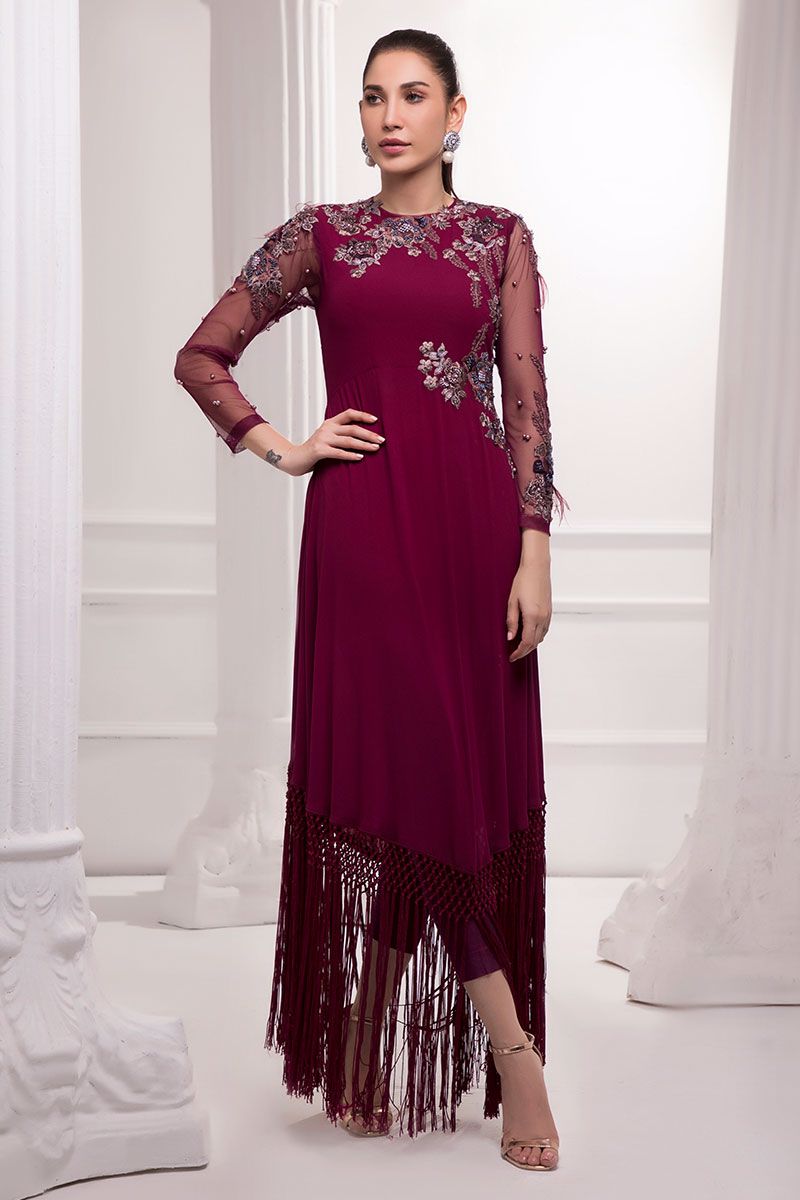 Radiate effortless poise in maroon double georgette top detailed with elegant handwork, stones, pearls, and feathers. Finished with tassels at the hem. Same color pants can be bought separately.