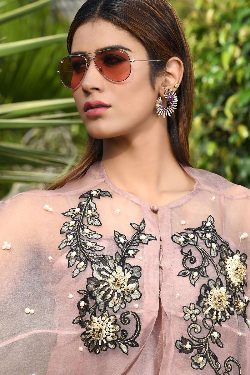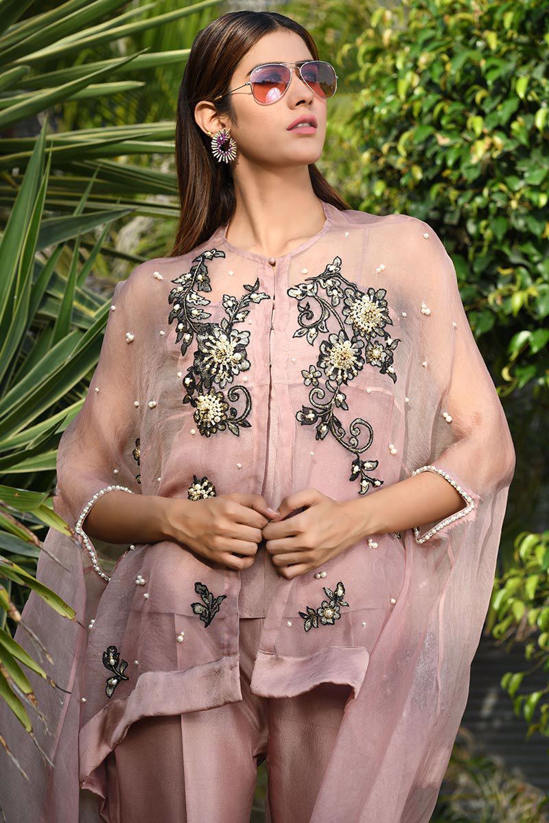 The vivacious crimson nude pink pure organza asymmetrical Cape features floral motifs with accents of pearls, cutdana, stones, crystals, sequins and beads. Slip included. Bootlegs can be bought separately.