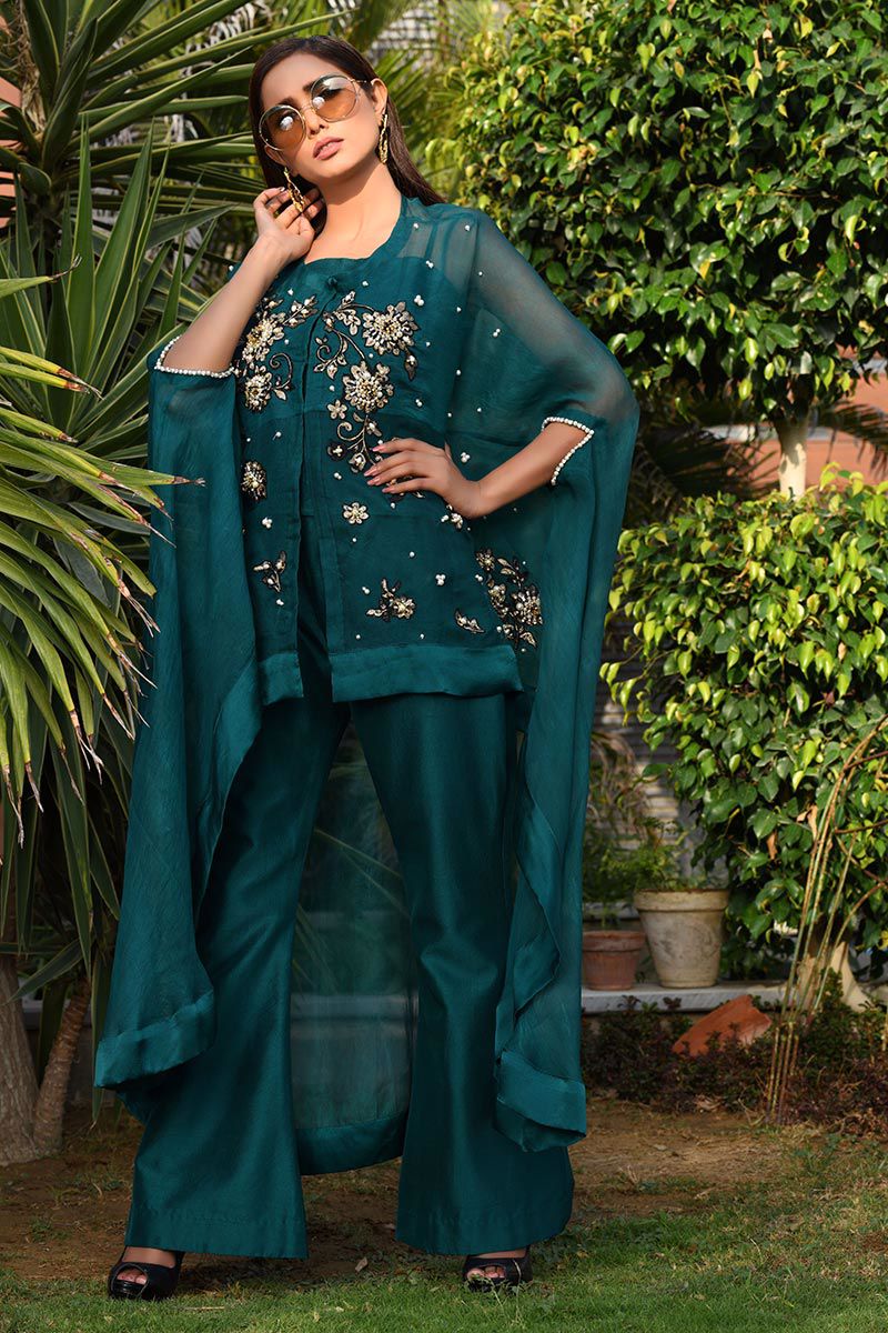 The vivacious emerald green organza asymmetrical cape features floral motifs with accents of pearls, cutdana, stones, crystals, sequins and beads. Slip included. Bootlegs can be bought separately to complete the look.