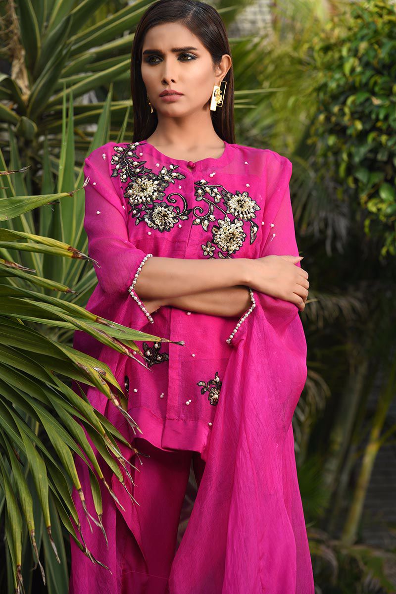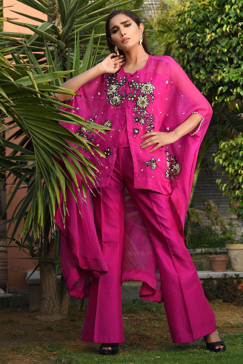 The vivacious crimson hot pink pure organza asymmetrical Cape features floral motifs with accents of pearls, cutdana, stones, crystals, sequins and beads. Slip included. Bootlegs can be bought separately.